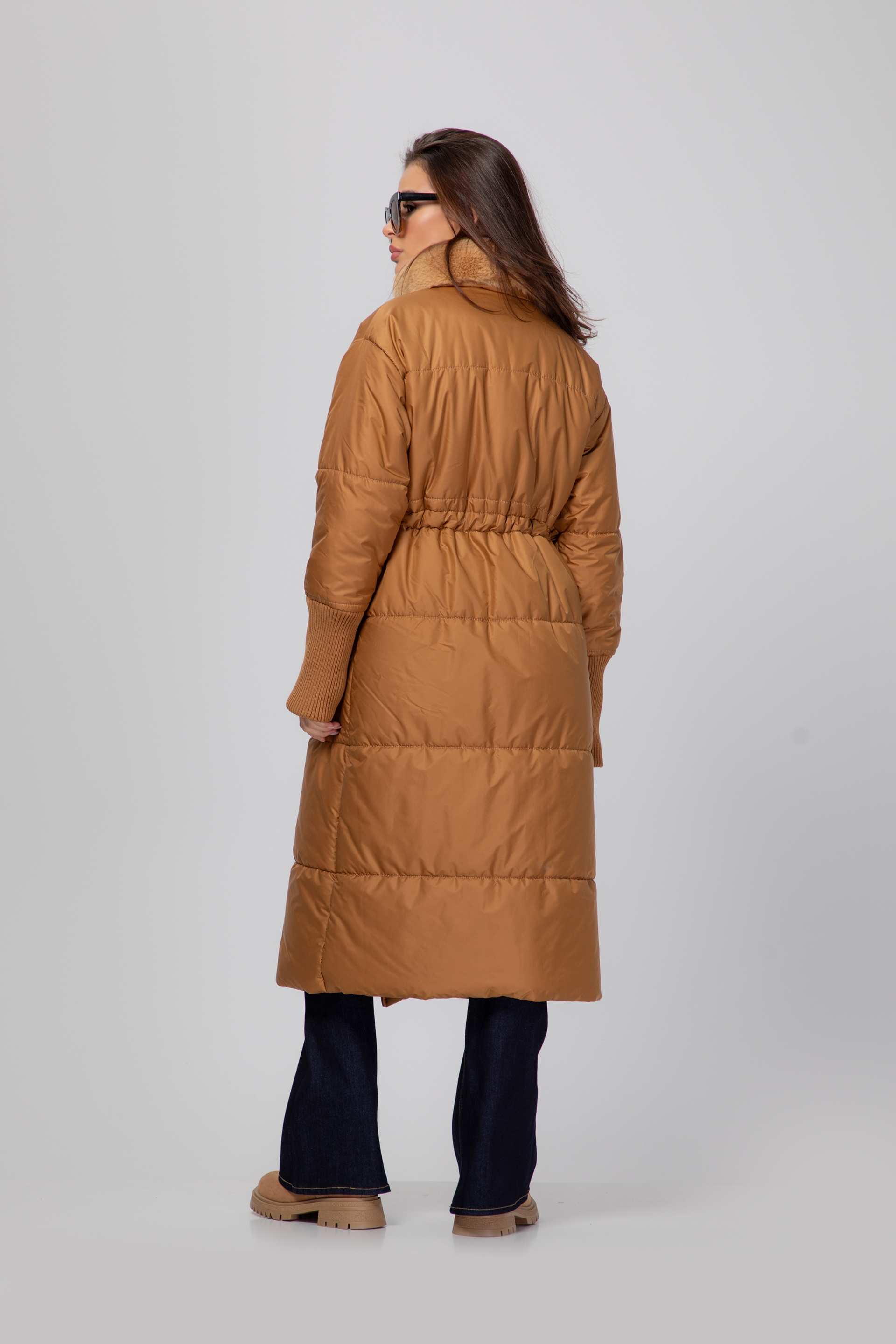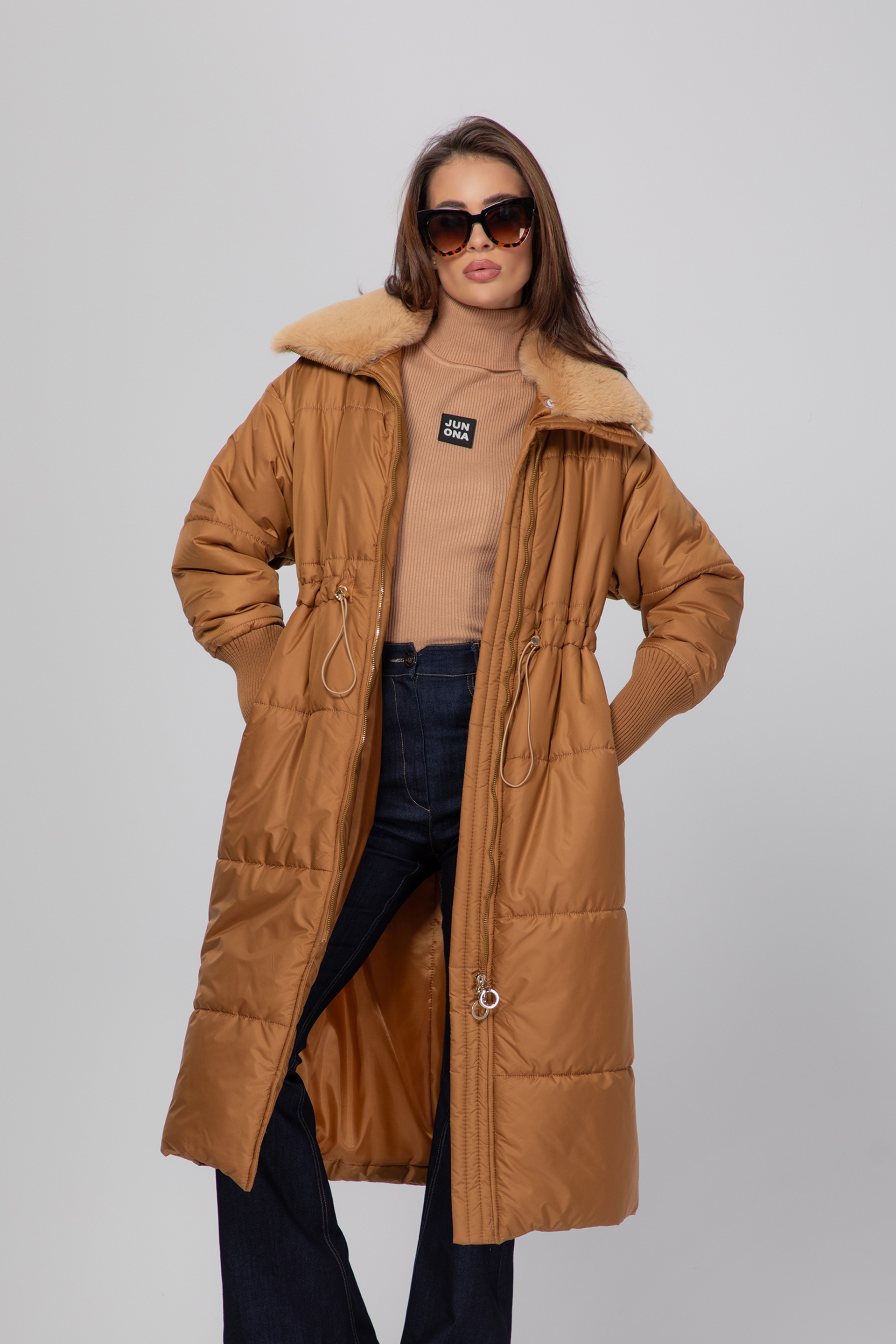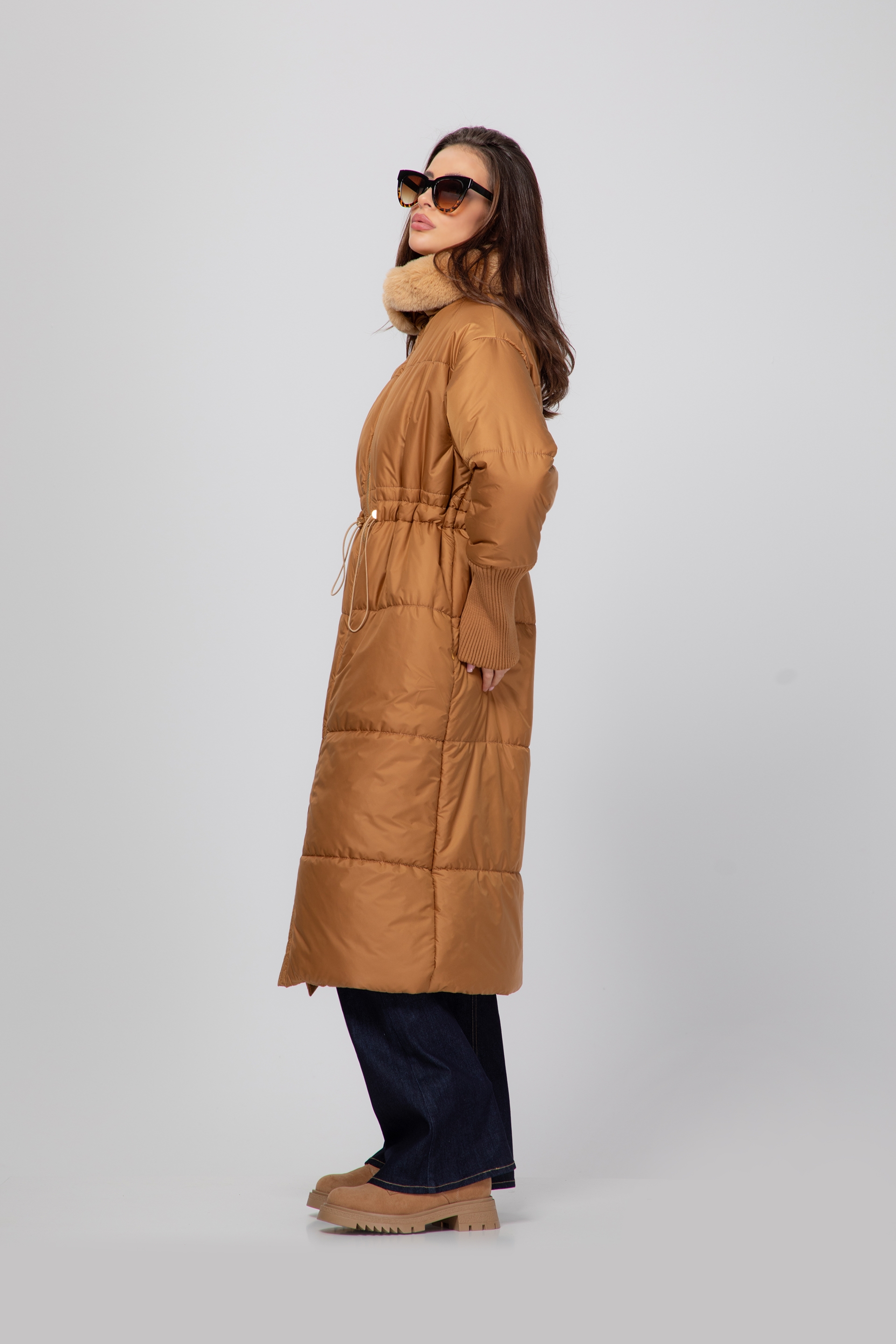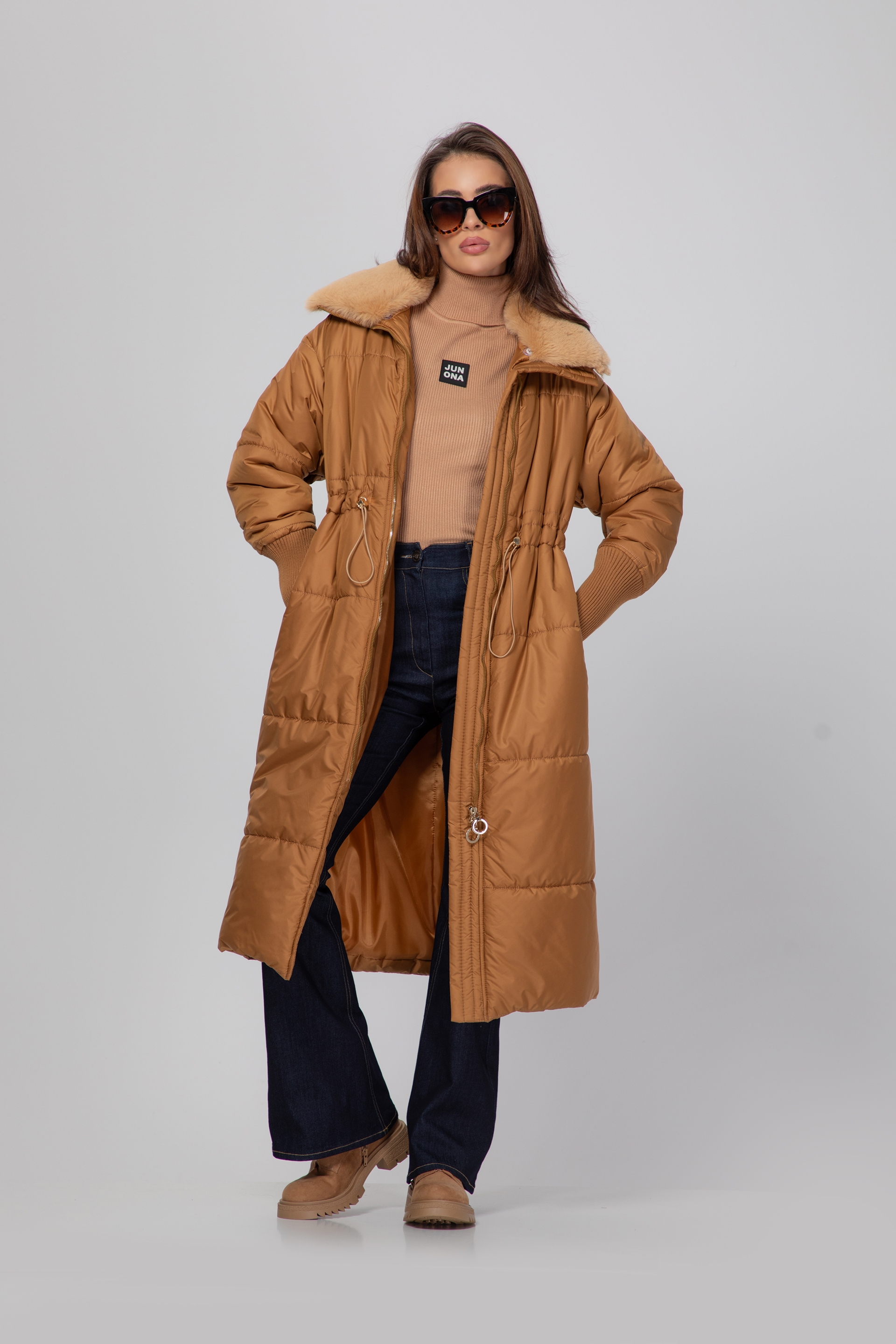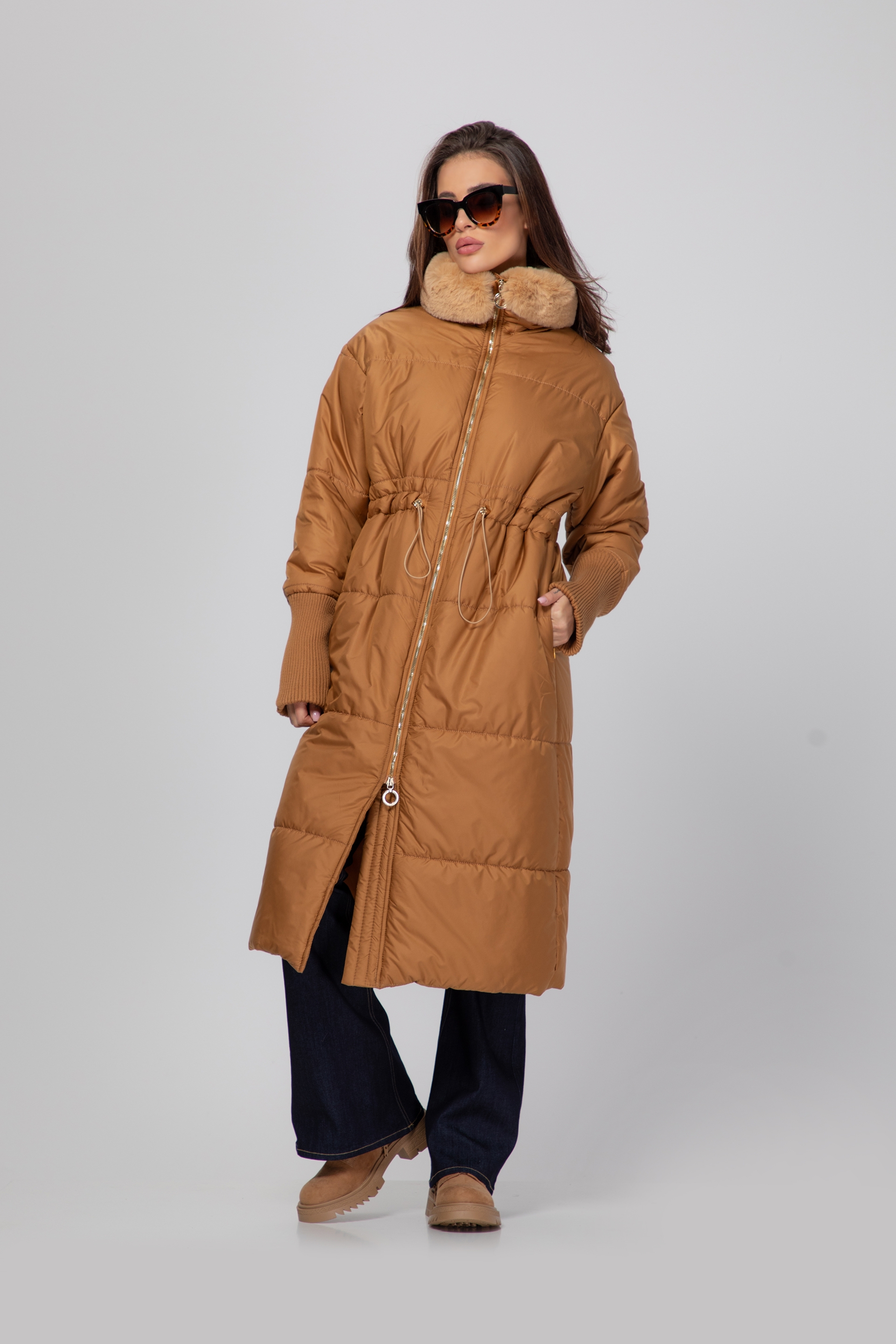 Описание: Яке с дълга кройка, падаща елегантно под коляното. Закопчава се с цип, а в областта на талията има регулируема ластична връзка, която подчертава фигурата и придава комфорт.