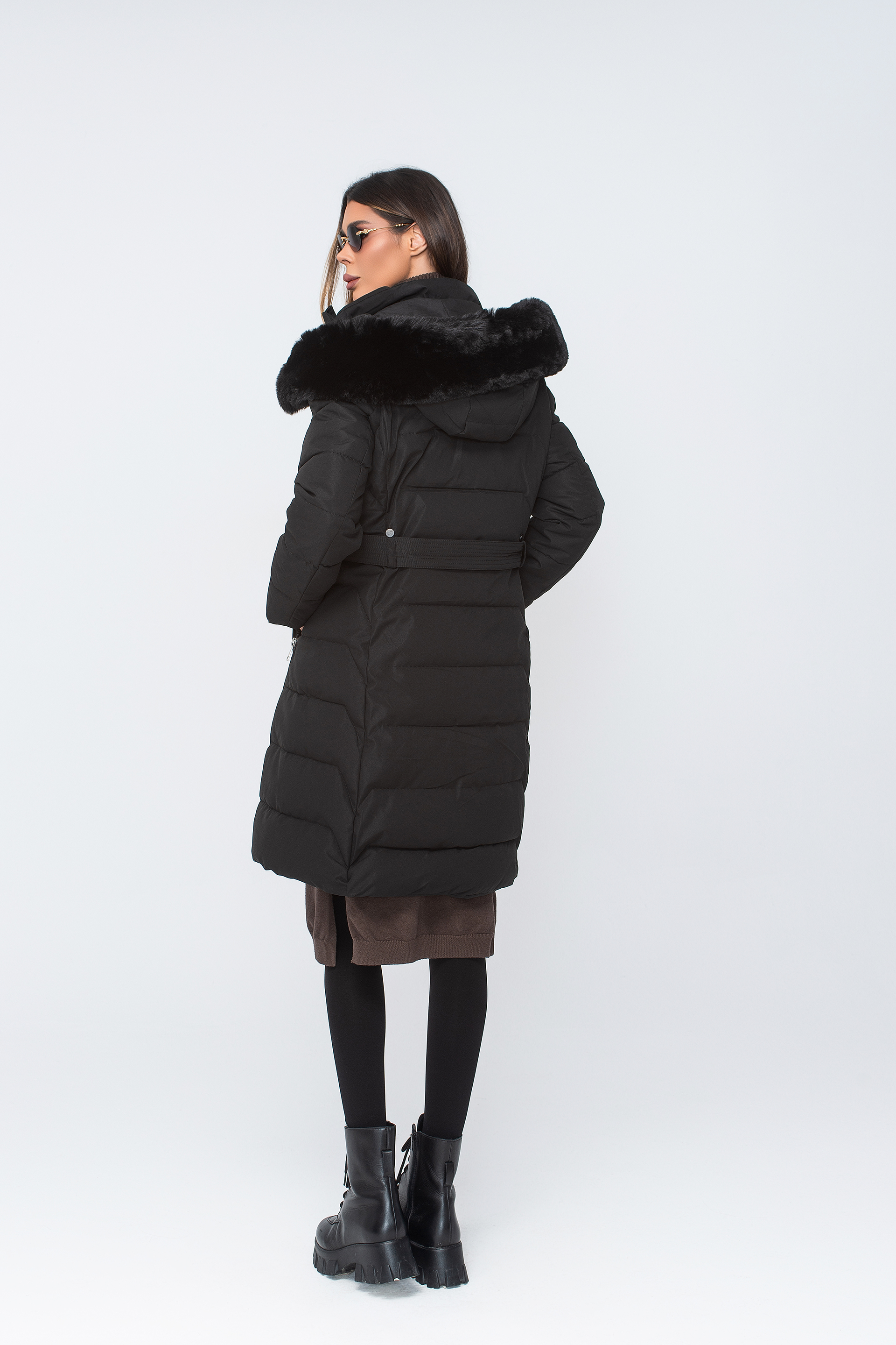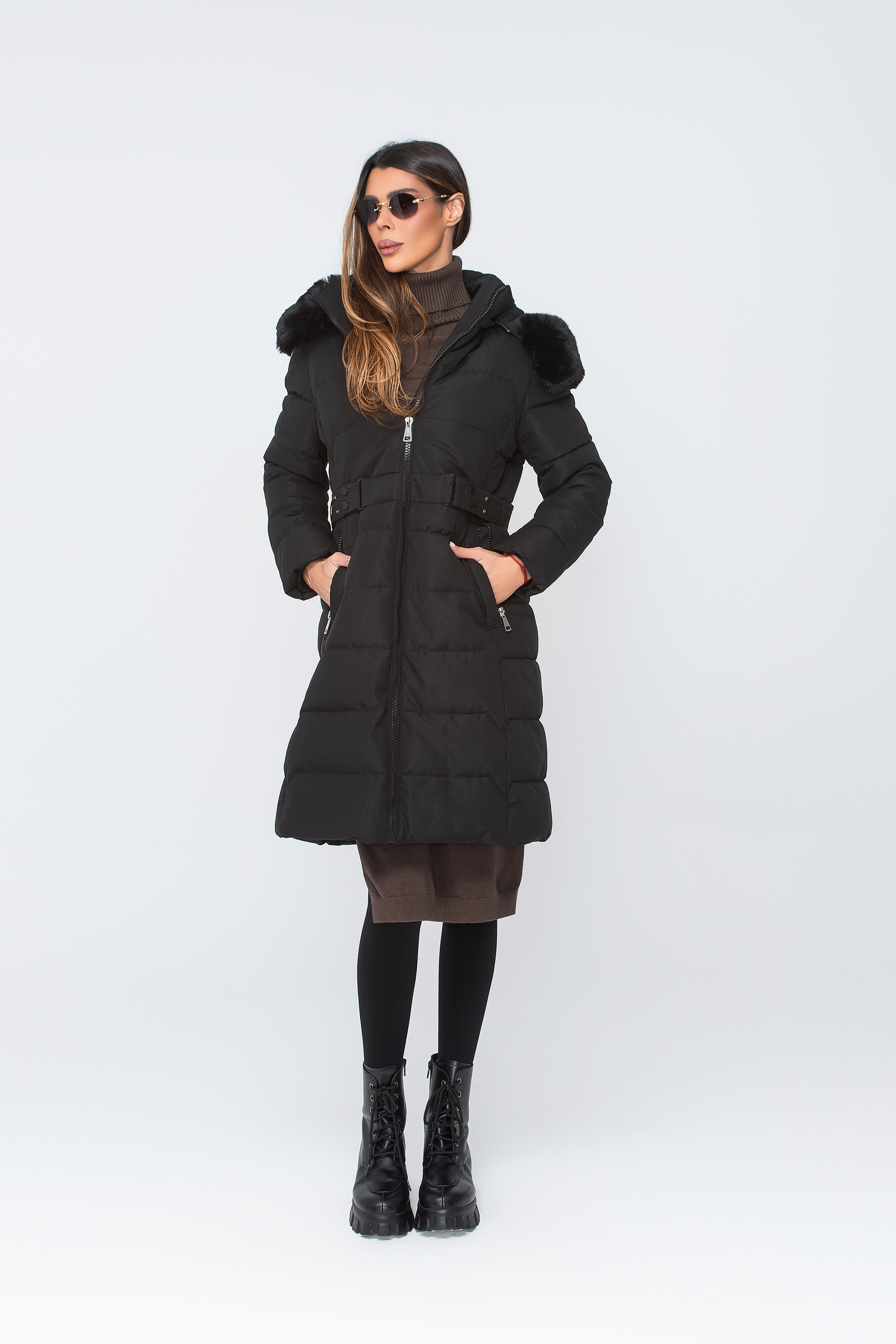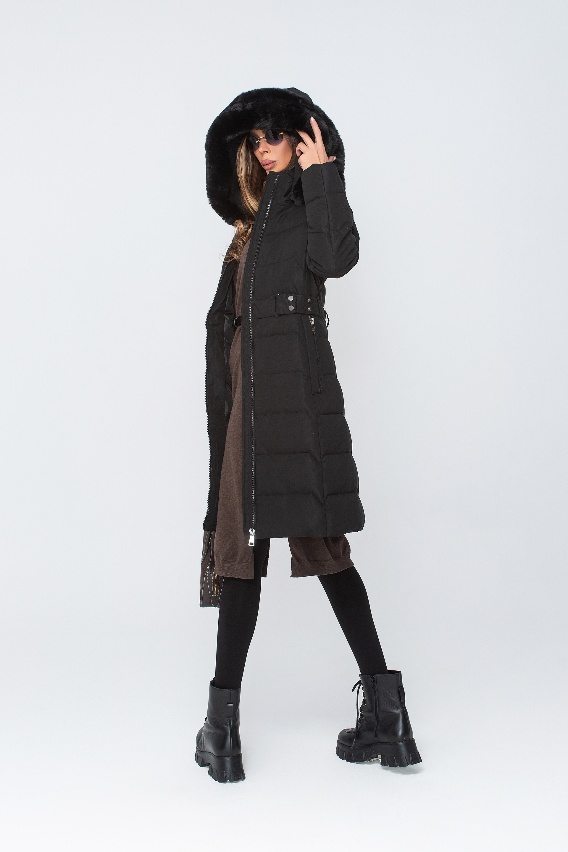 Описание: Капитонирано, ватирано дълго яке от водоотблъскваща, ветроустойчива материя. Със свободна кройка, двупосочен цип на предницата и подвижна качулка с косъм. Странични джобове и колан с копчета за регулиране на талията.