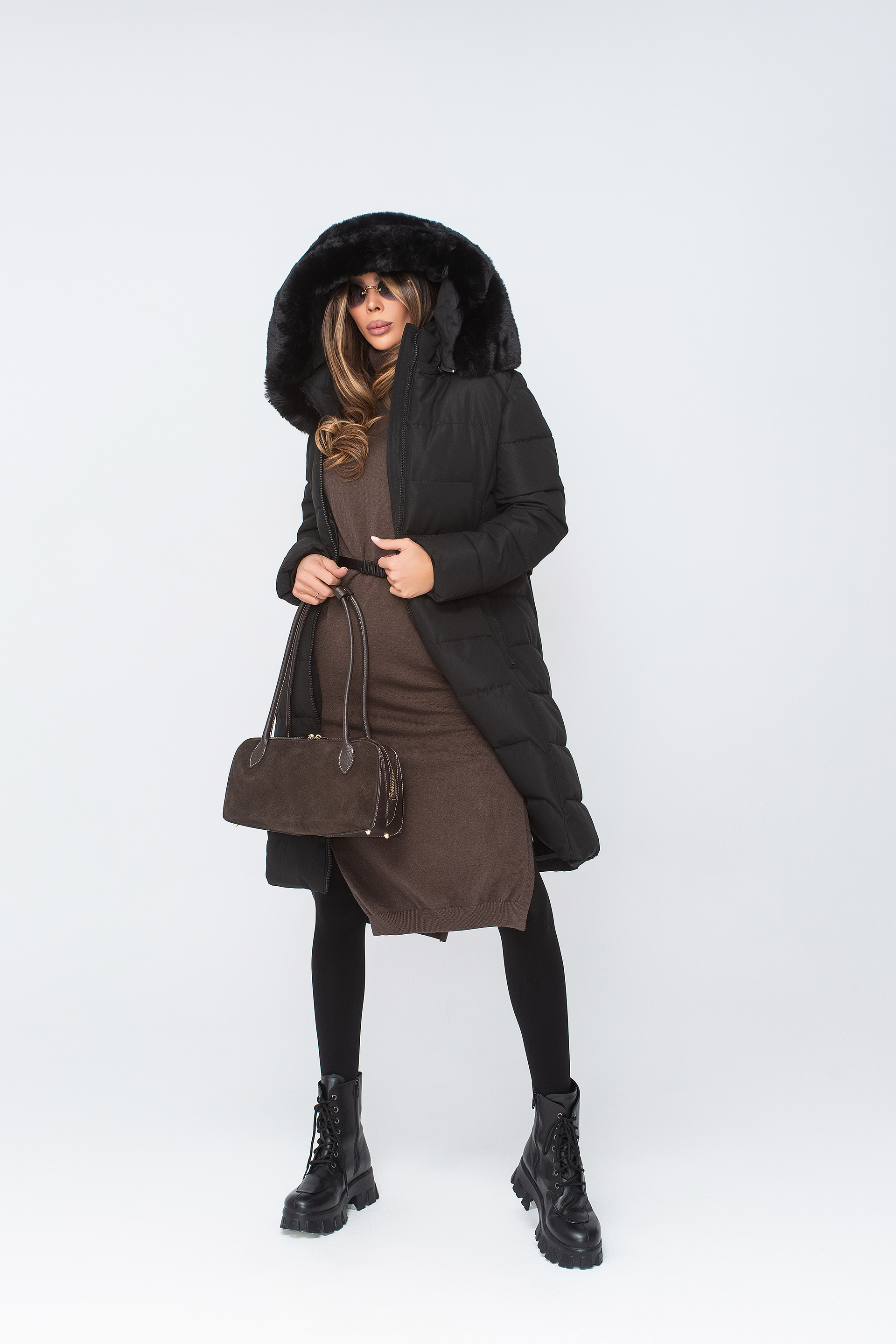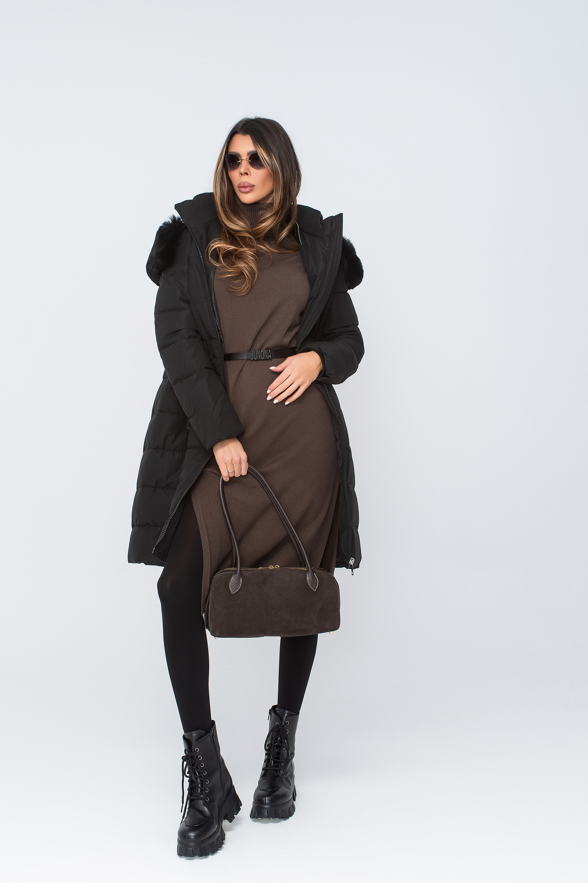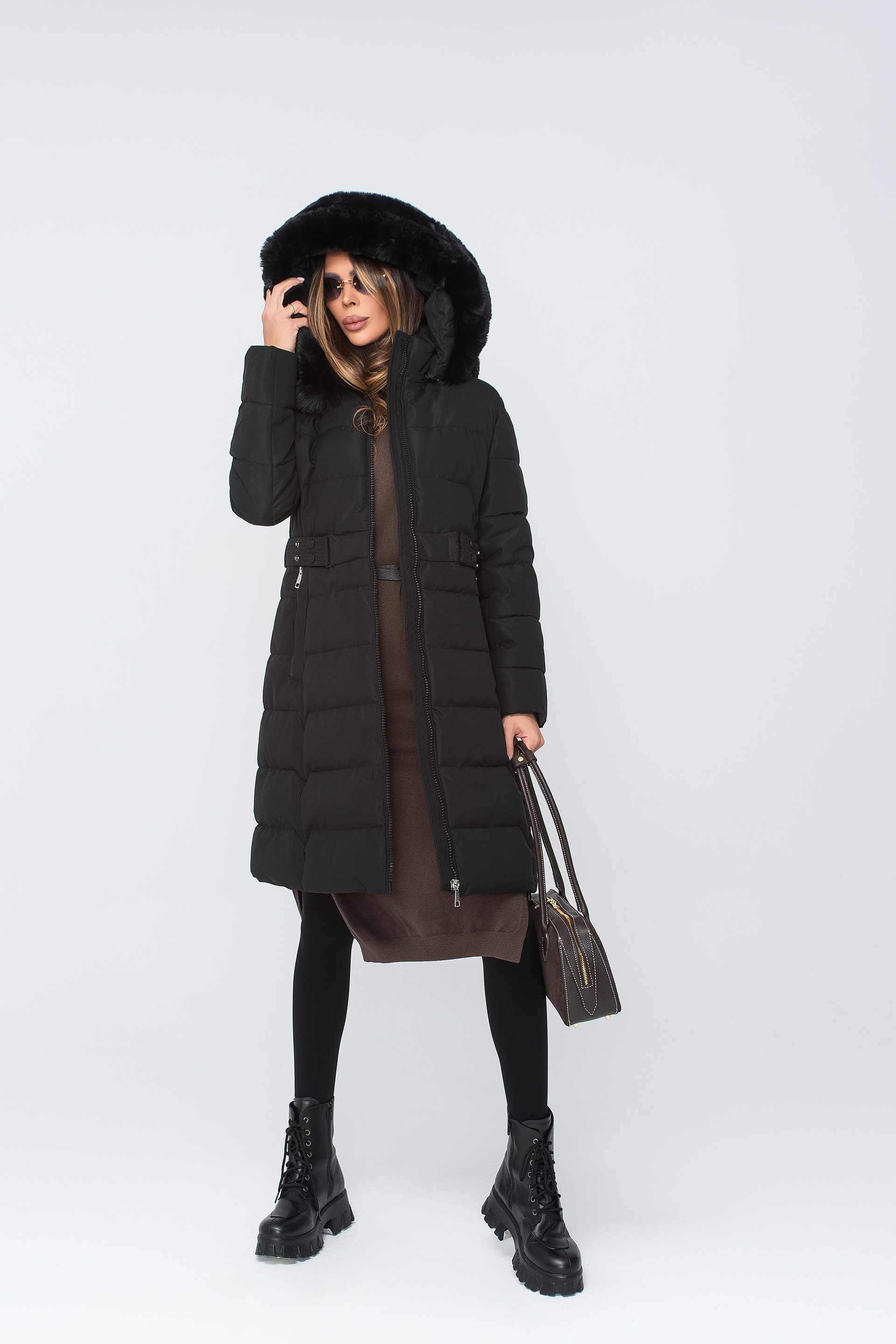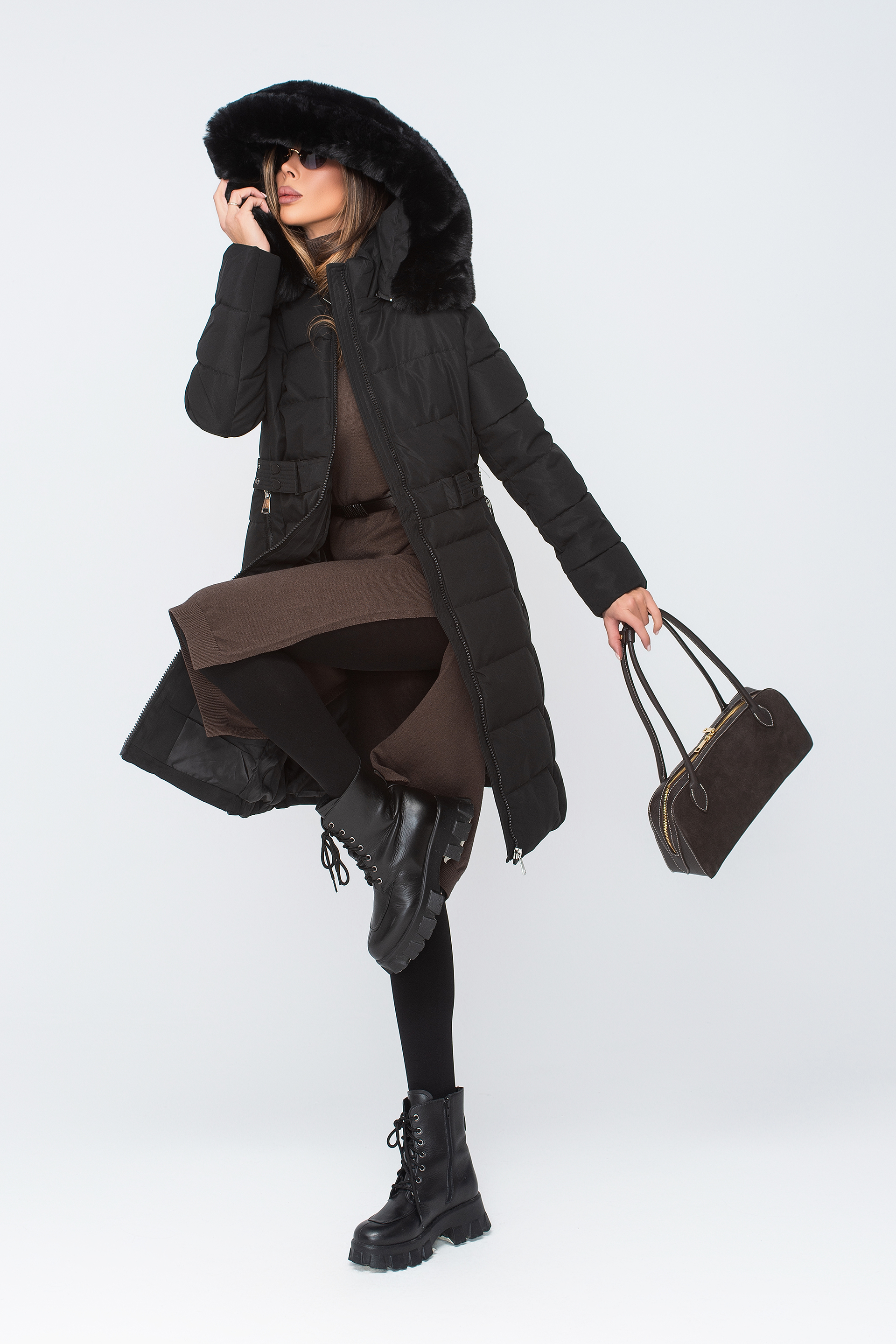Описание: Капитонирано, ватирано дълго яке от водоотблъскваща, ветроустойчива материя. Със свободна кройка, двупосочен цип на предницата и подвижна качулка с косъм. Странични джобове и колан с копчета за регулиране на талията.