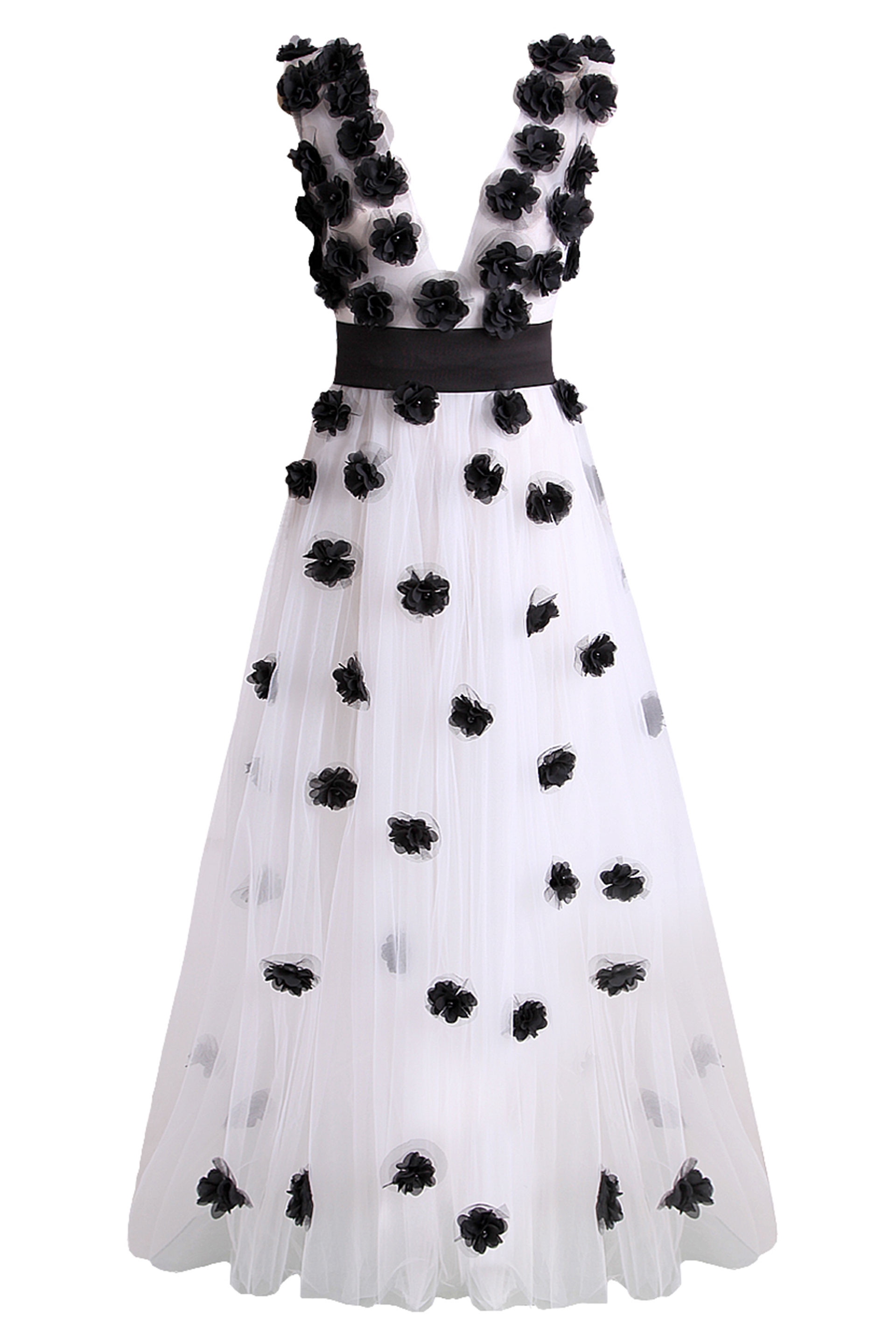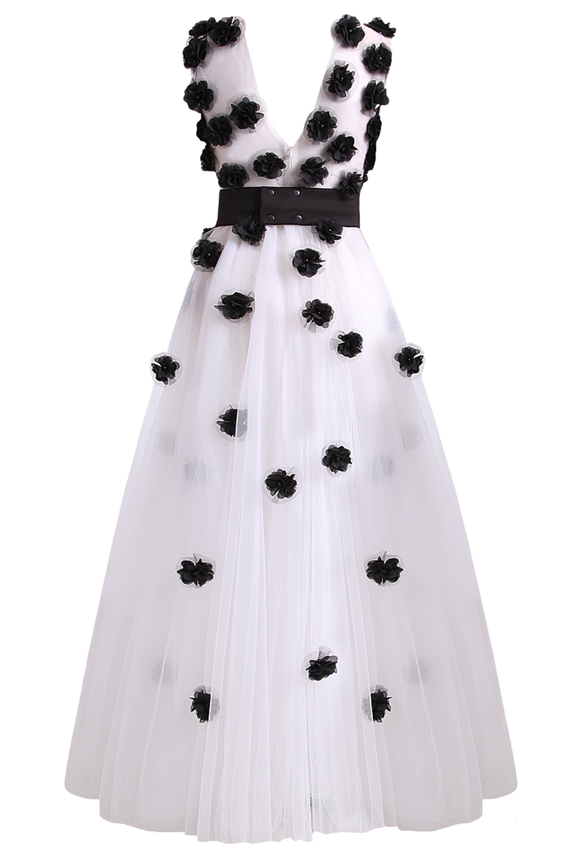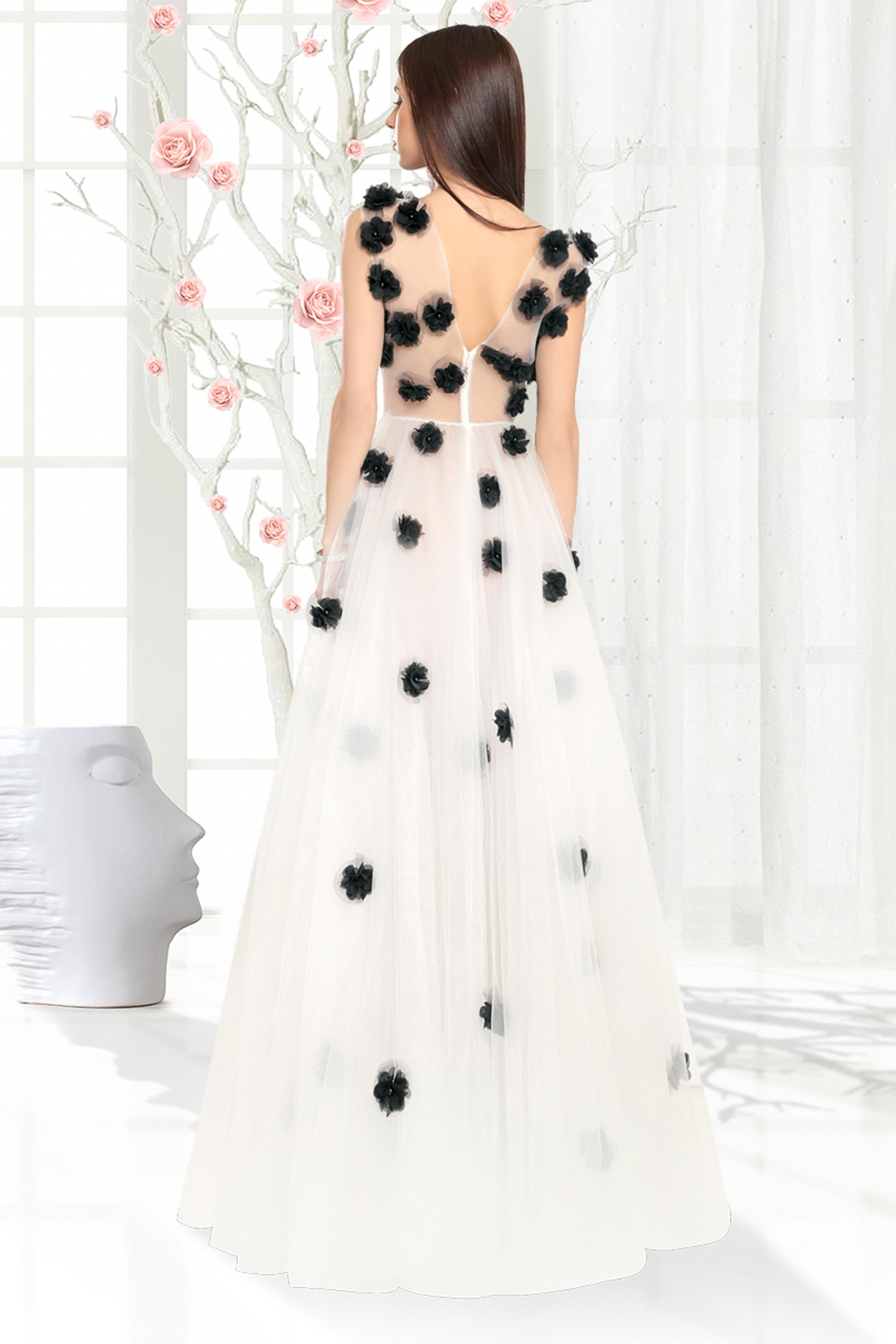 Елегантна бяла дамска рокля без ръкав, с дълбоко остро деколте, апликирано с красиви черни цветя и пола от тюл. Роклята се закопчава с прикрит цип отзад.