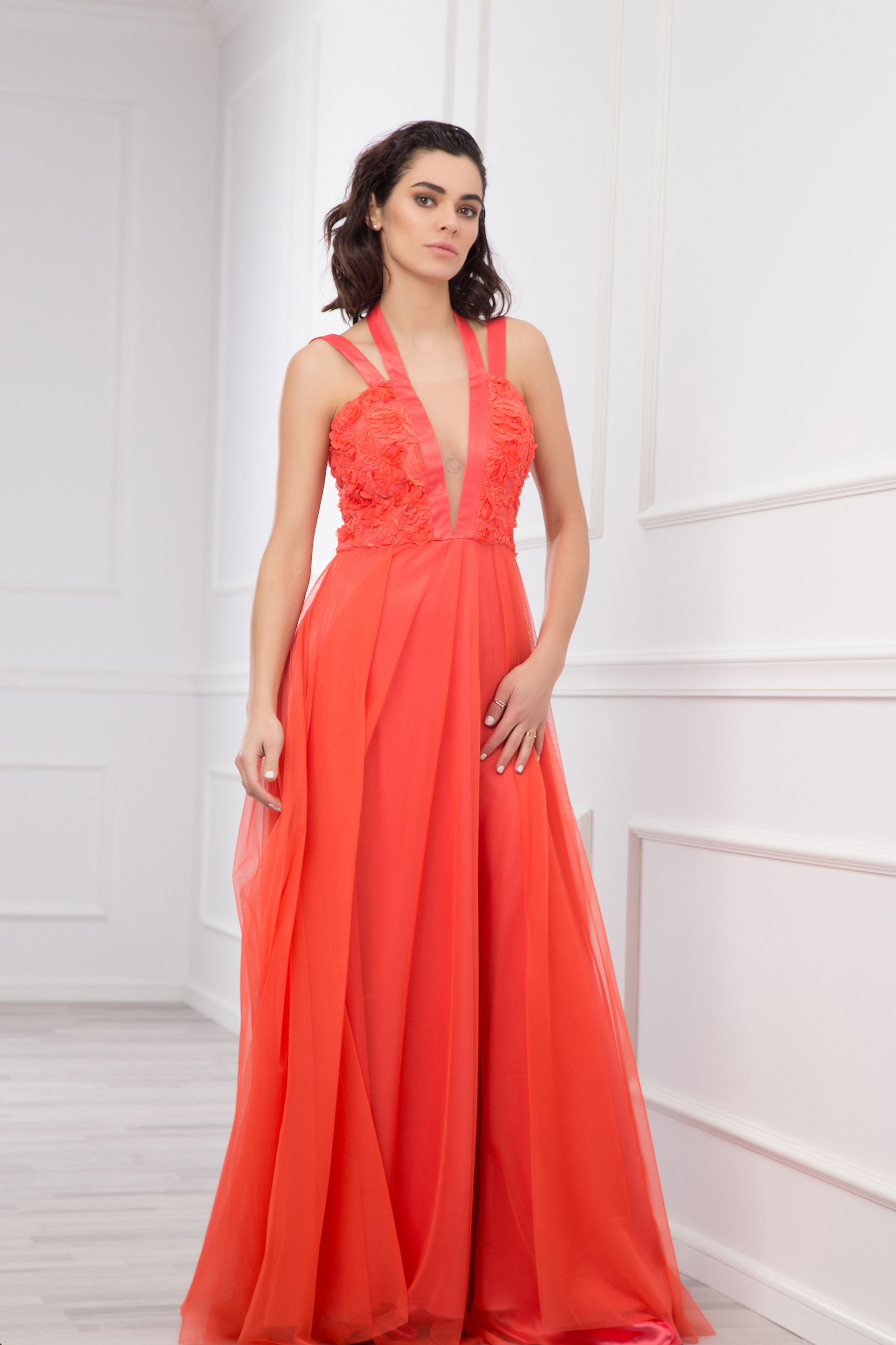 Елегантна дамска рокля без ръкав, с дълбоко остро деколте, изработена от шифон и сатен, декорирана с цветя. Роклята се закопчава с прикрит цип отзад.