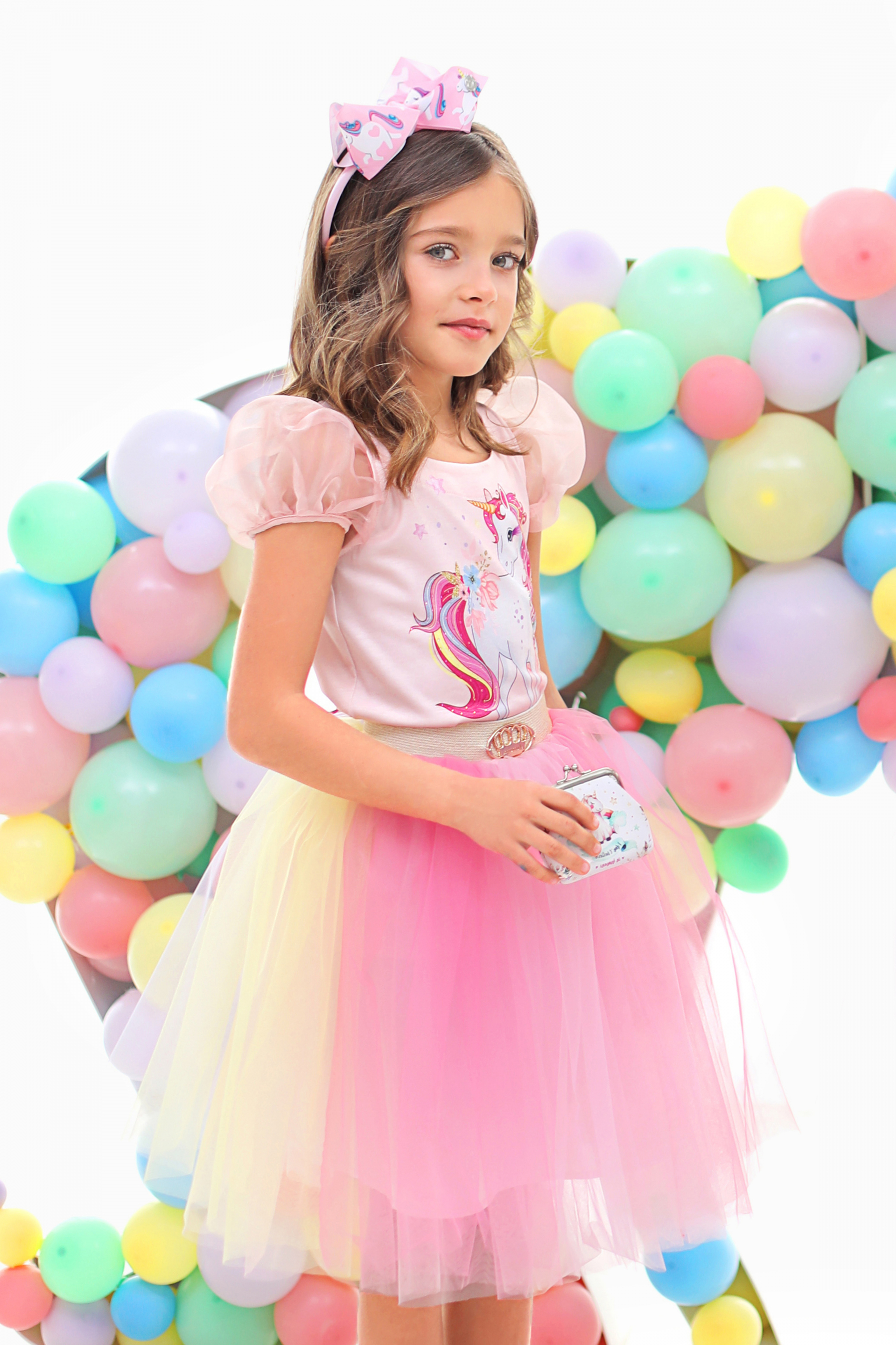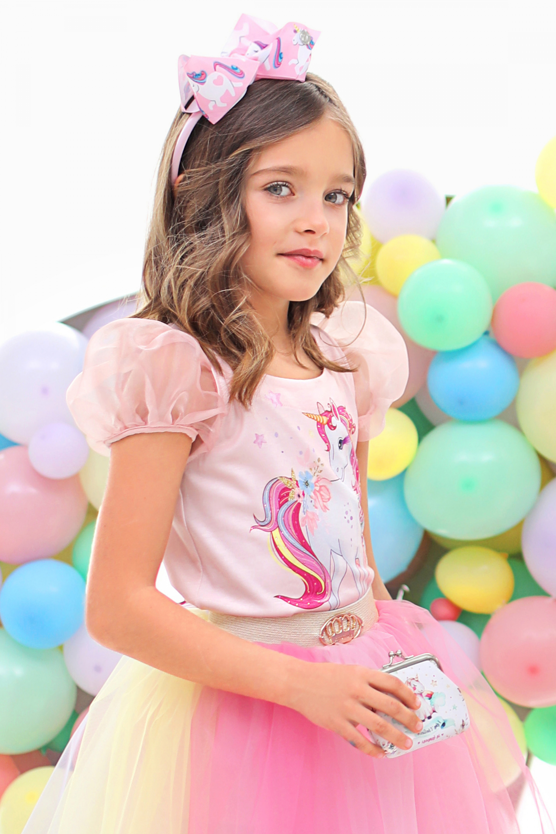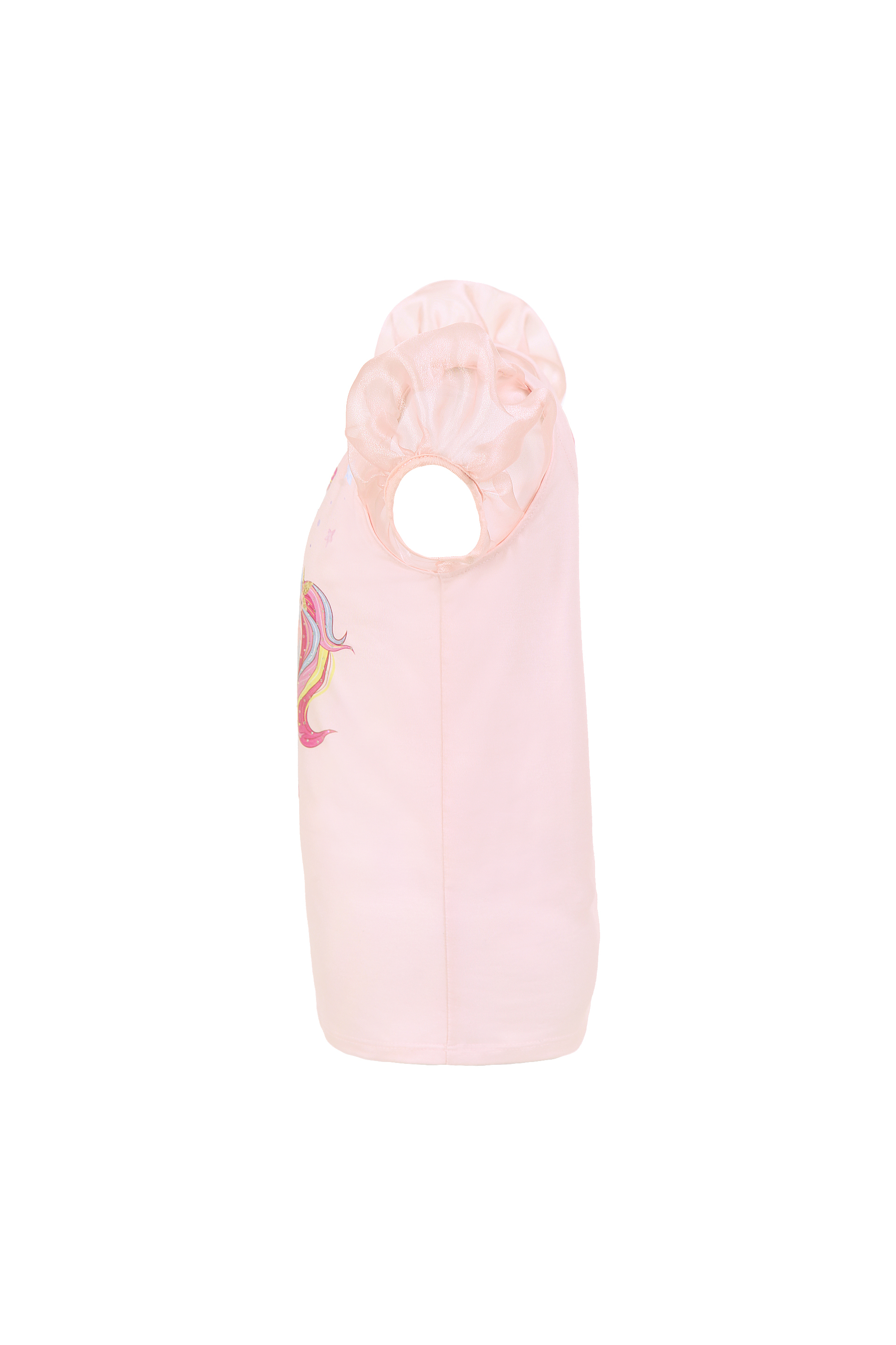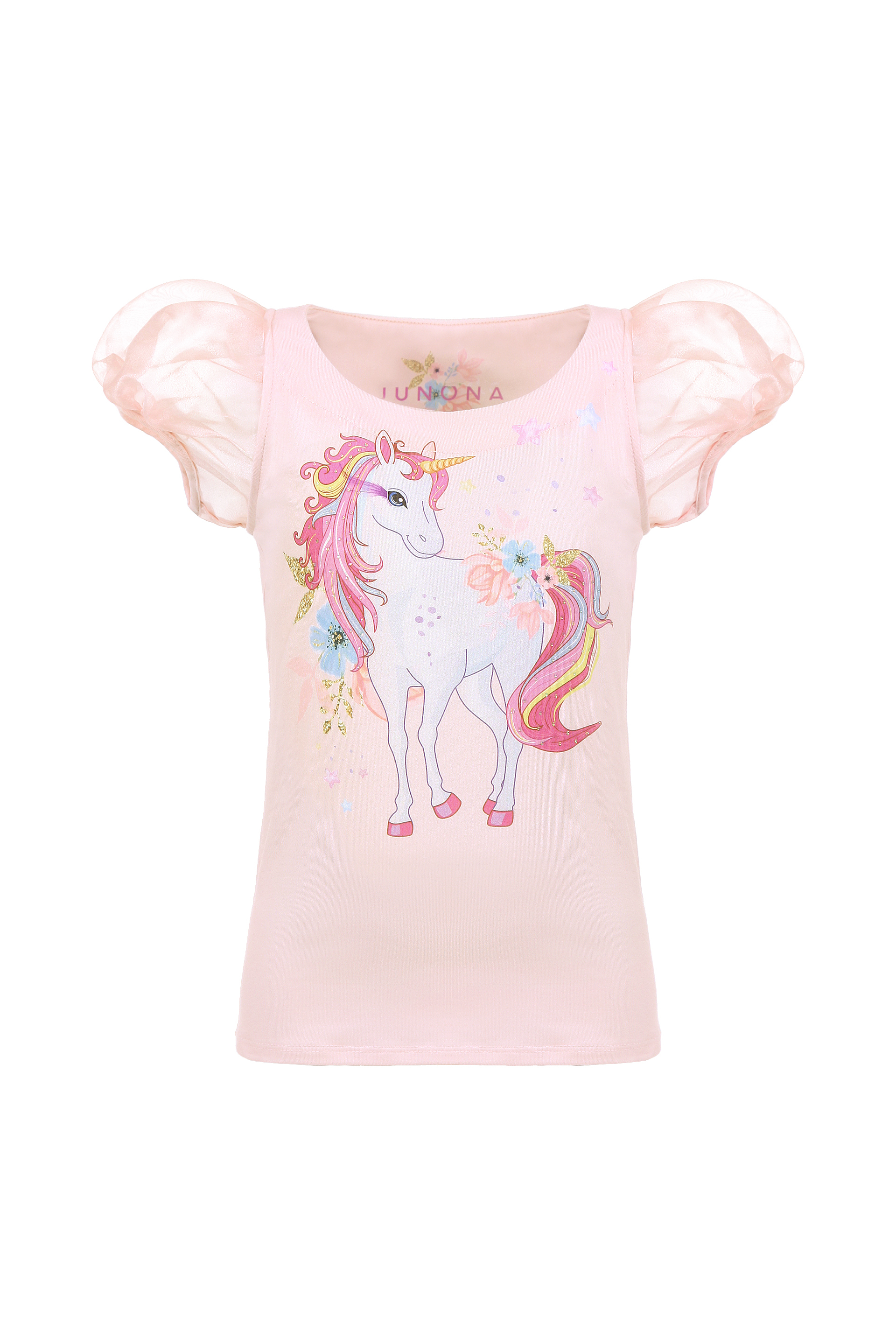 Описание: Детска блуза с красив принт- еднорог, изработена от памучно трико. Обло деколте и прозрачен ръкав. Декорирана с бляскави камъчета. Много удобна и мека. Идеален избор за съчетание с пола, панталон или клин.