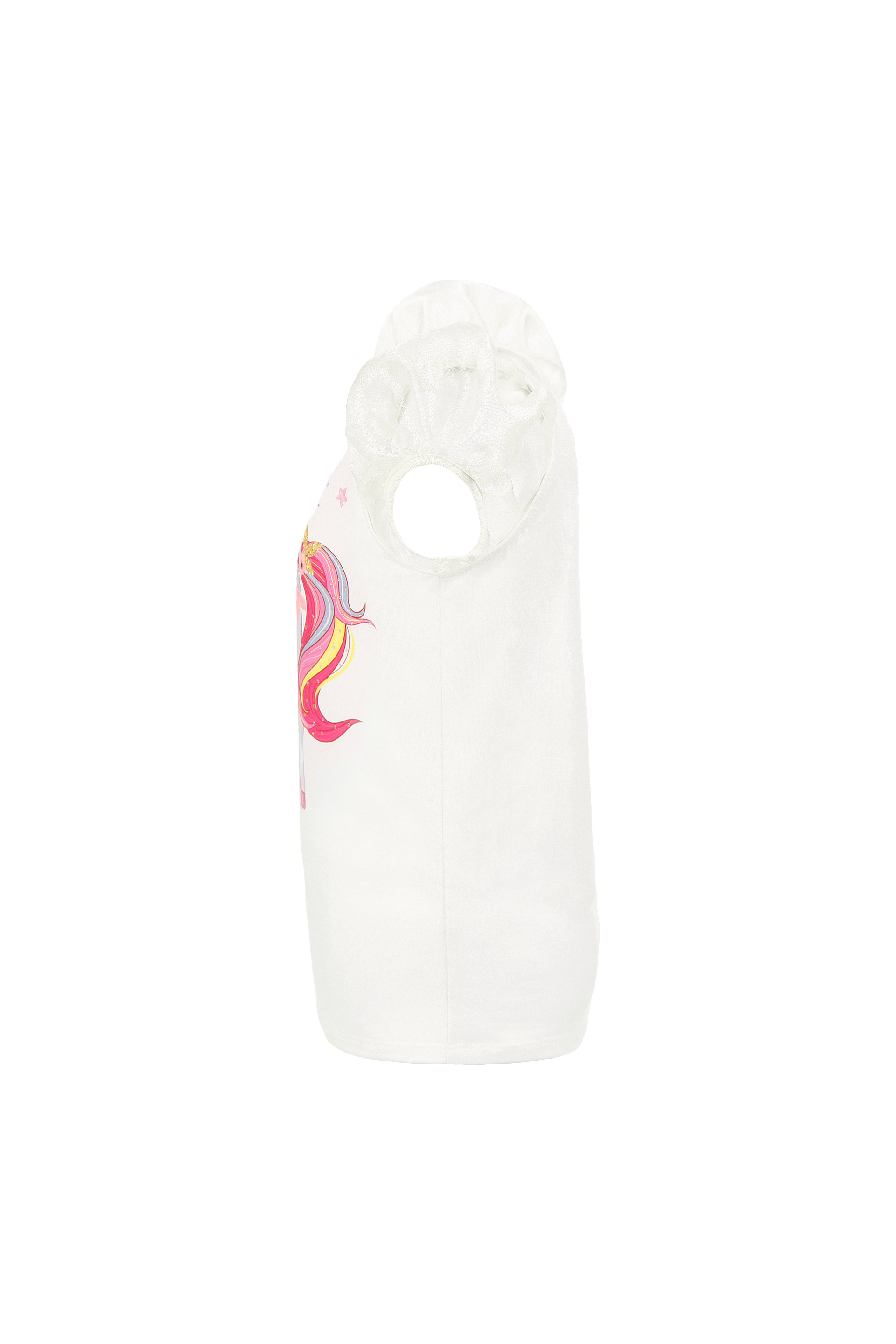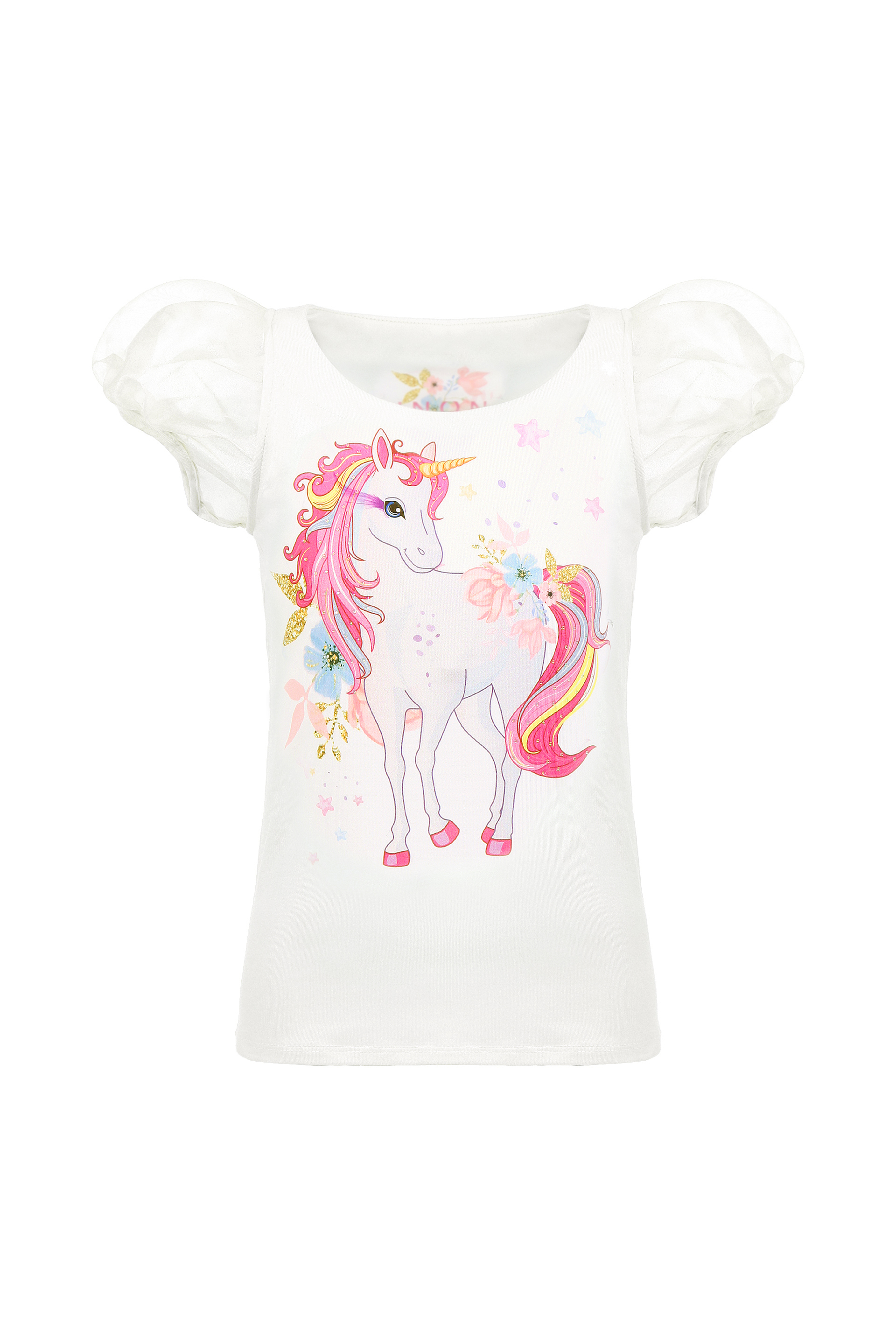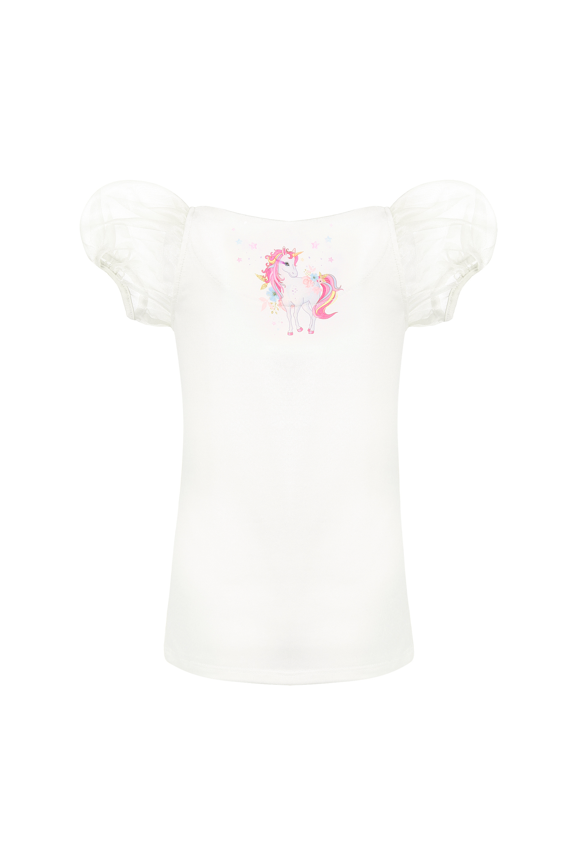 Описание: Детска блуза с красив принт- еднорог, изработена от памучно трико. Обло деколте и прозрачен ръкав. Декорирана с бляскави камъчета. Много удобна и мека. Идеален избор за съчетание с пола, панталон или клин.