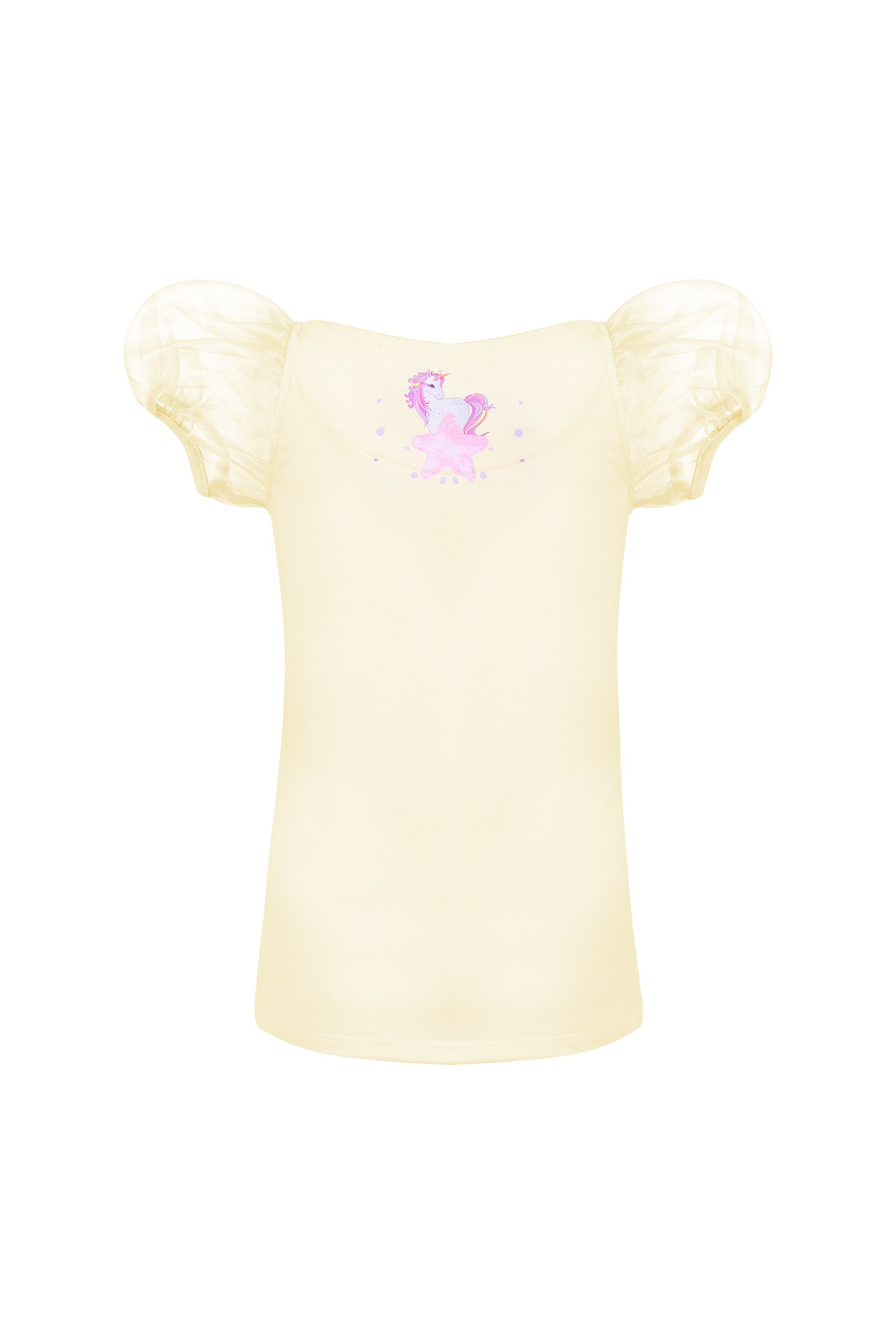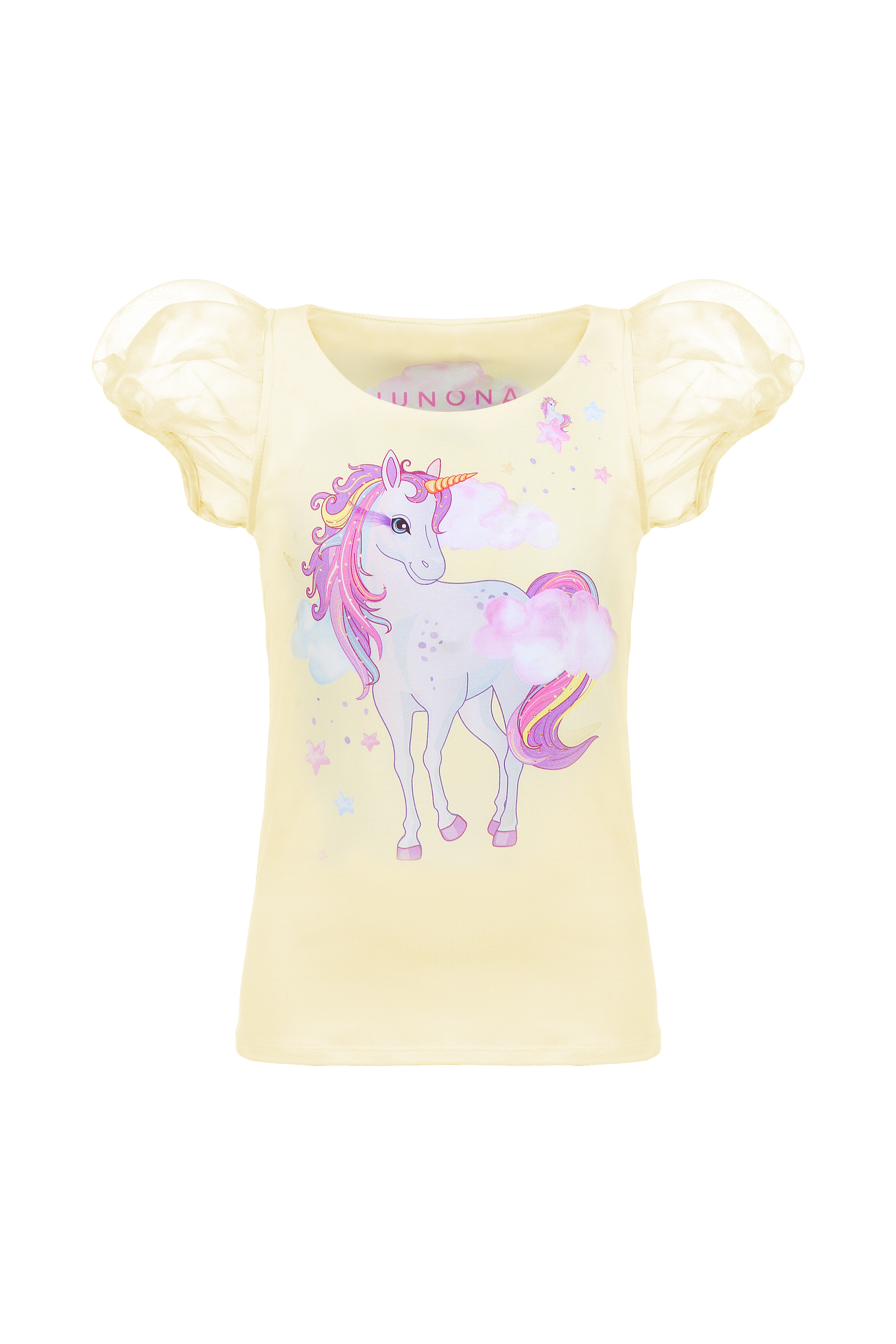 Описание: Детска блуза с красив принт- еднорог, изработена от памучно трико. Обло деколте и прозрачен ръкав. Декорирана с бляскави камъчета. Много удобна и мека. Идеален избор за съчетание с пола, панталон или клин.