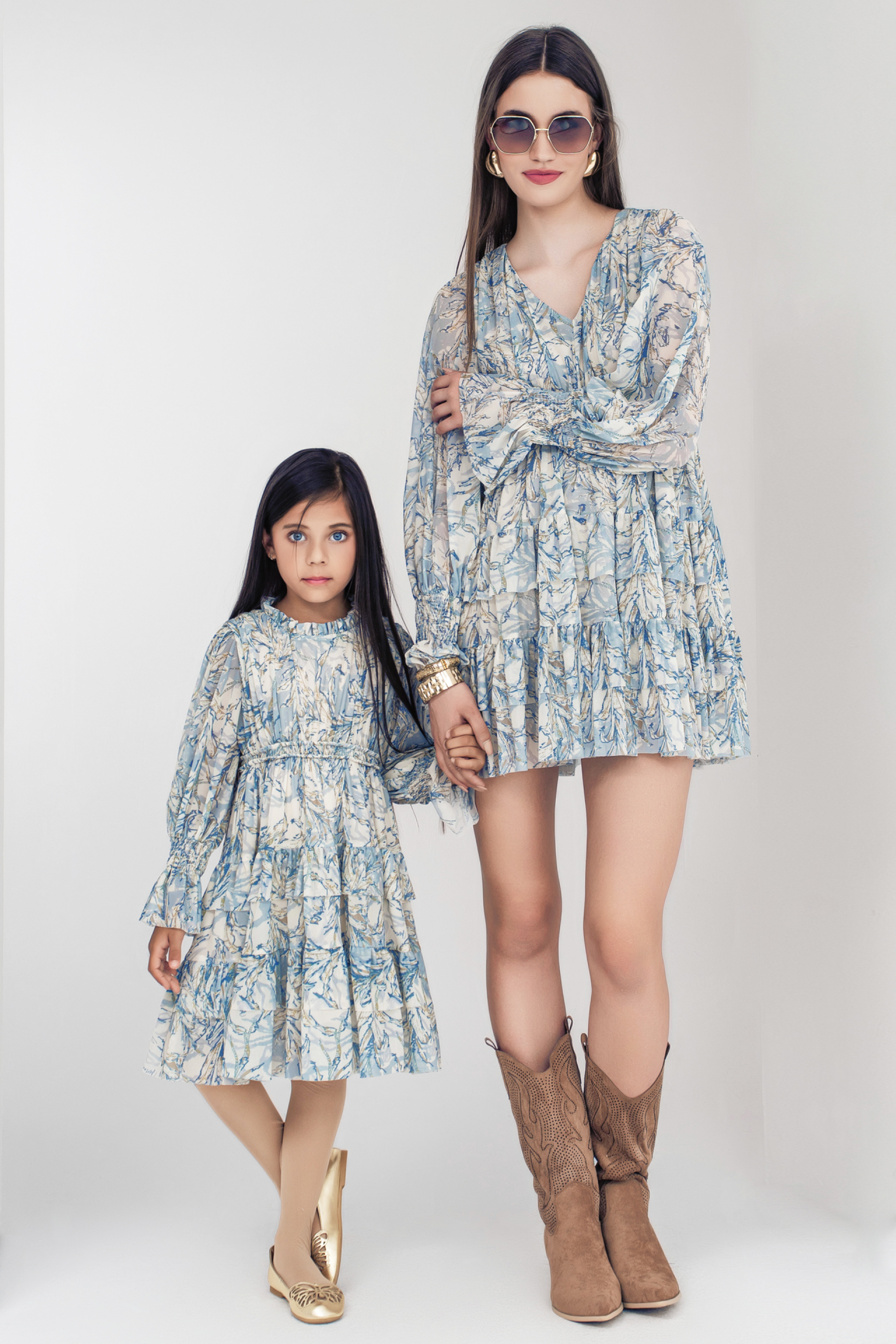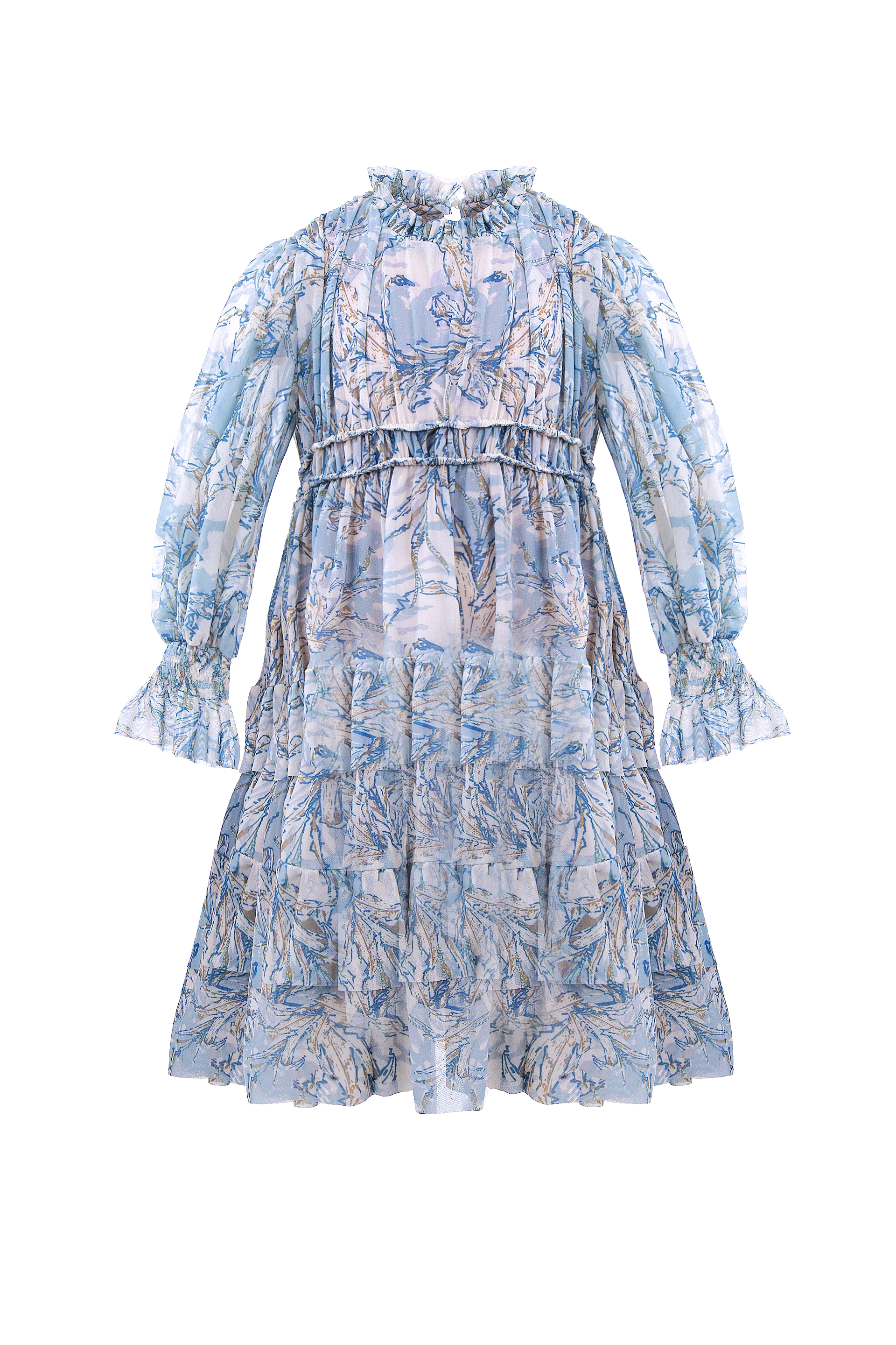 Описание: Детска разкроена рокля от мека мрежеста материя с актуален за сезона принт, с набор в деколтето и в края на ръкавите, с еластичен набран колан в талията и волани в долната част на роклята. Закопчава се с копче на гърба.
