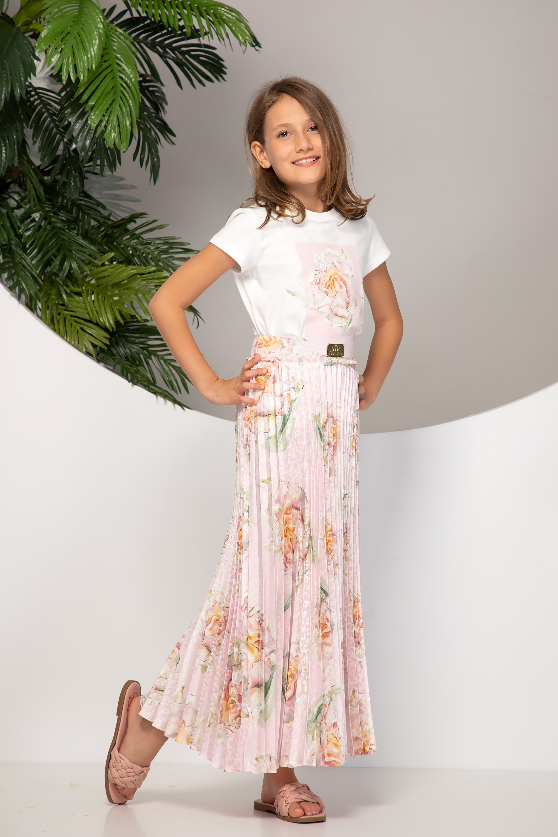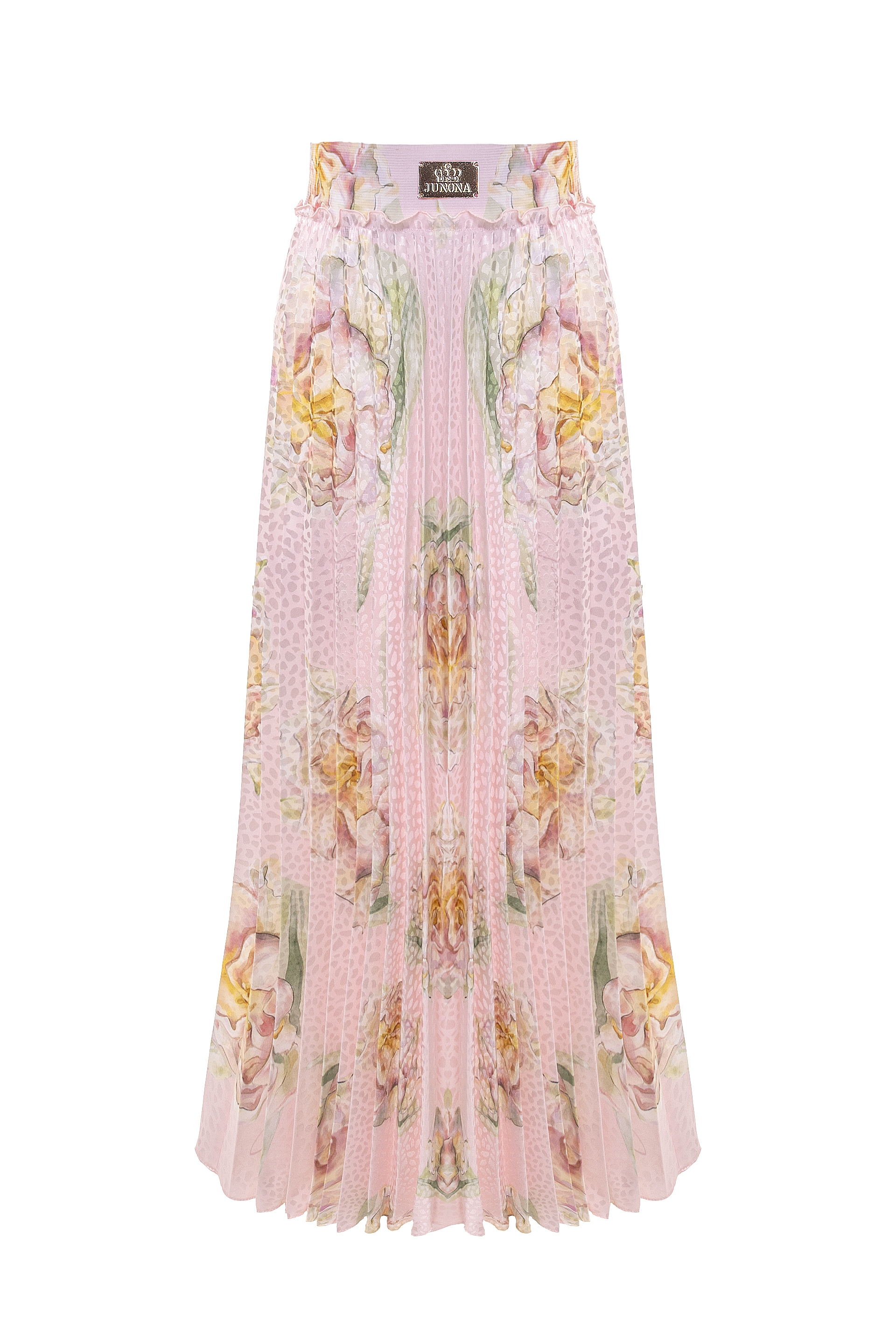 Описание: Дълга разкроена, плисирана пола с актуален за сезона принт на цял ластик със златисто лого отпред.