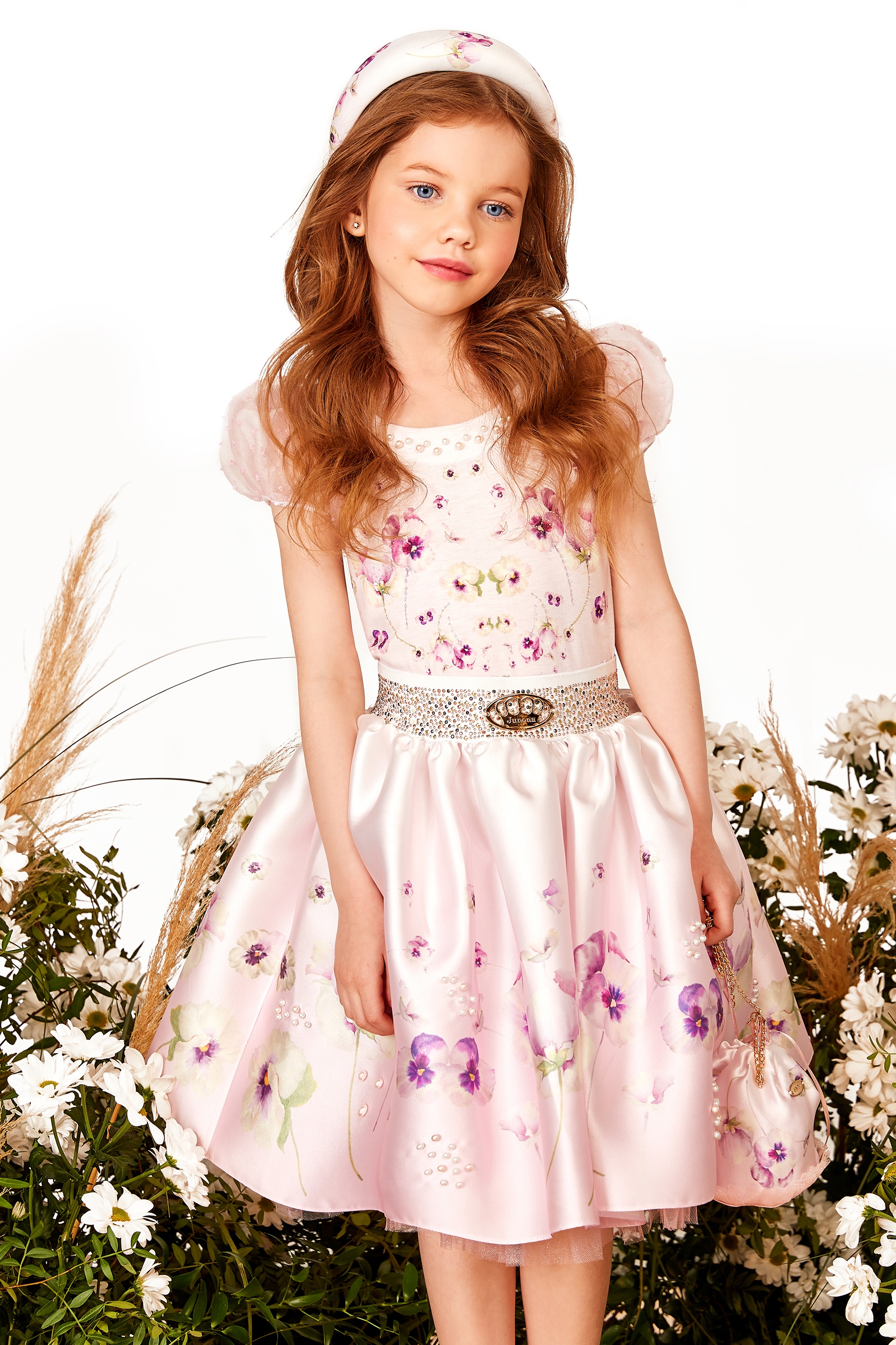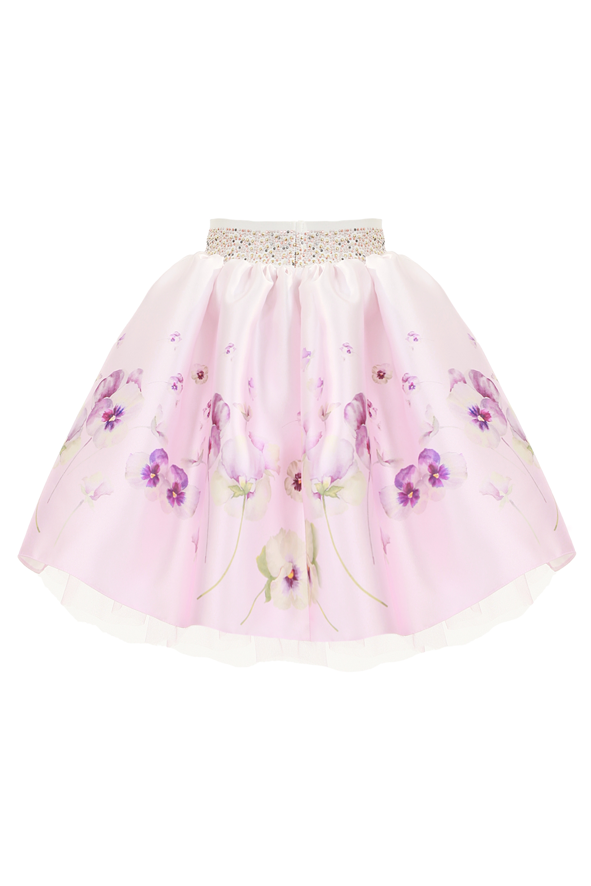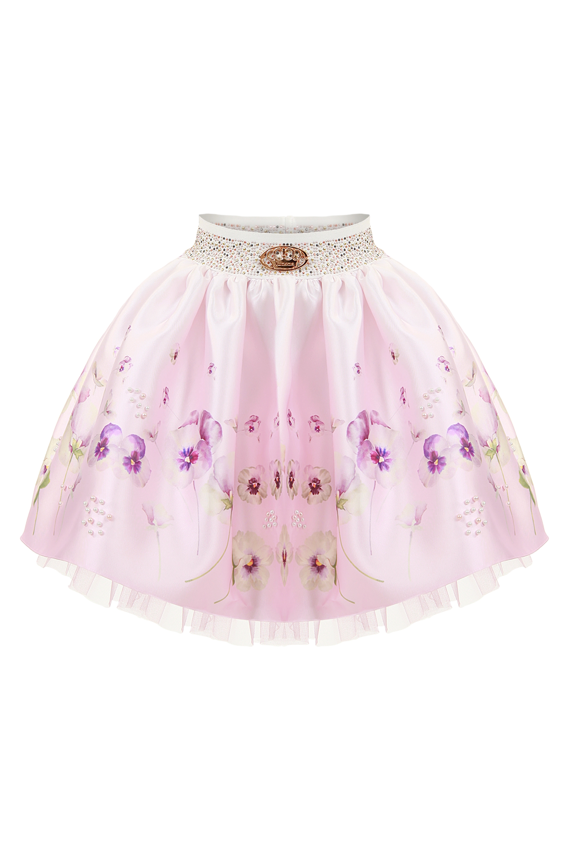 Описание: Детска разкроена пола от памучен сатен с нежен принт на теменужки в пастелни цветове, декорирана с перли. На цял ластичен колан в кръста с блещукащи камъчета, лесна и удобна за обличане, с тюл отдолу за по-бухнала визия и памучна подплата за комфортно усещане.