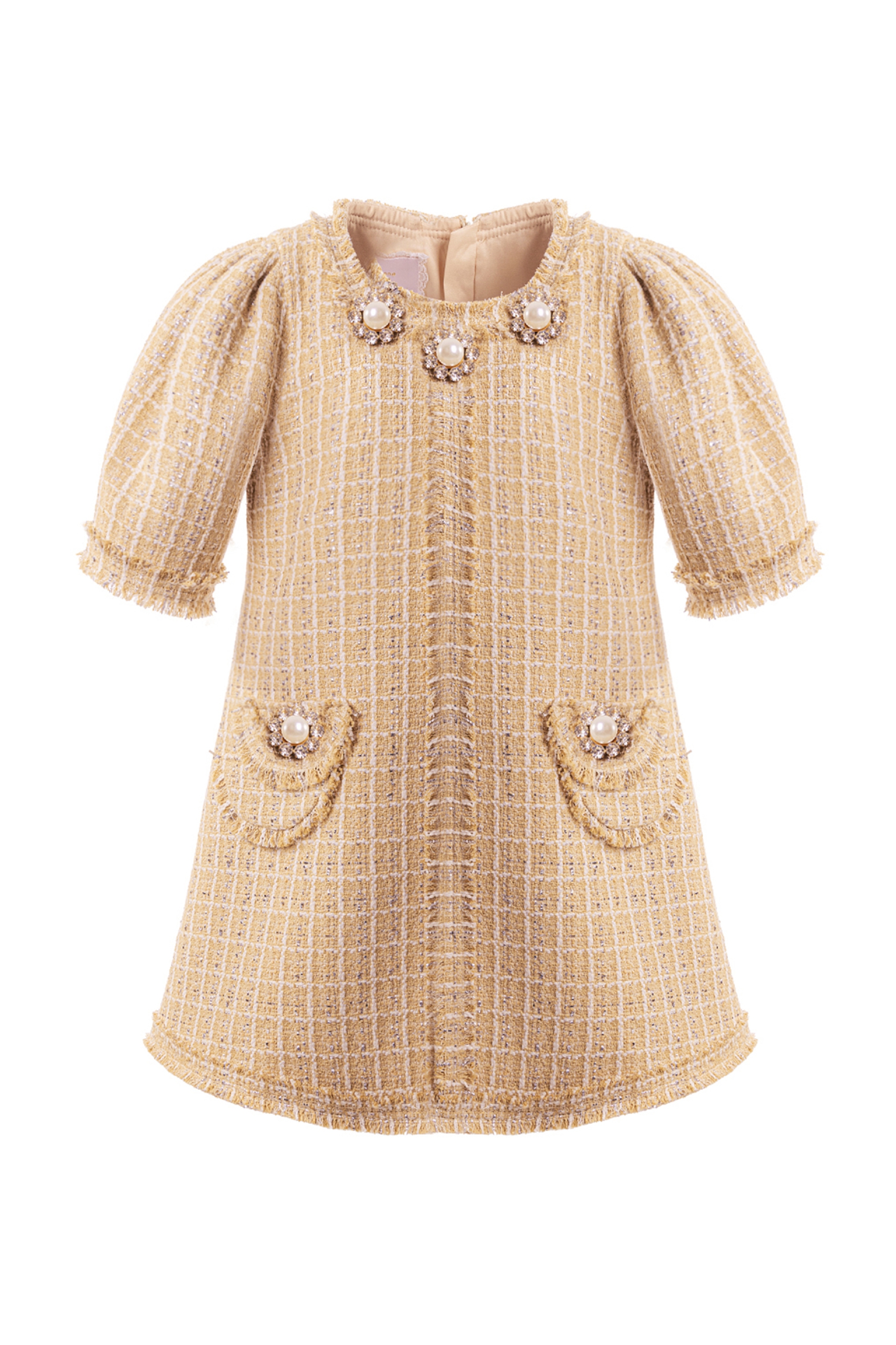 Детска рокля от ефектно памучно букле, свободна кройка тип трапец с късо ръкавче с лек набор на рамото, с необработени краища, декорирана с нежни диамантени копчета. Закопчава се с цип на гърба.