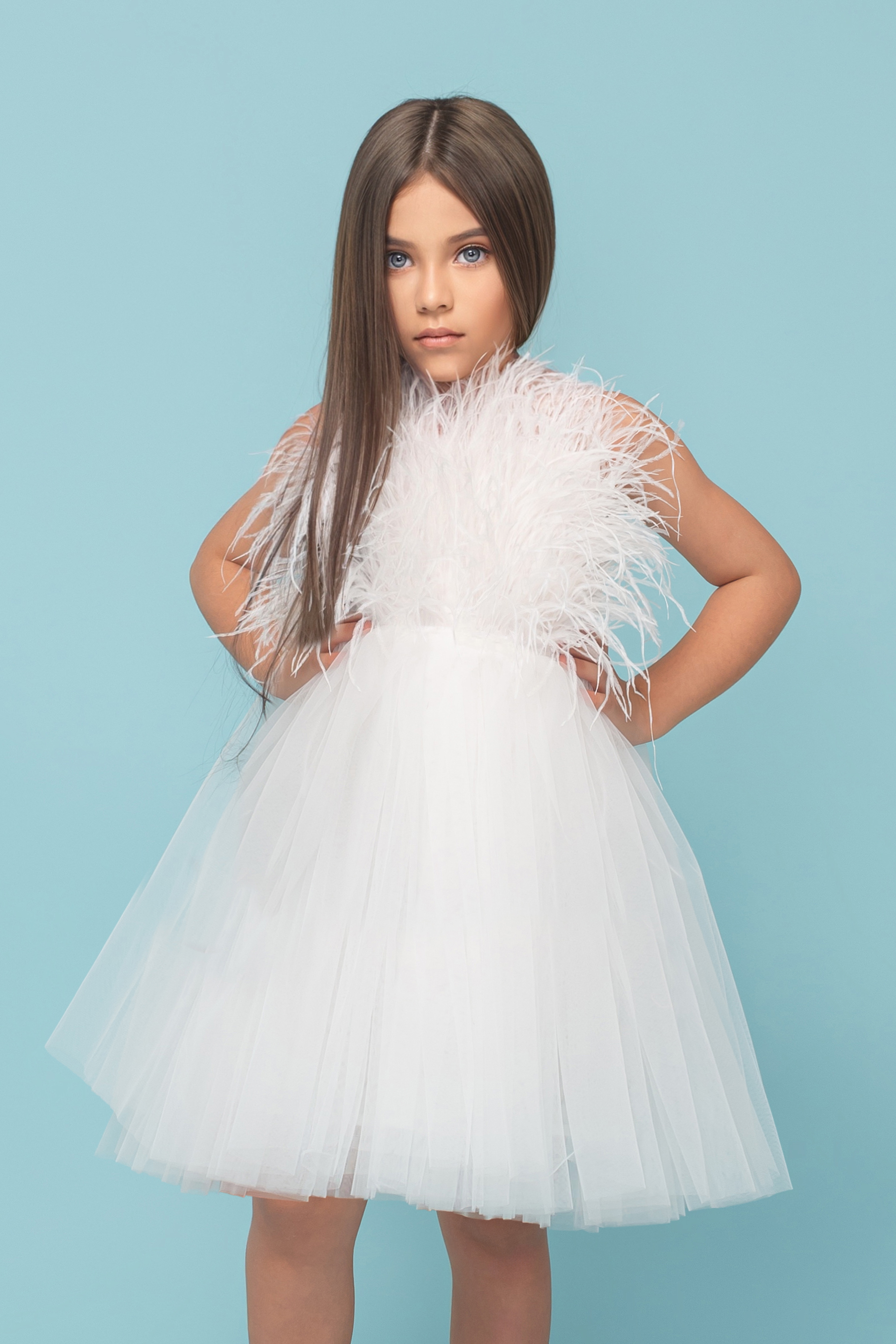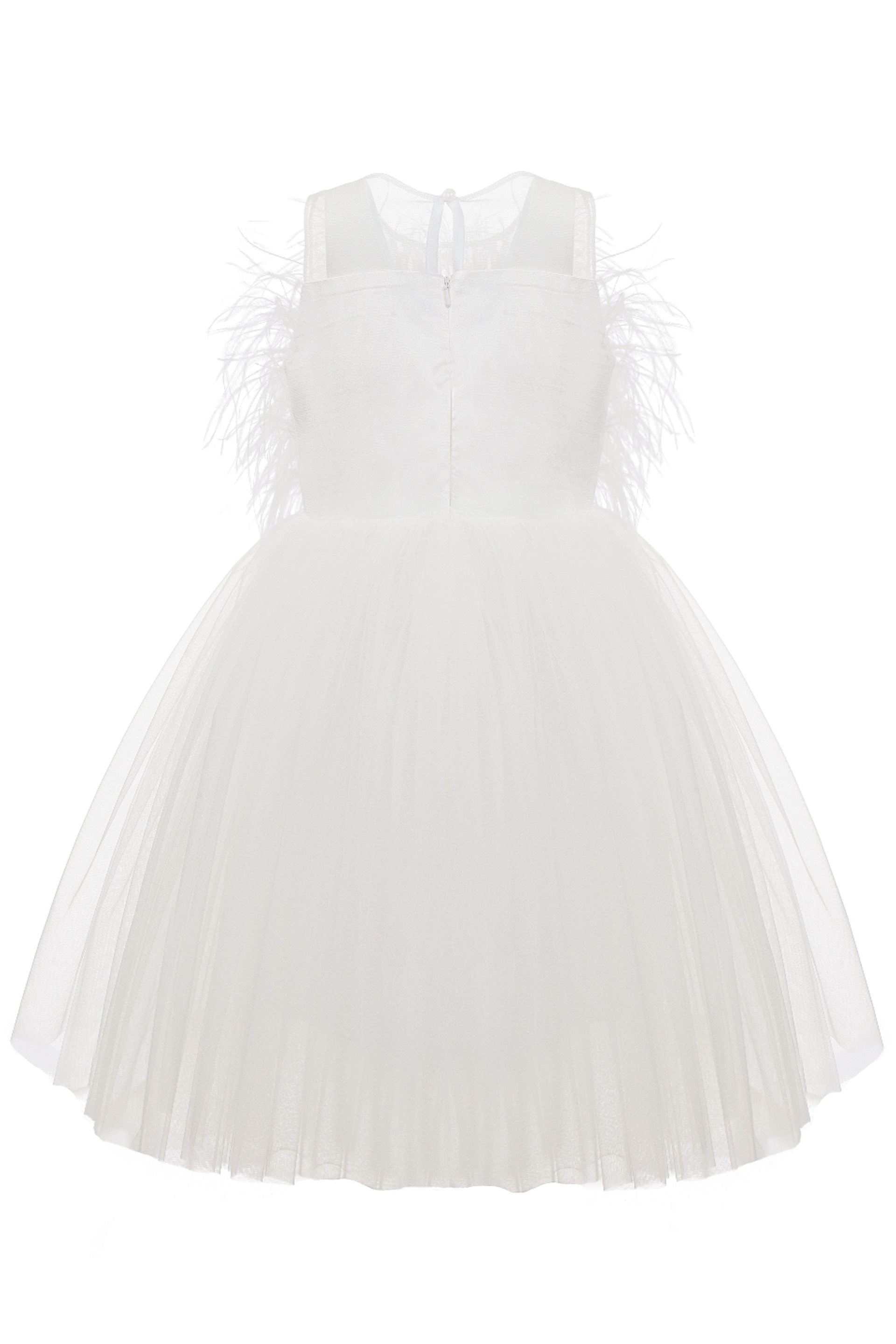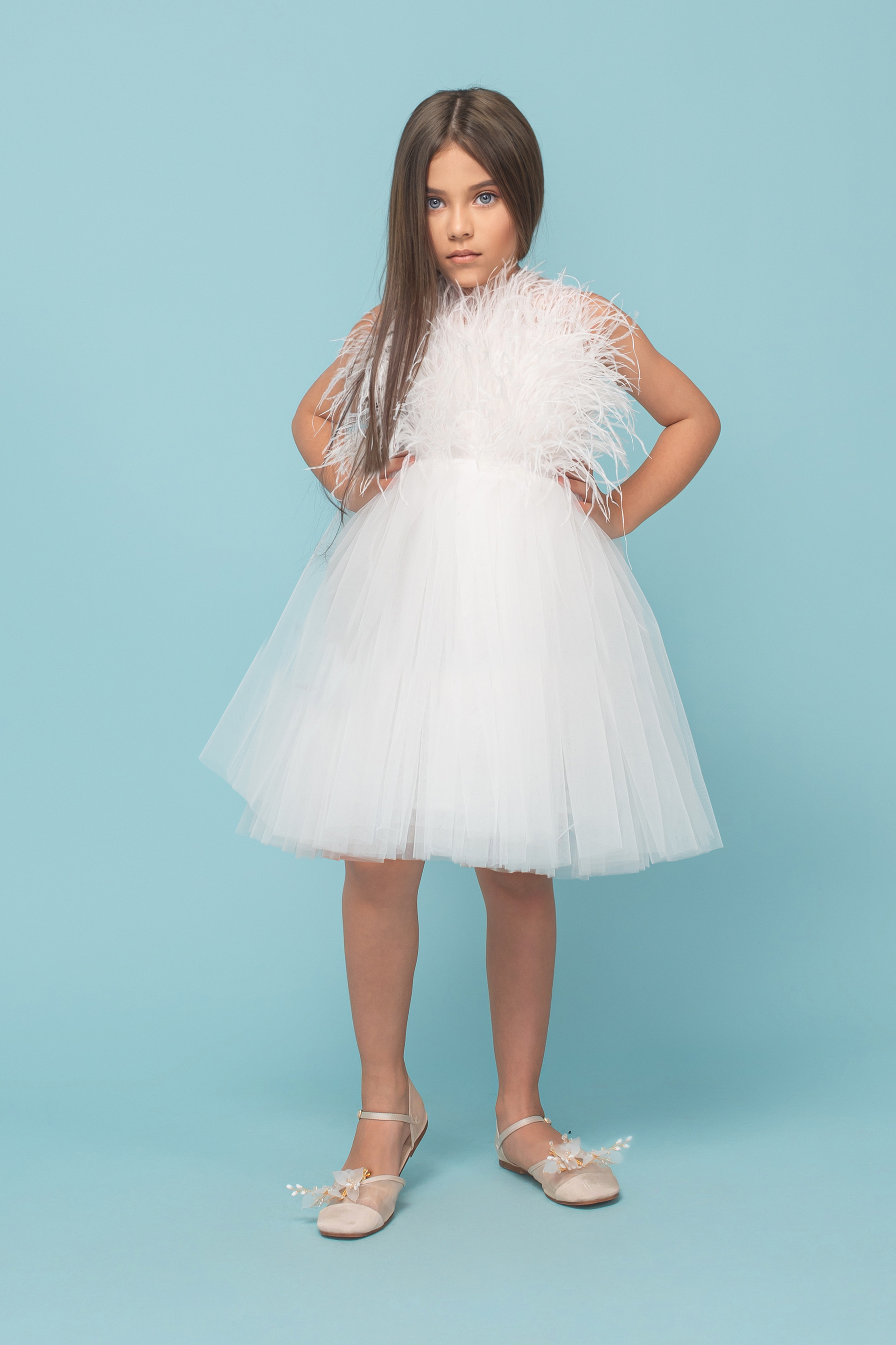Описание: Детска рокля от нежен тюл, богато декорирана с пера отпред, нежна мрежа в областта на деколтето и презрамките, памучен, мек тюл в долната част. Закопчава се с цип и копче на гърба. Подходяща за сватби, кръщенета и партита.