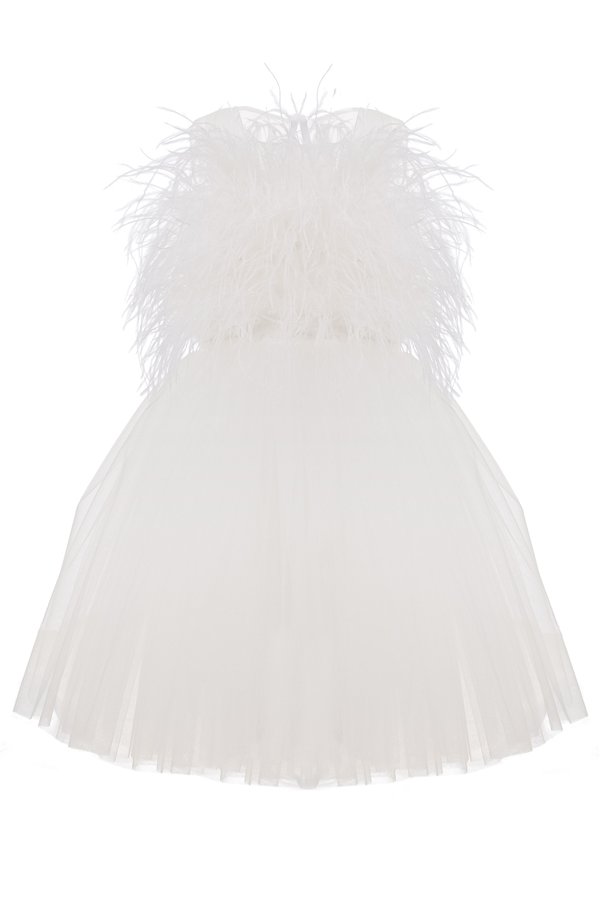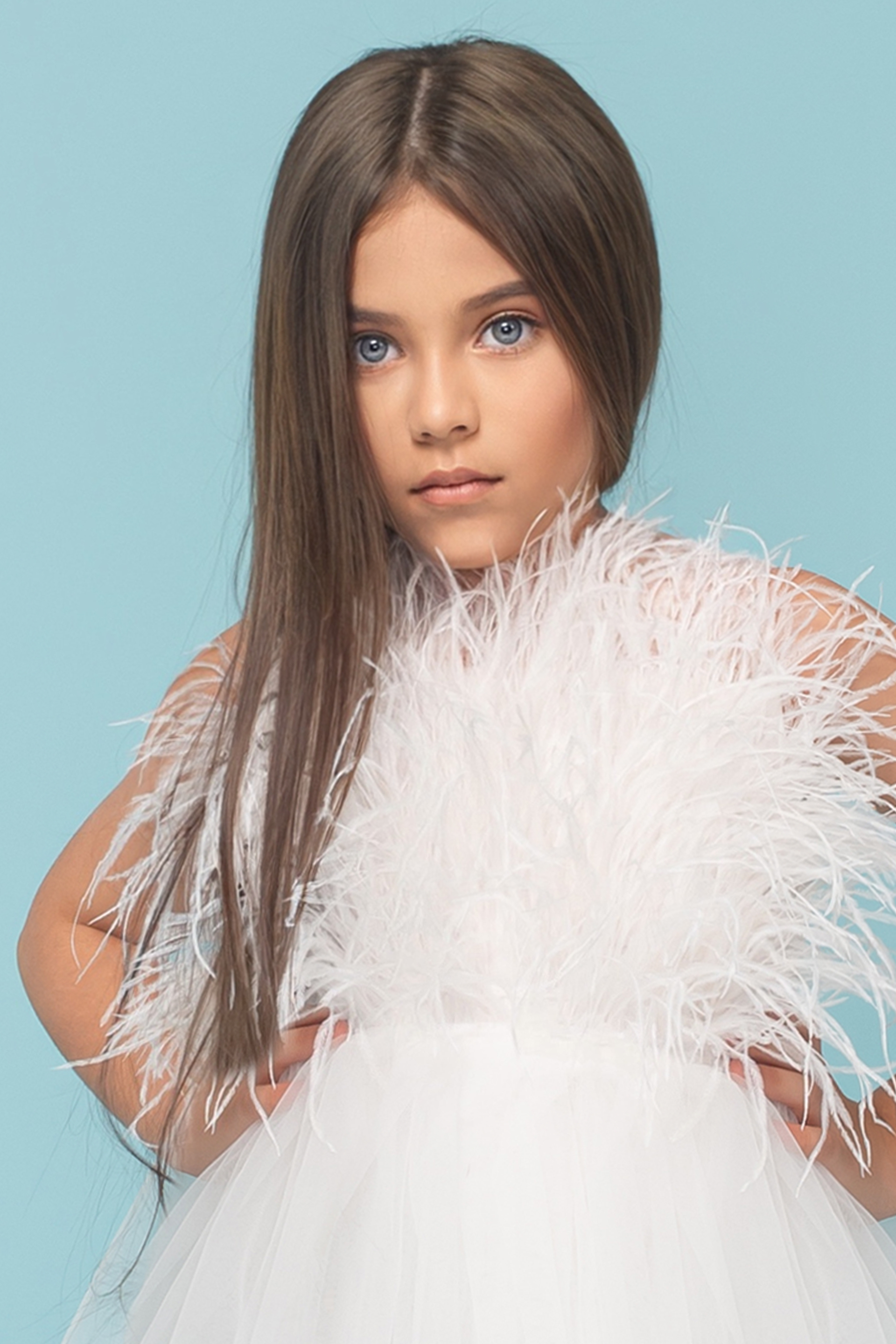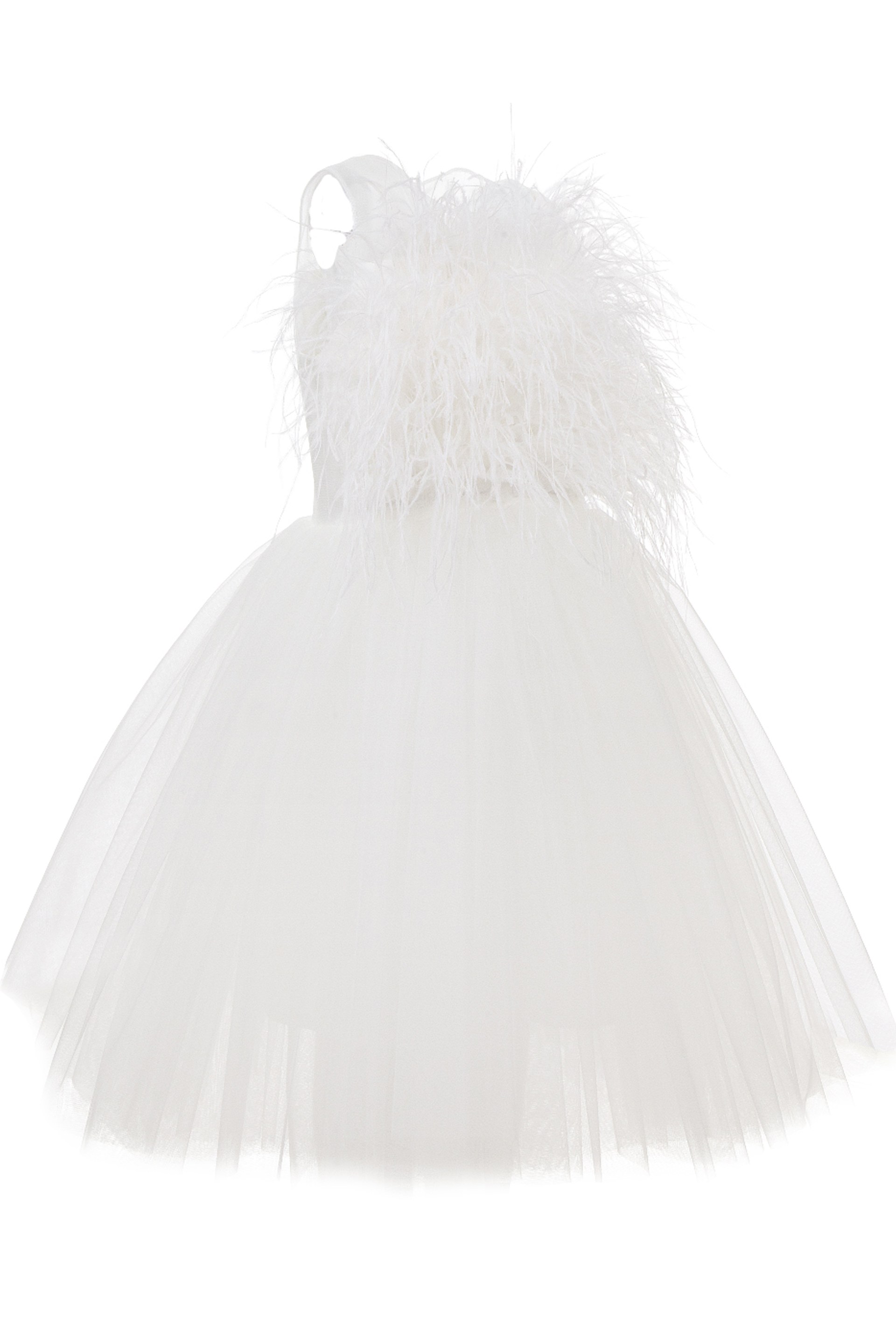 Описание: Детска рокля от нежен тюл, богато декорирана с пера отпред, нежна мрежа в областта на деколтето и презрамките, памучен, мек тюл в долната част. Закопчава се с цип и копче на гърба. Подходяща за сватби, кръщенета и партита.