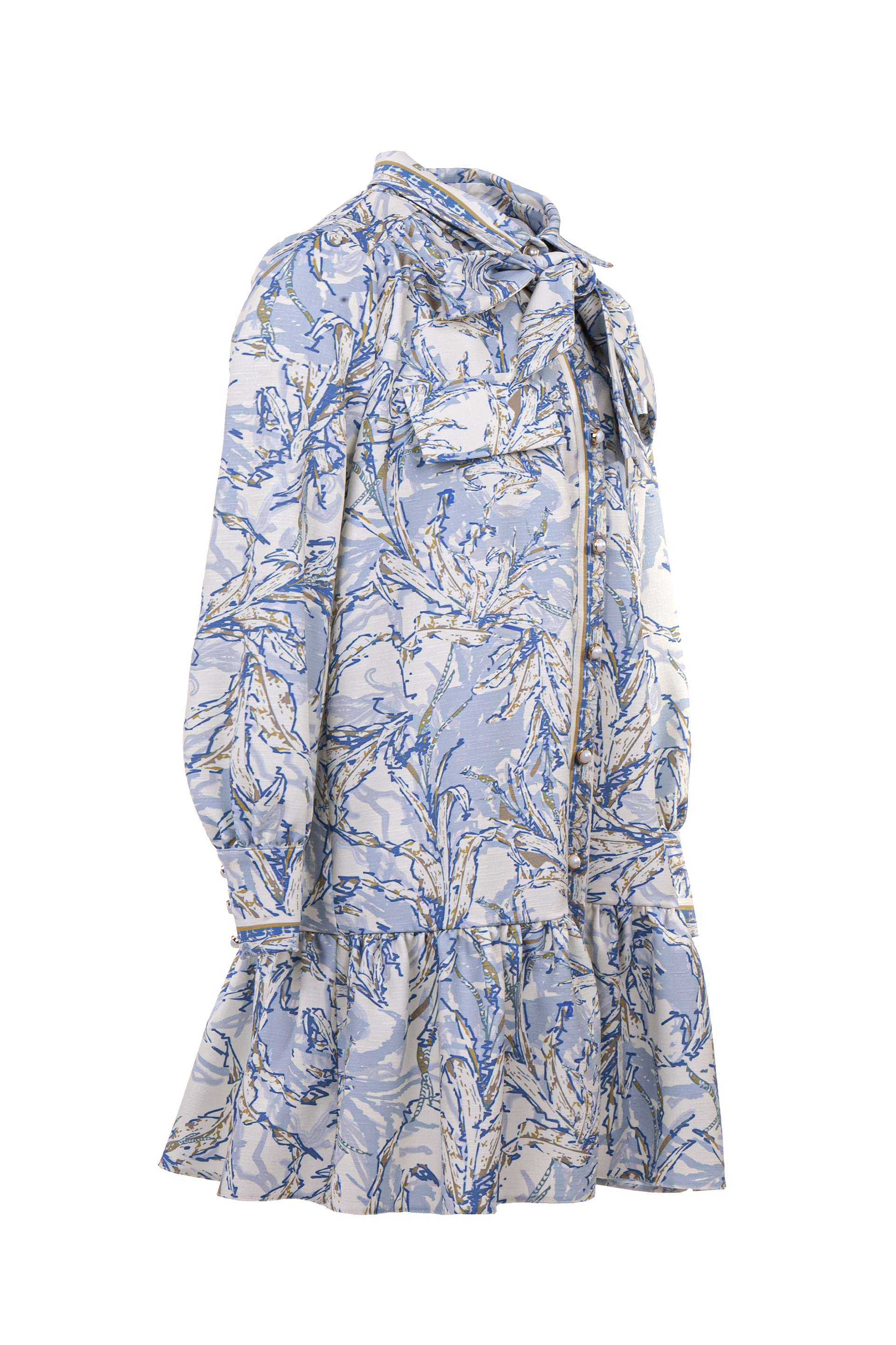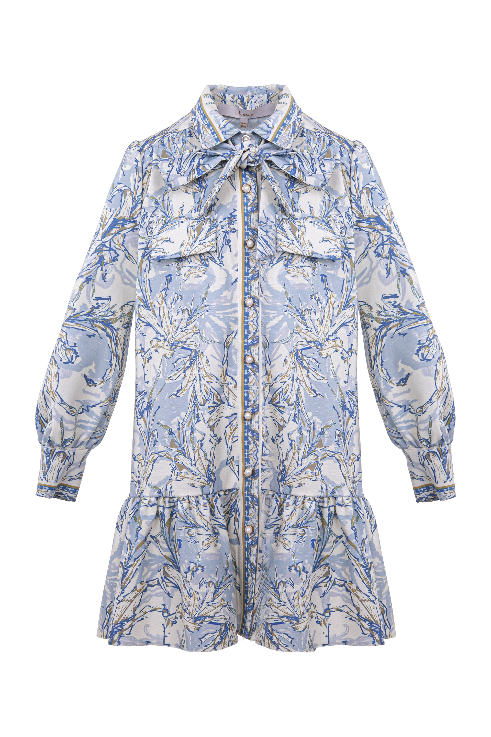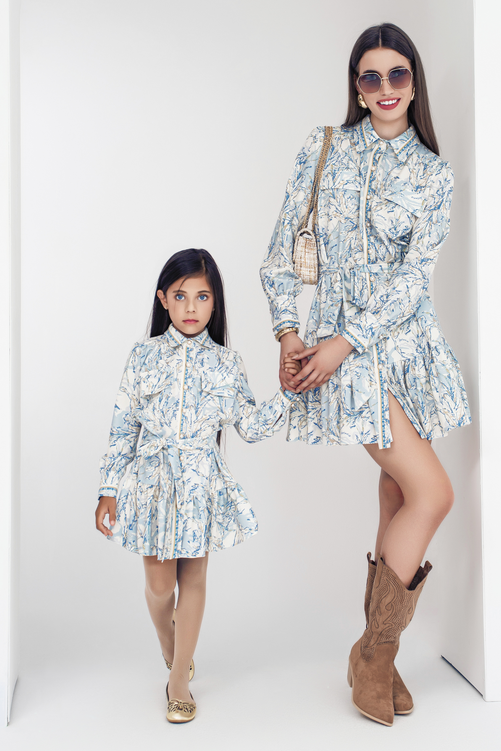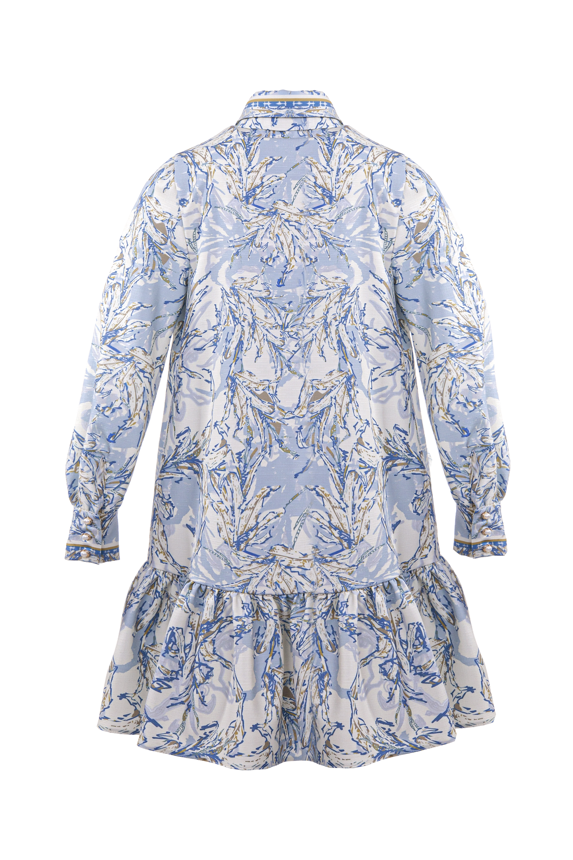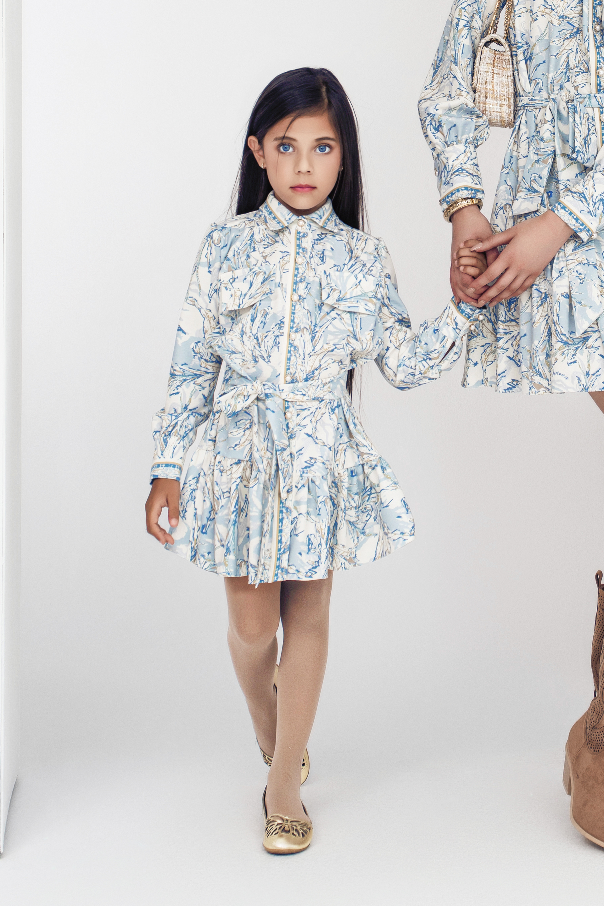 Описание: Детска рокля - риза с дълъг ръкав с принт от приятна мека материя, с класическа яка, закопчава се с нежни перлени копчета отпред и в края на ръкавите, с широк набран волан в долната част на роклята, с подвижен колан тип връзка, който лесно се оформя и на панделка.