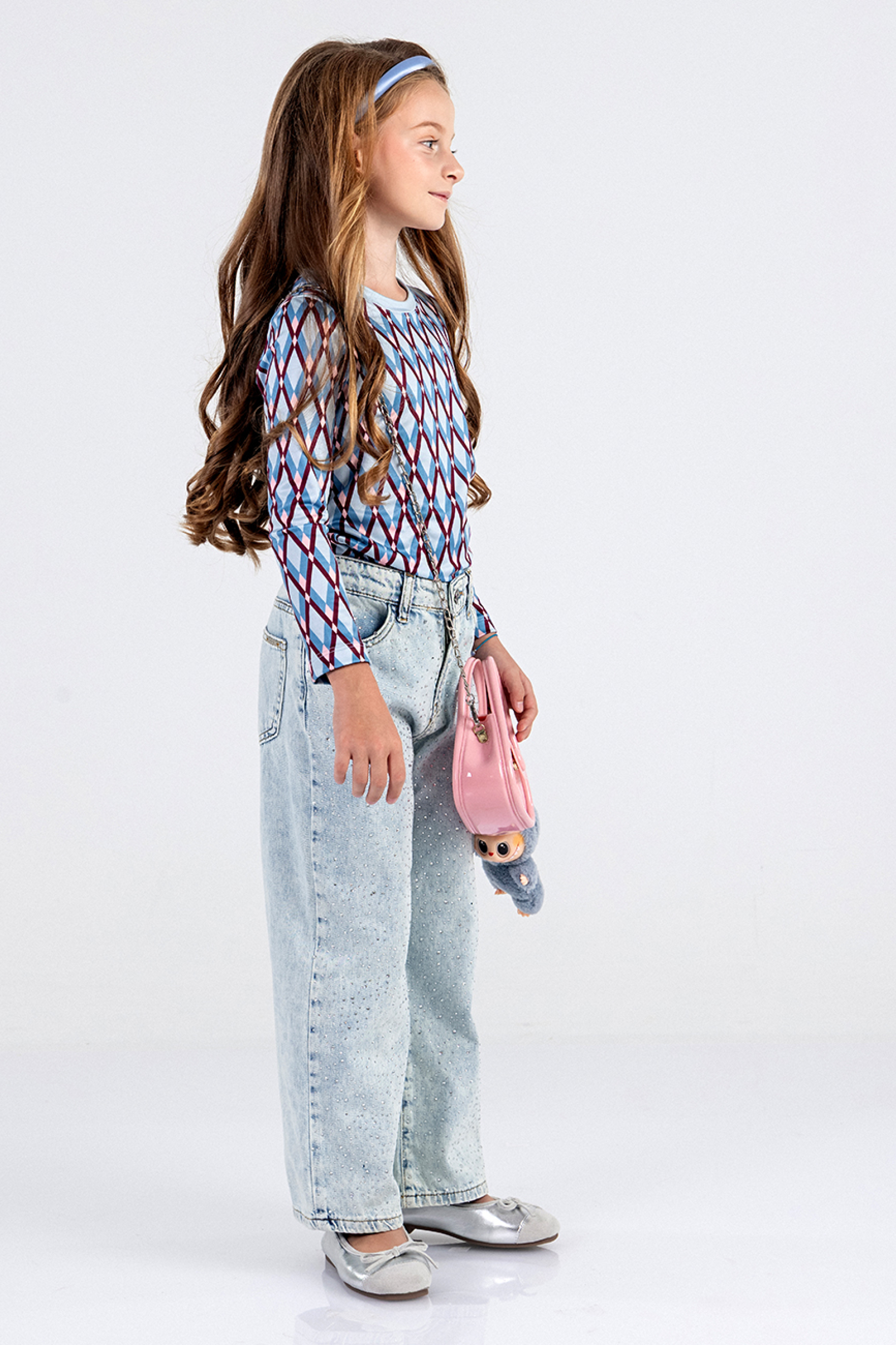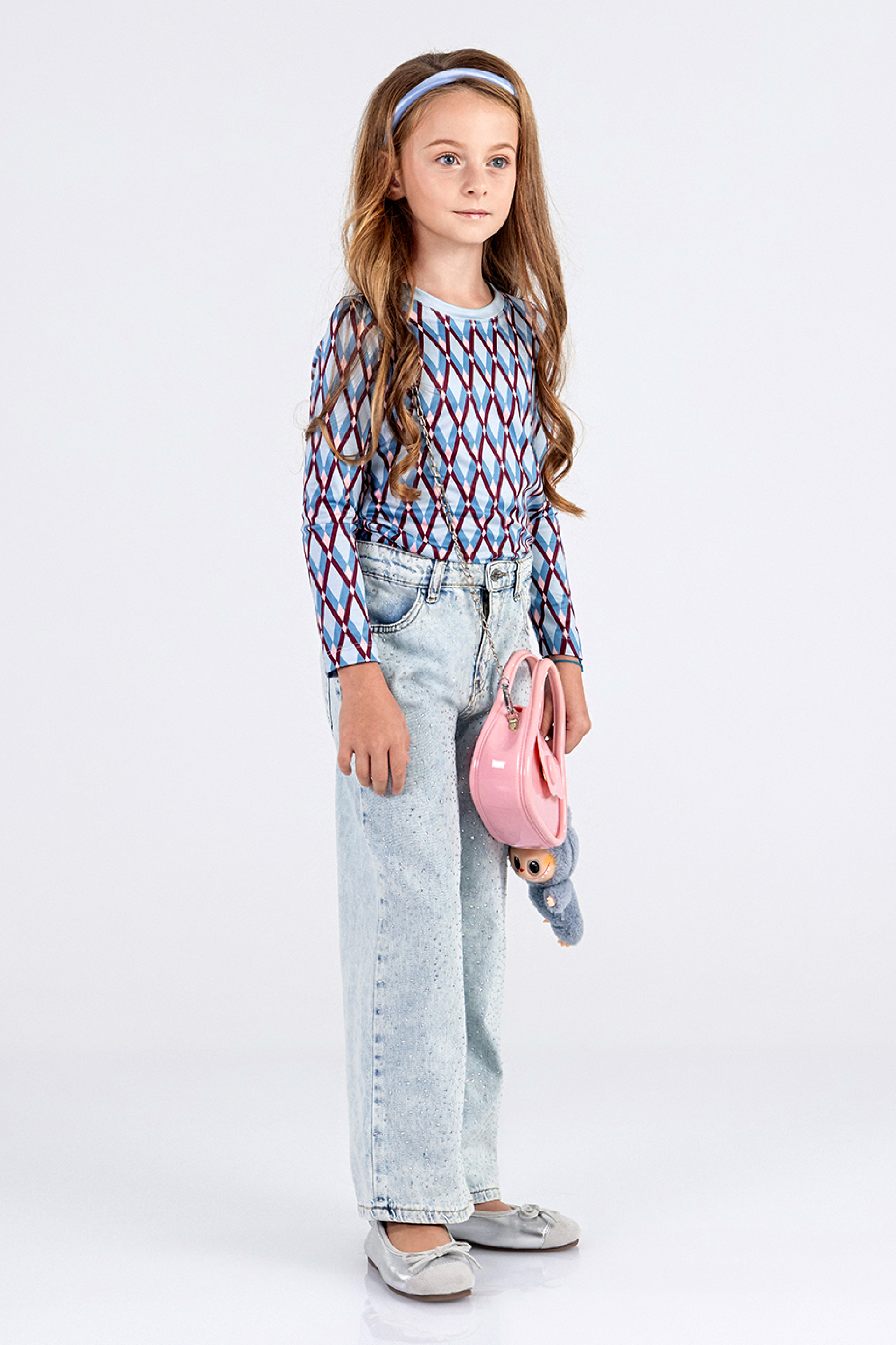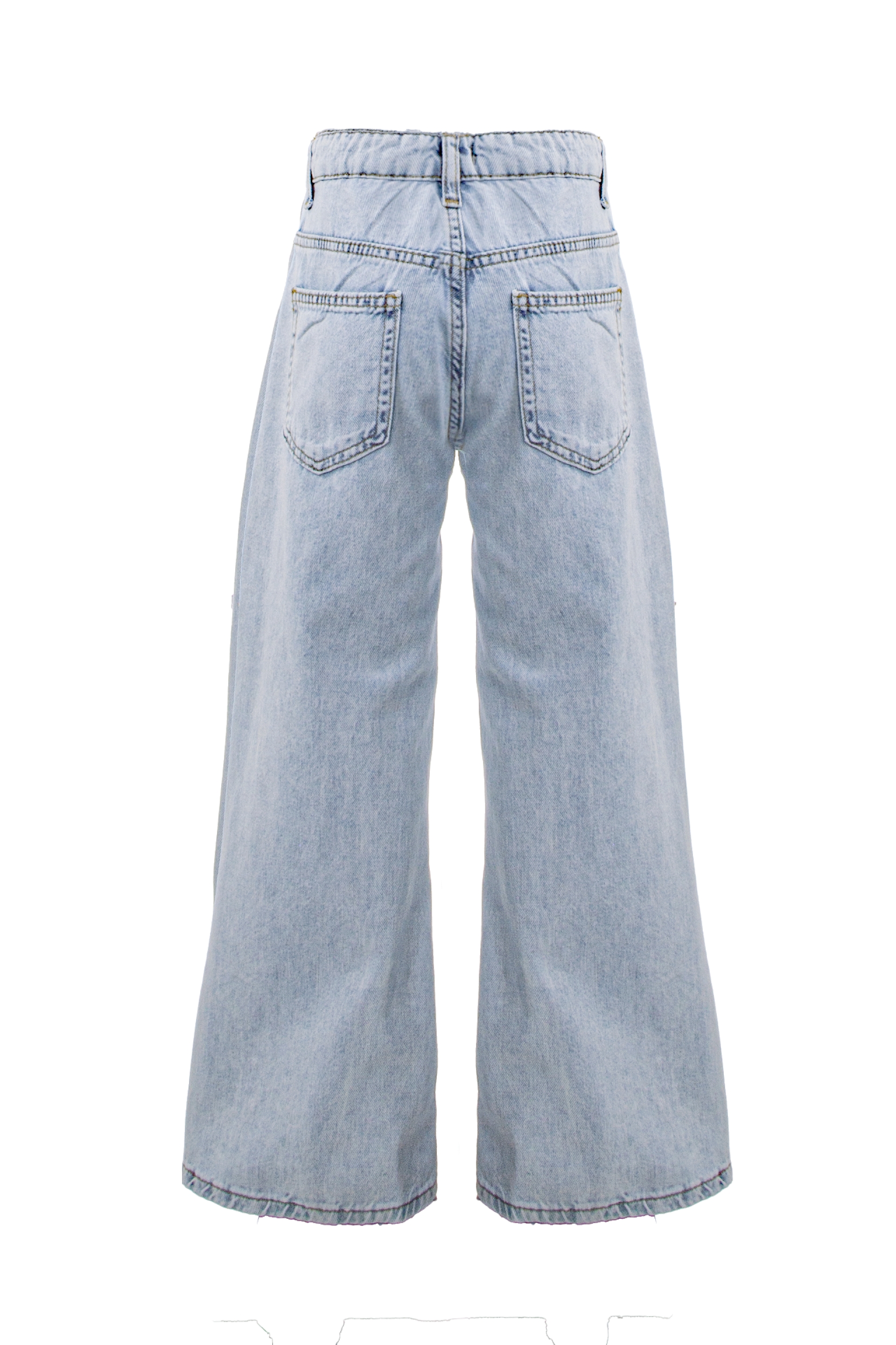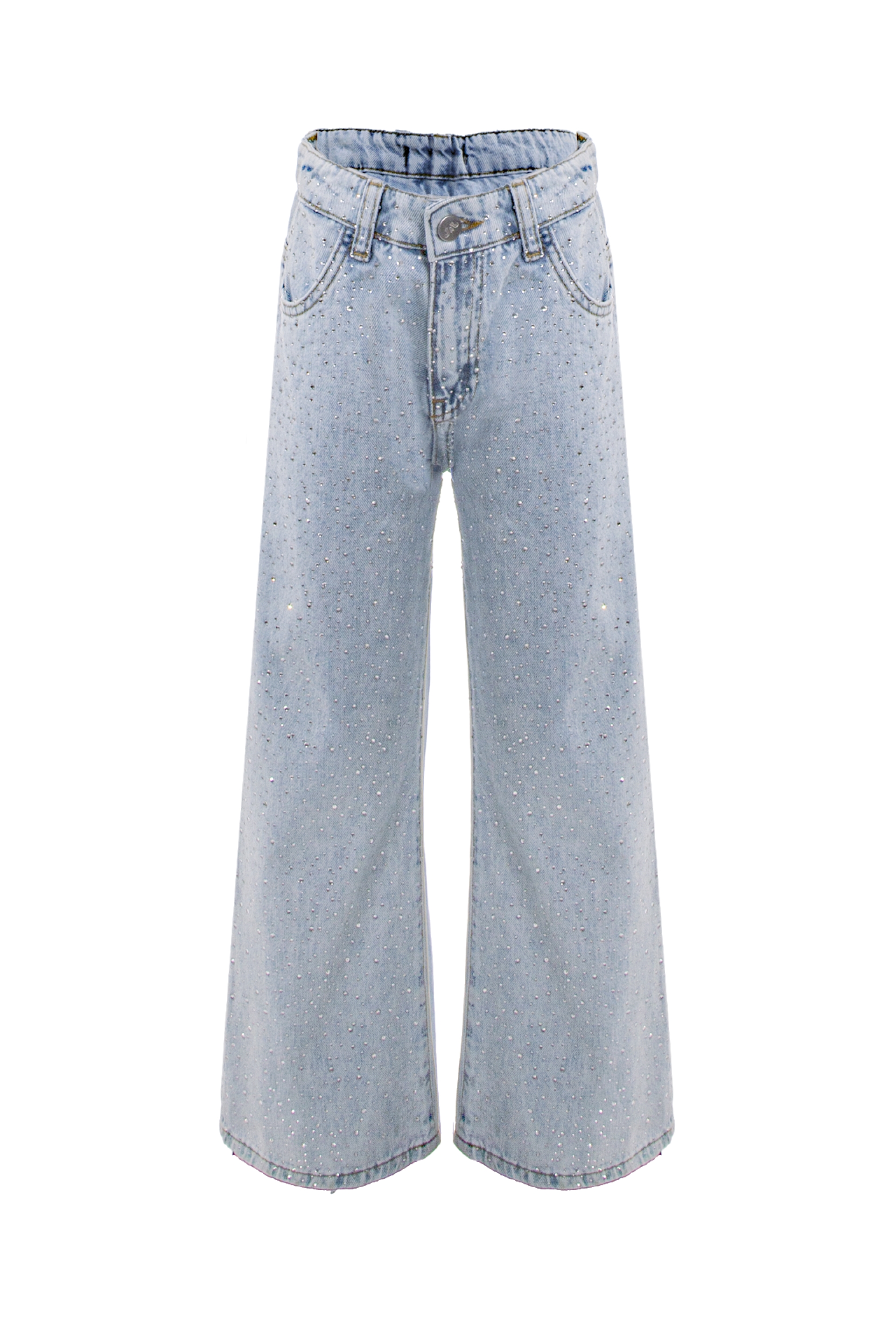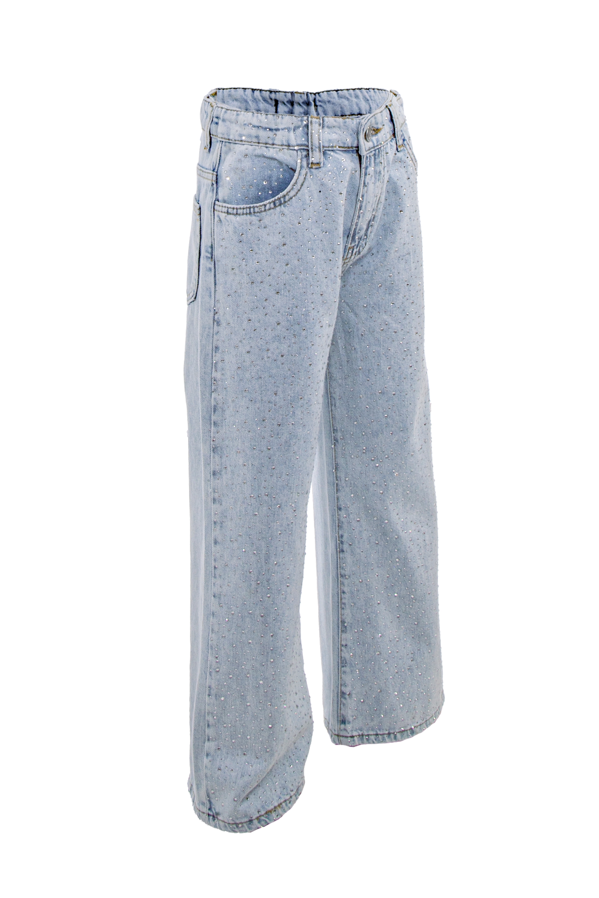 Описание: Детски дънки от мек памучен деним със свободна кройка, с блещукащи камъчета отпред, с регулиращ ластик в талията в светлосин цвят. Закопчават се с цип и копче.