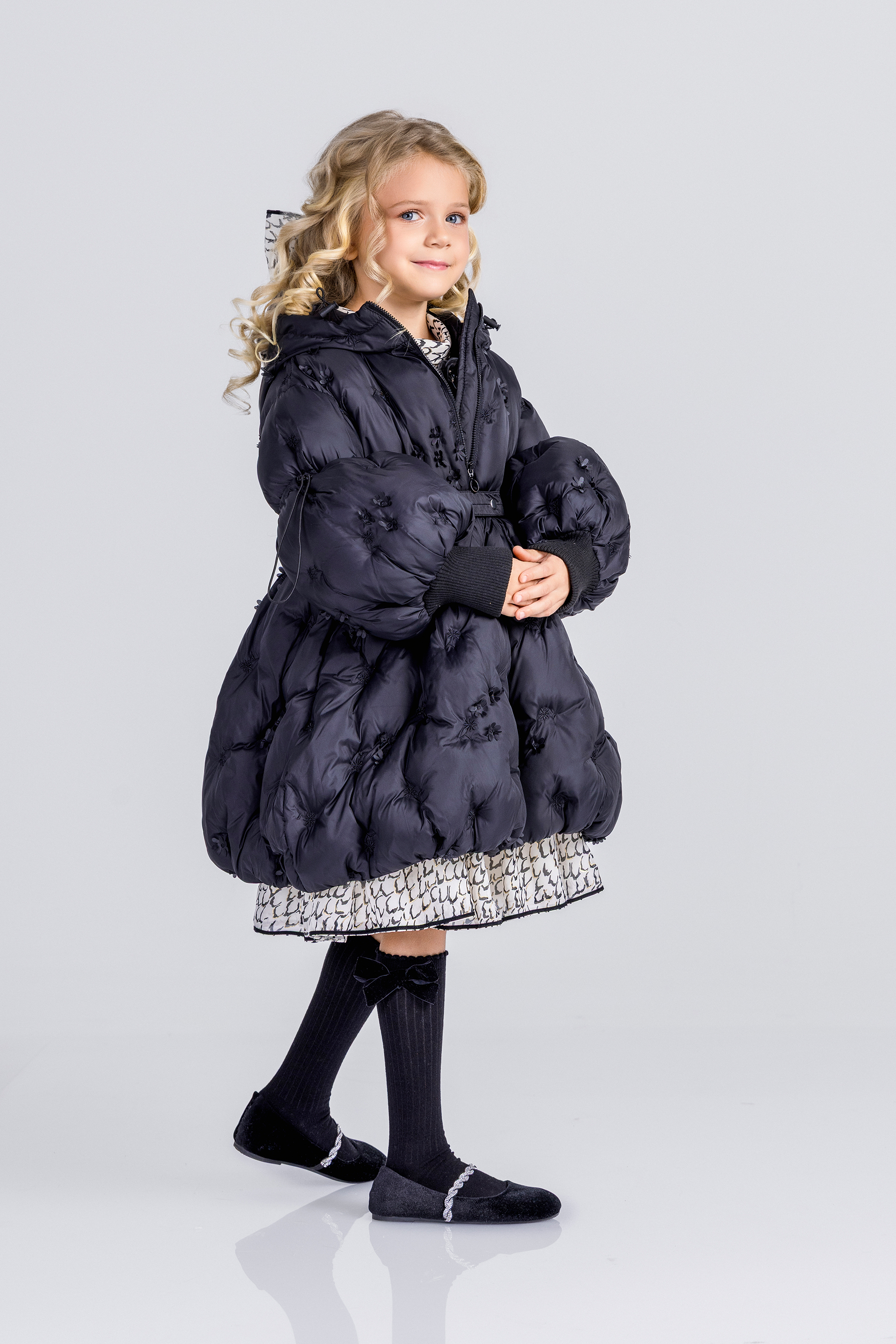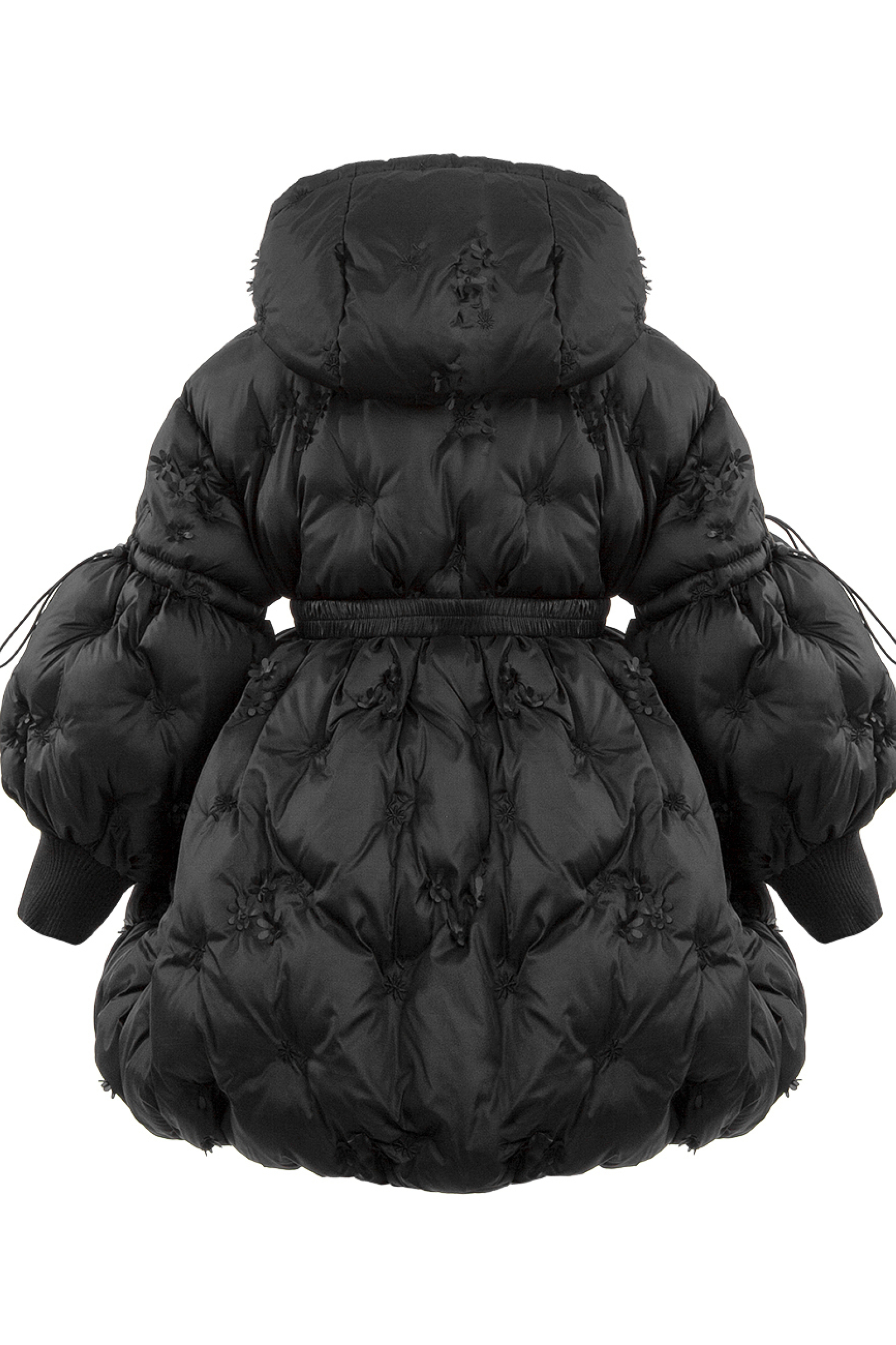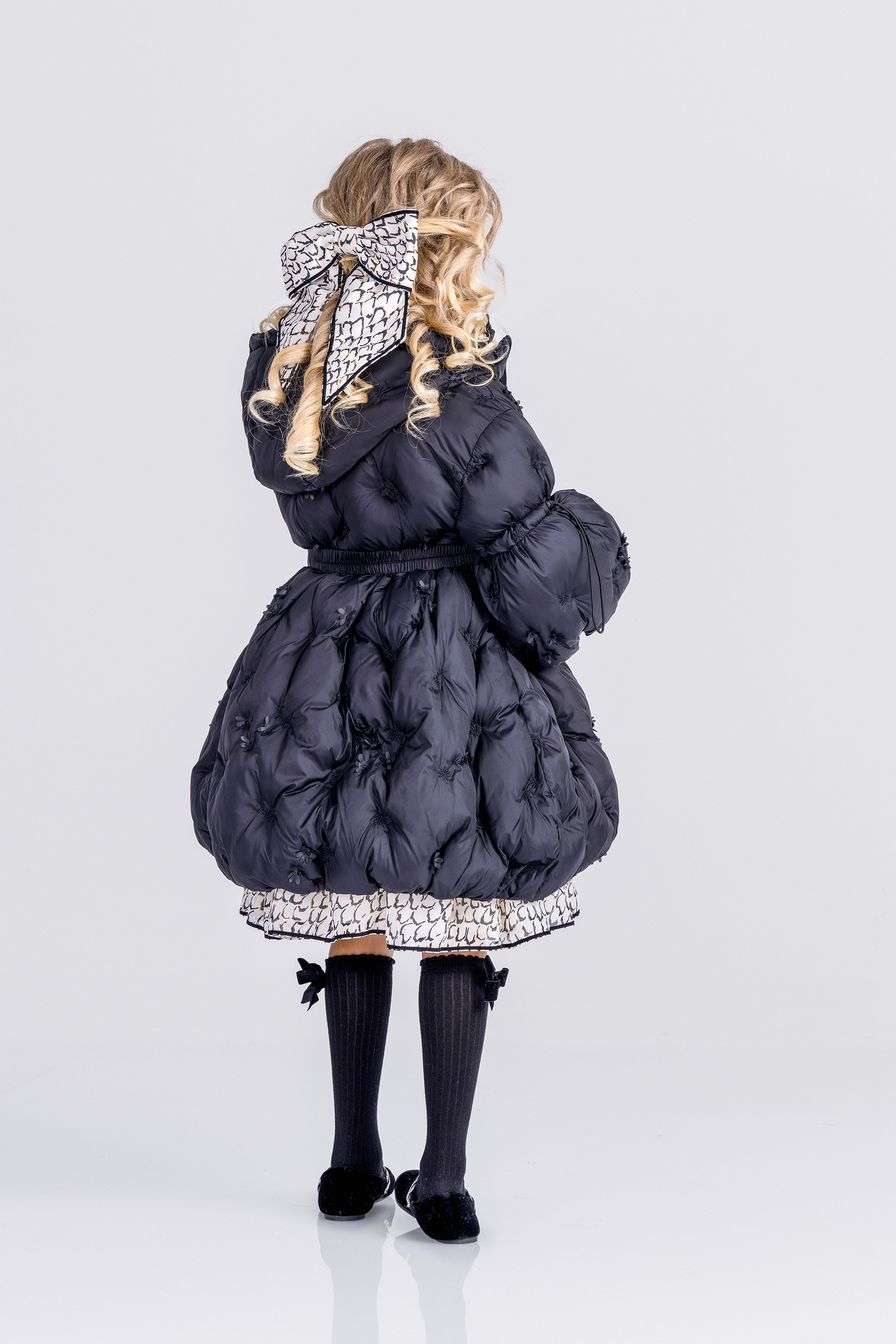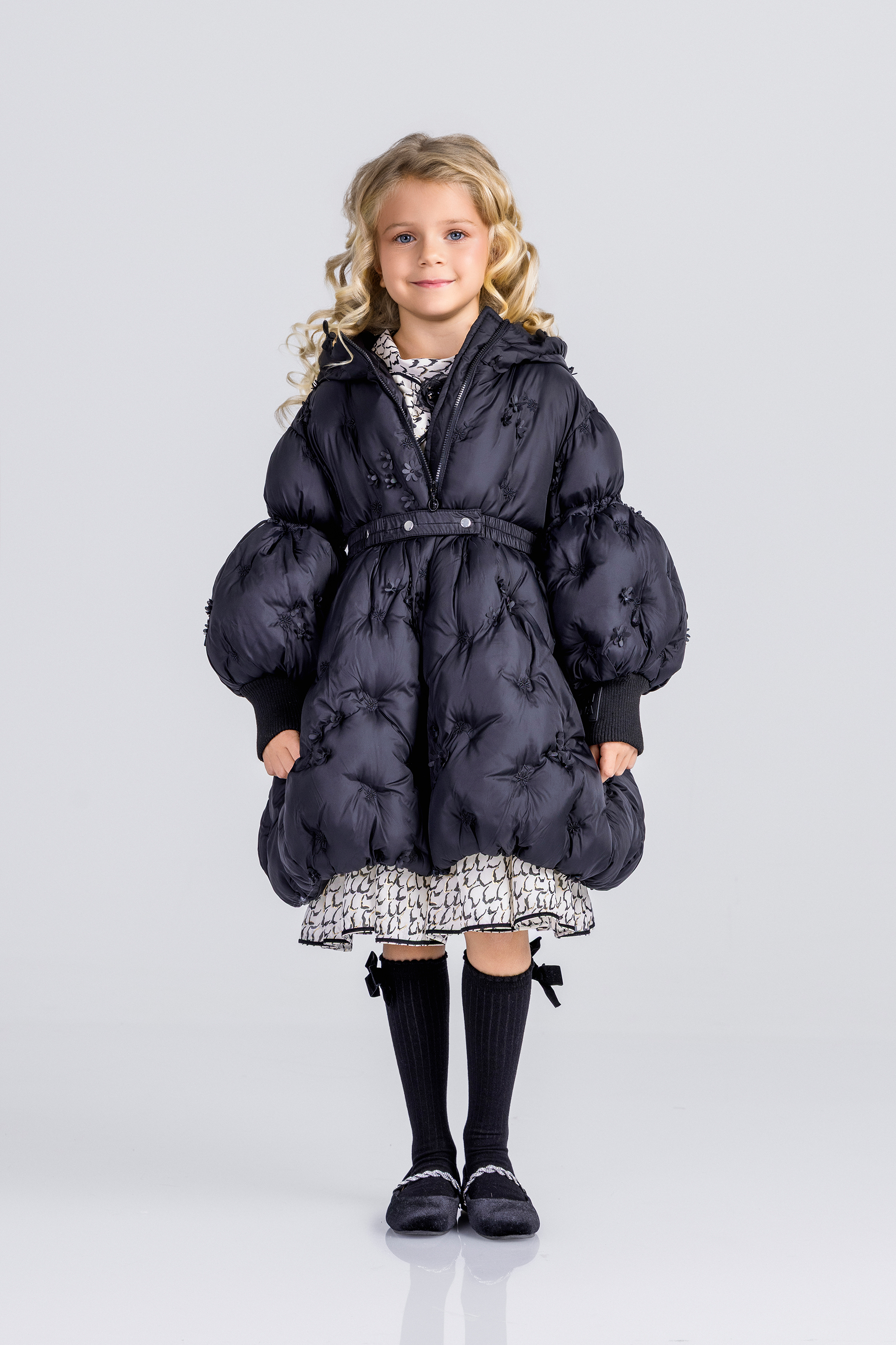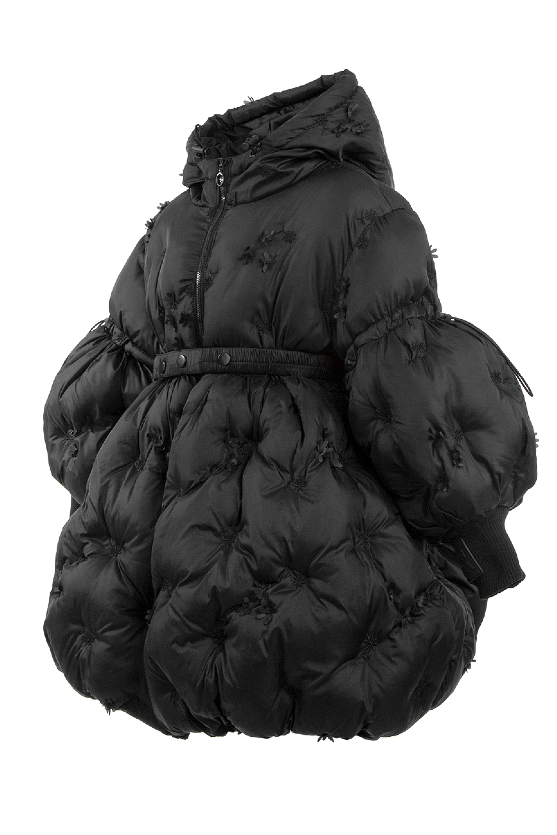Описание: Това е луксозно черно пухено яке от Junona, проектирано с елегантна и игрива естетика. Якето е с сложна бродерия и деликатни 3D флорални орнаменти, които добавят текстура и чар. Дизайнът включва предно закопчаване с цип за практичност, съответстващ колан, който пристяга талията за ласкателен силует, и обемни бухнали ръкави, които добавят драматичен щрих. Логото на Junona е фино релефно върху оребрените маншети на ръкавите, което засилва привлекателността на марката. Това стилно палто е идеално за поддържане на топлината, като същевременно прави впечатление през по-студените сезони.