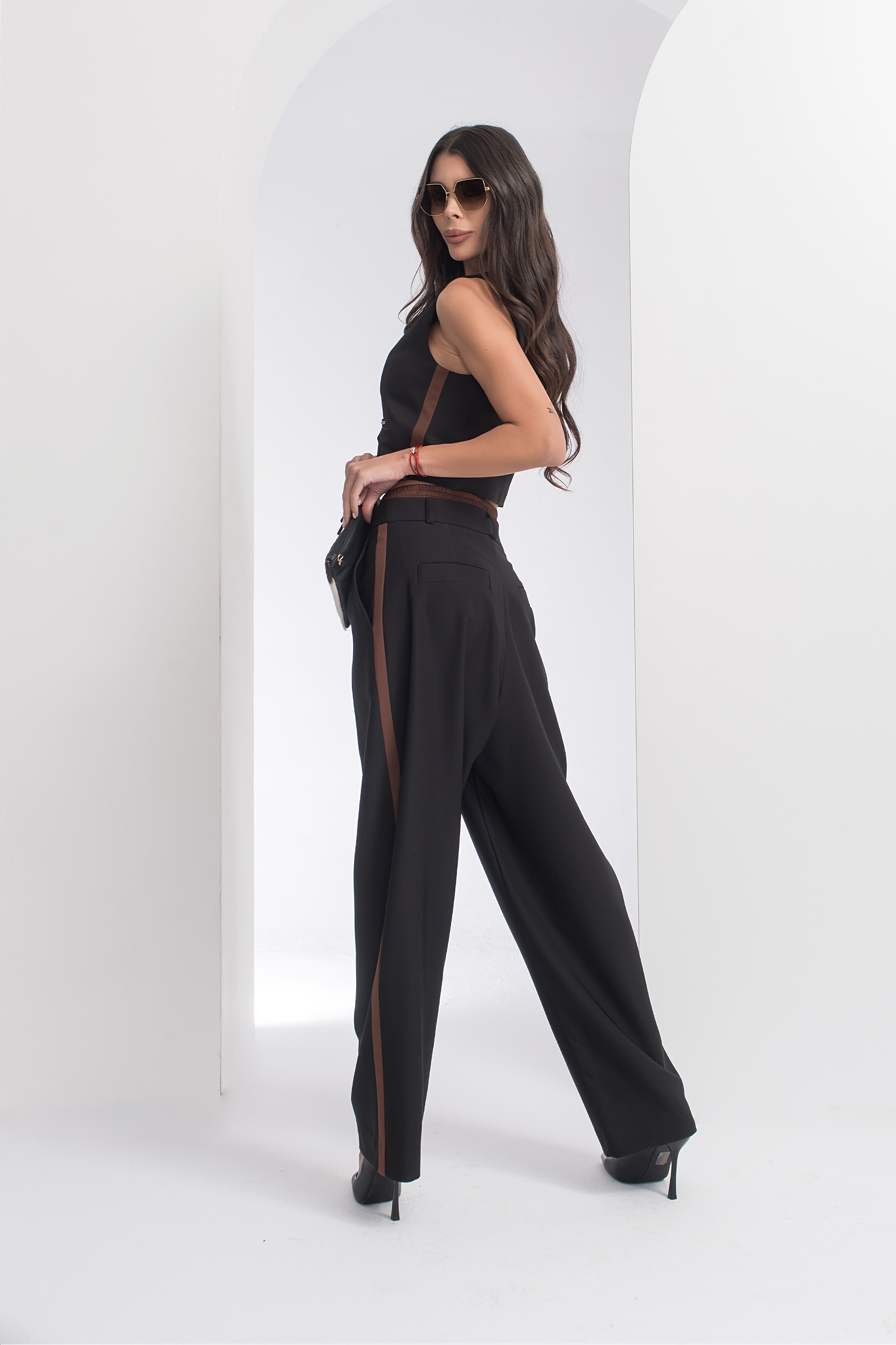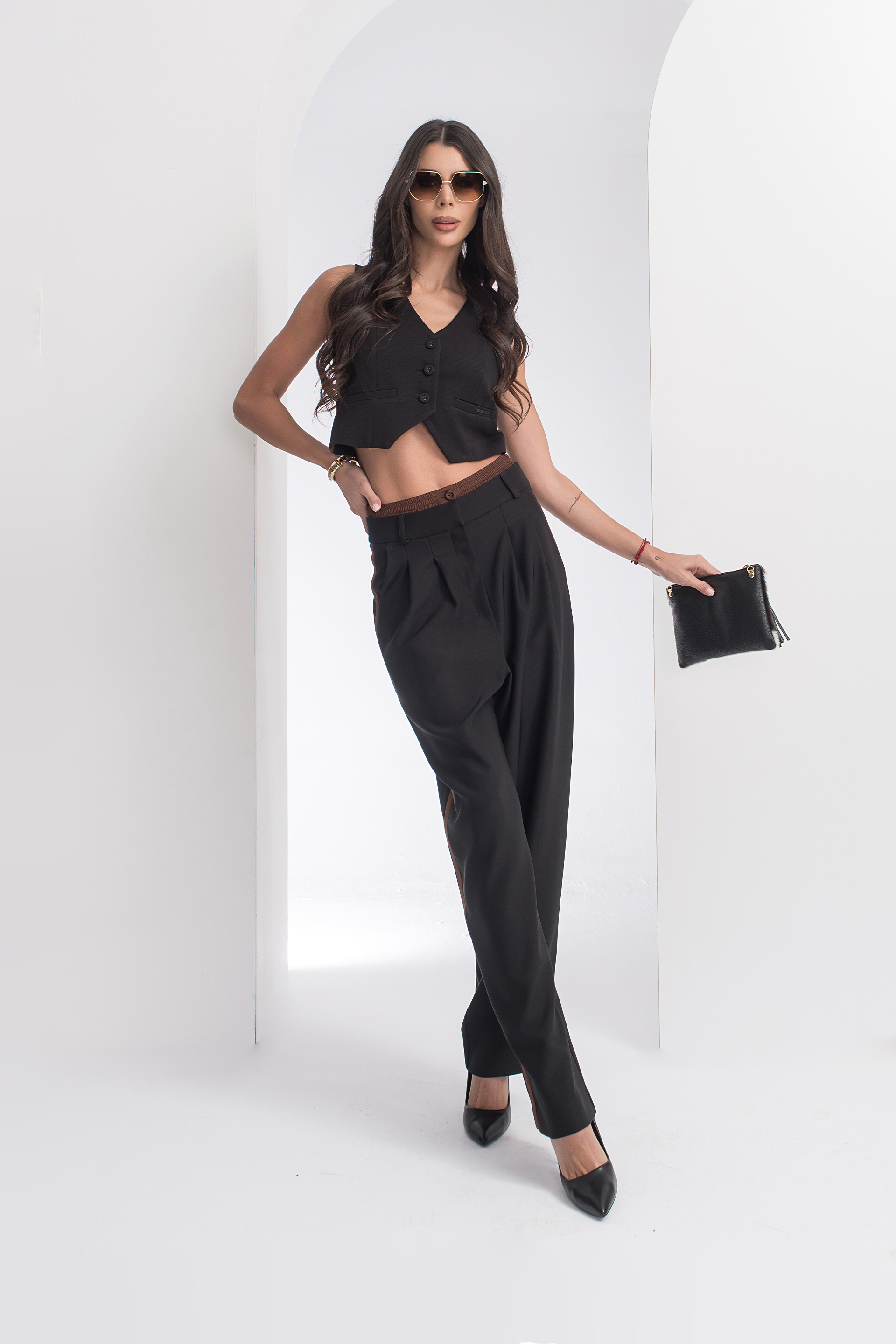 Описание: Къс елек с вталена кройка, шпиц деколте и декоративни джобове. Закопчаване с копчета отпред и акцент кант от двата странични края на артикула.