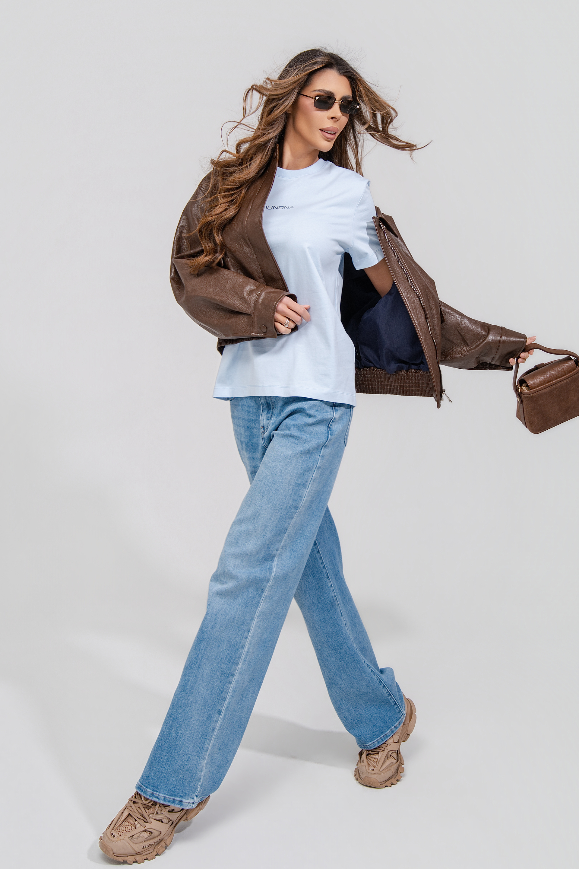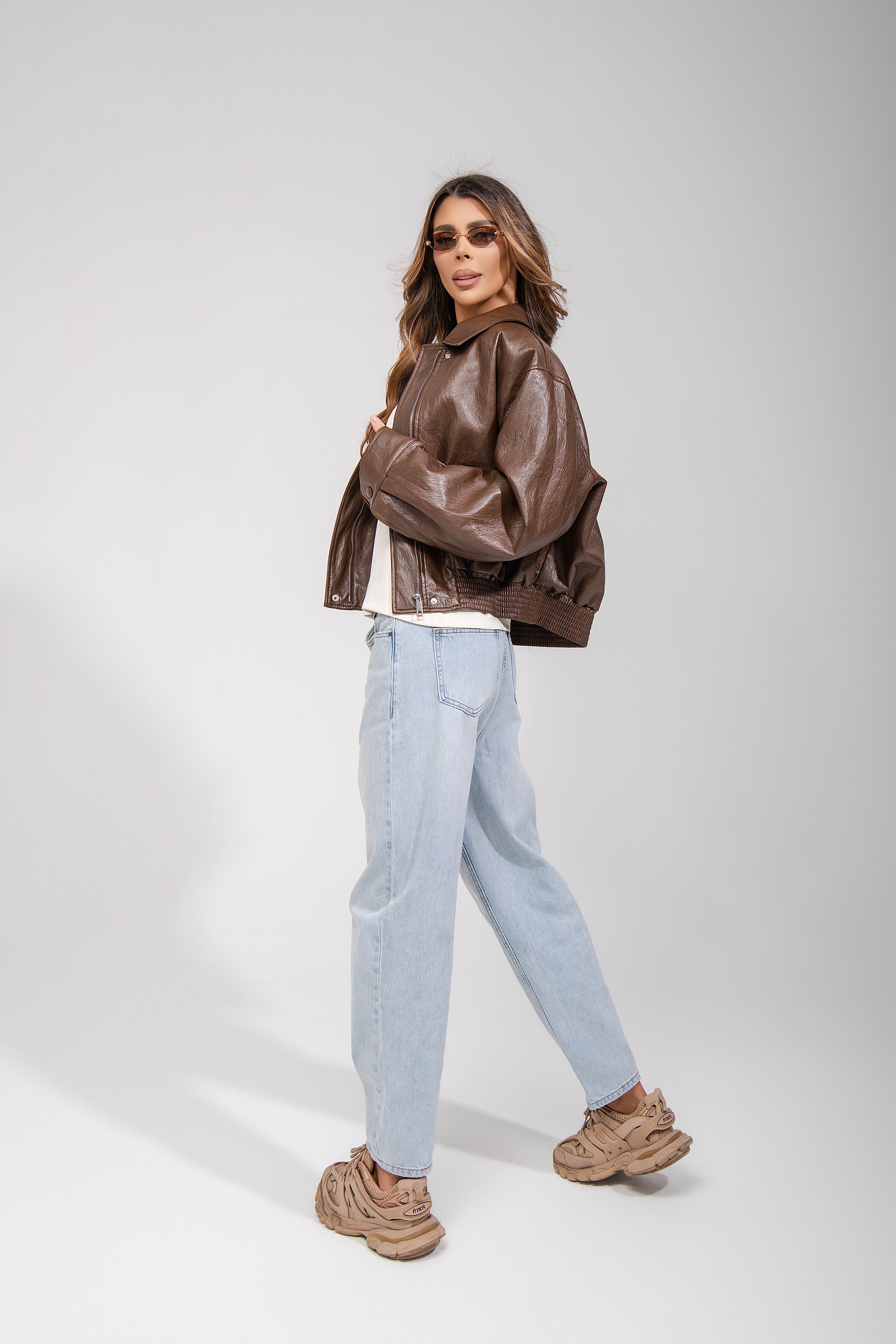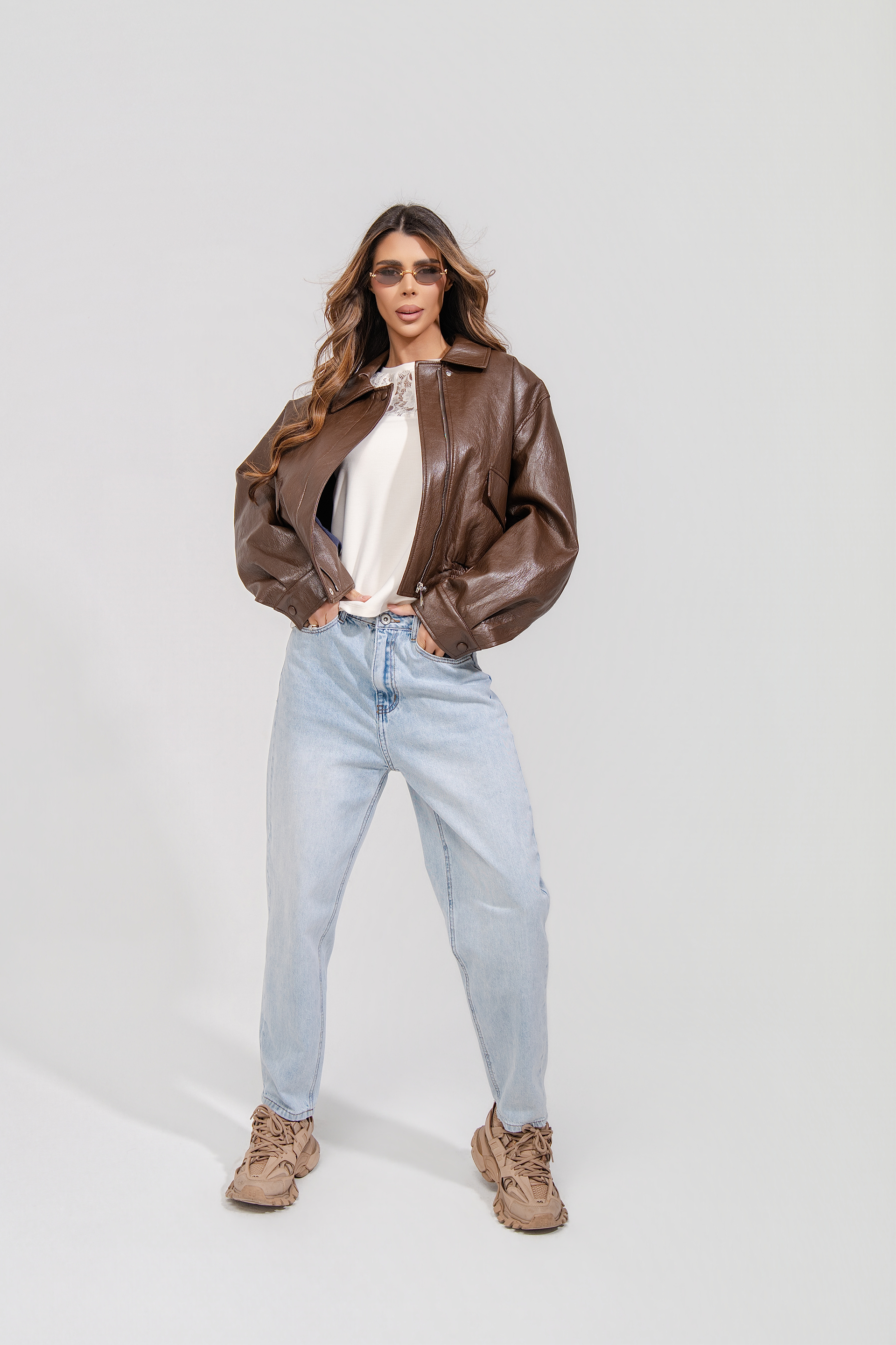 Описание: Яке от изкуствена кожа с висока яка и дълги ръкави с копче. Предни джобове с капаци. Вътрешна подплата от различна материя в тон. Закопчаване отпред със скрит цип и копчета.