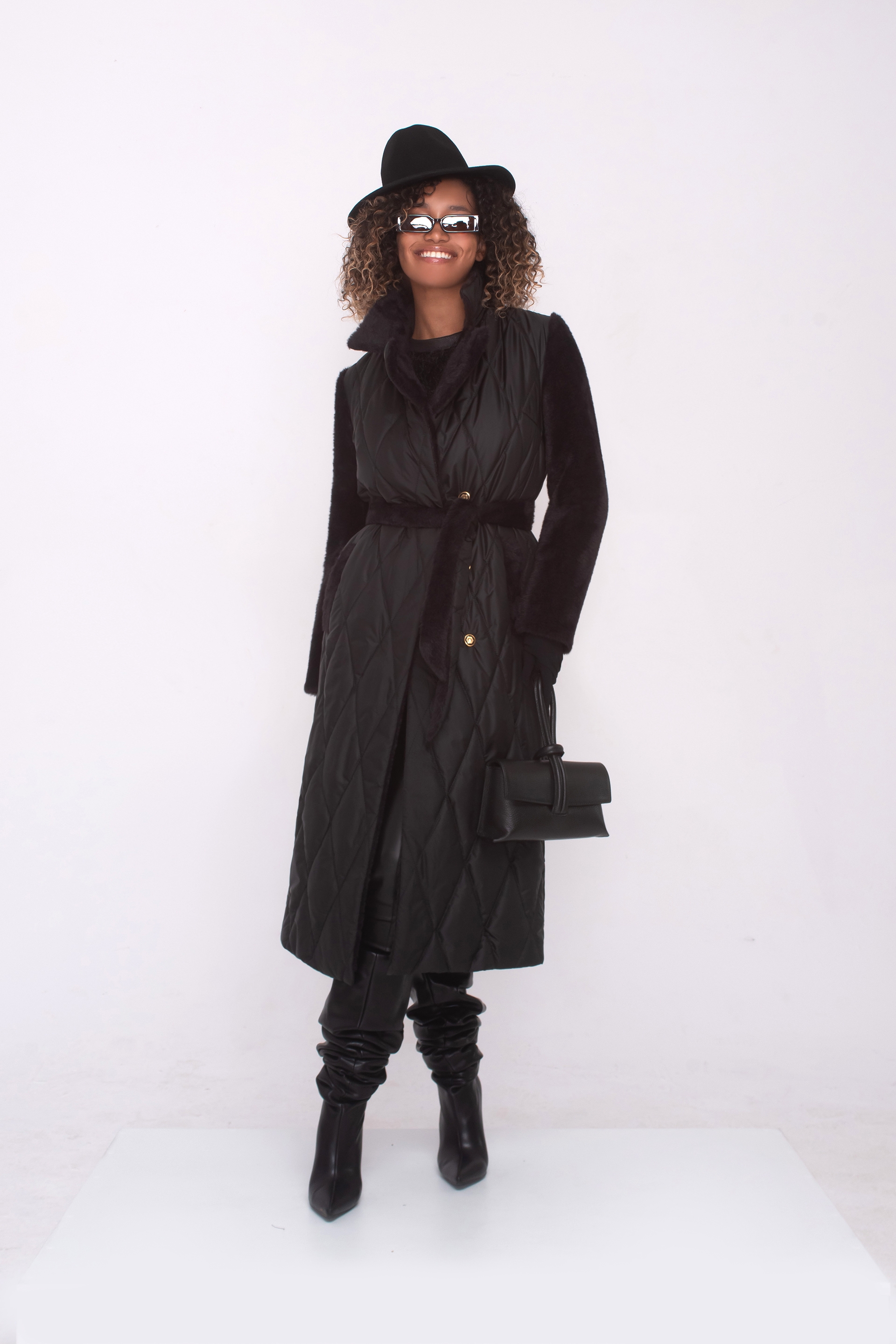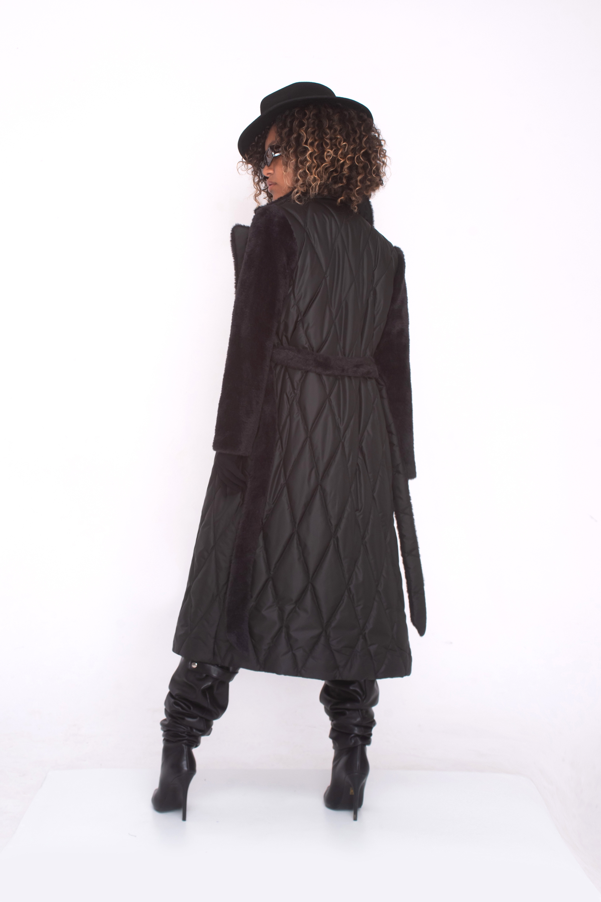 С изтънчена кройка, съчетаваща шушляк и полар, това палто пада елегантно под коляното и е с двуредово закопчаване. Яката е с ревери, а в областта на талията има колан, който подчертава фигурата и придава комфорт.