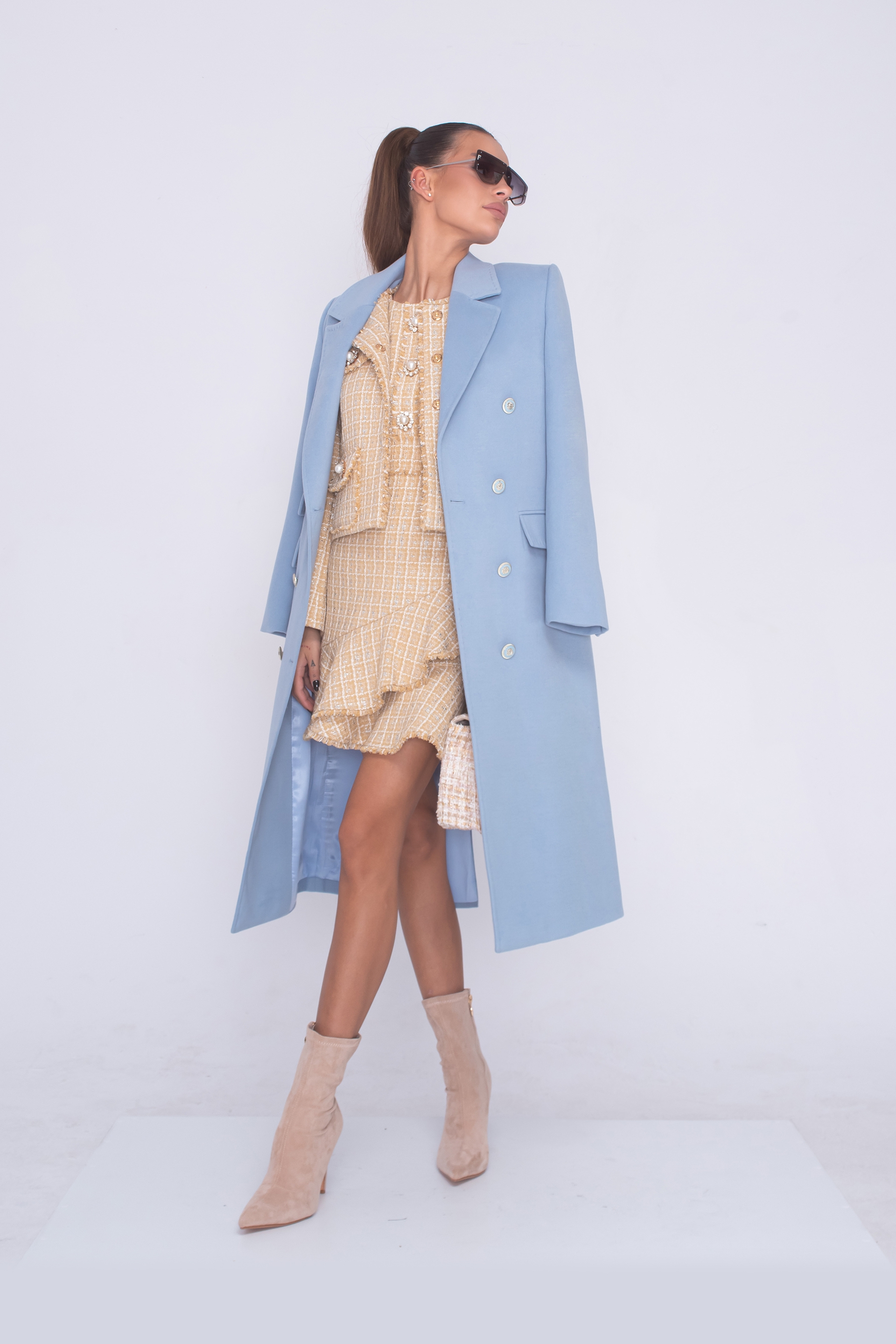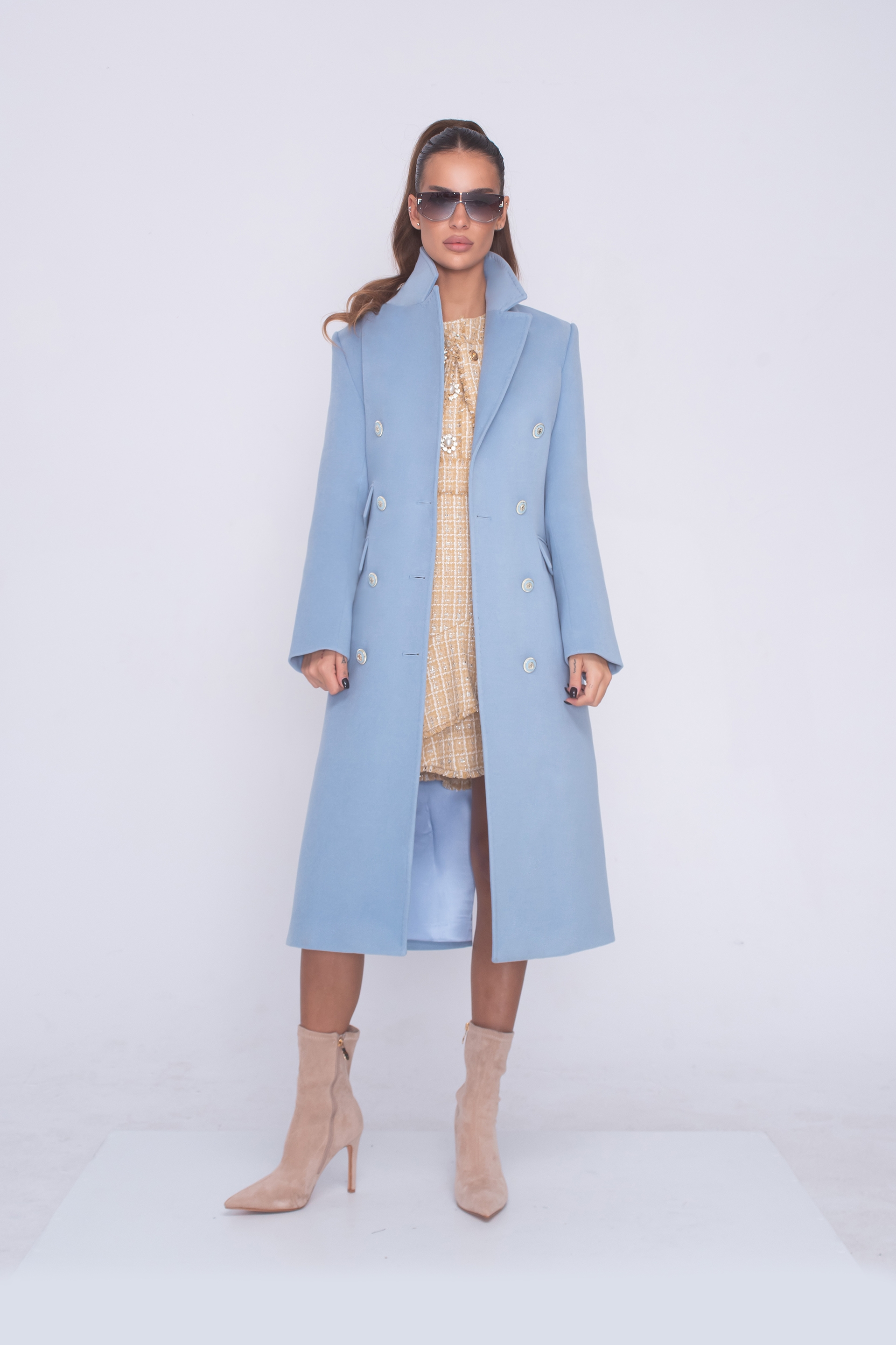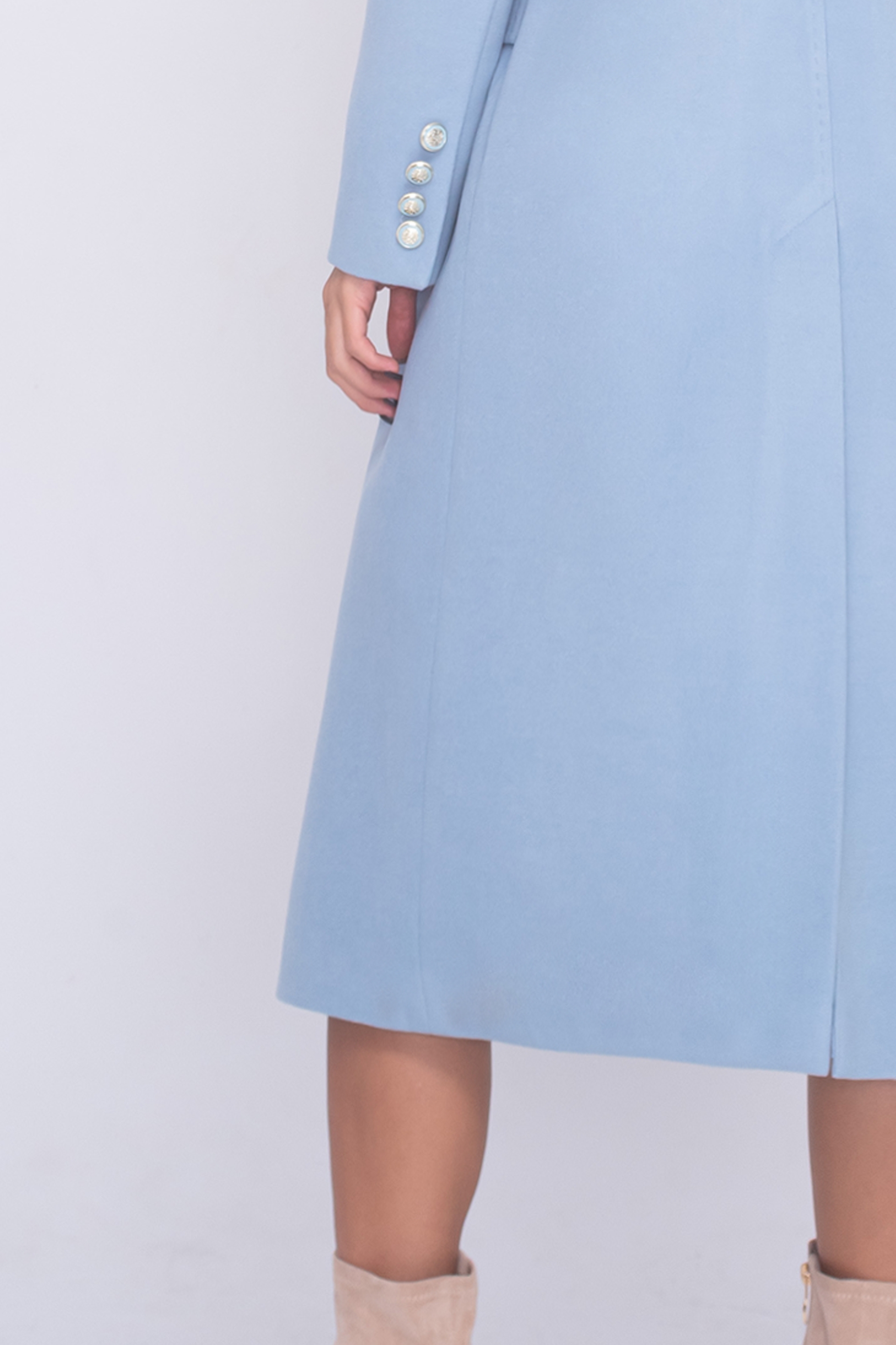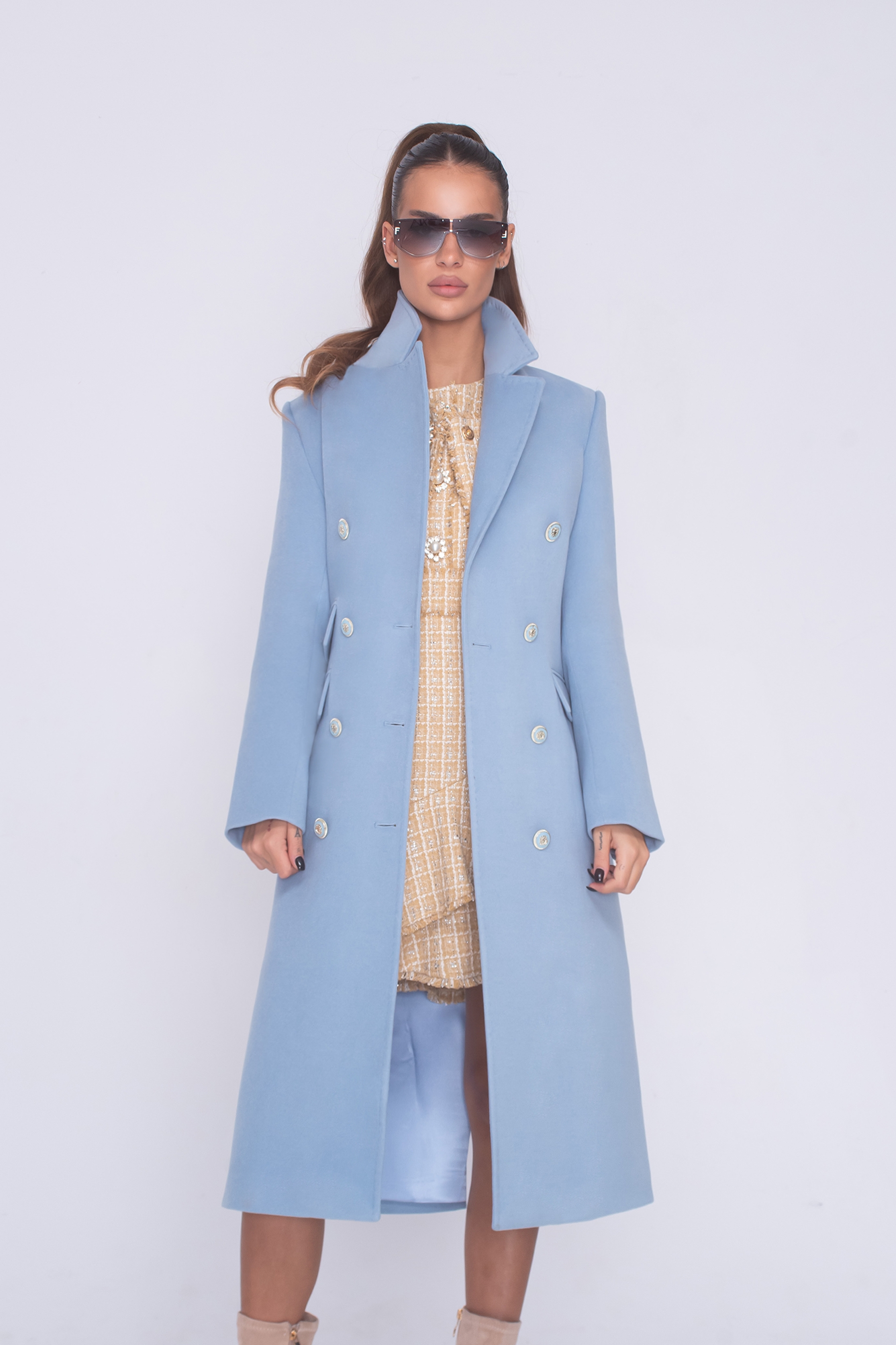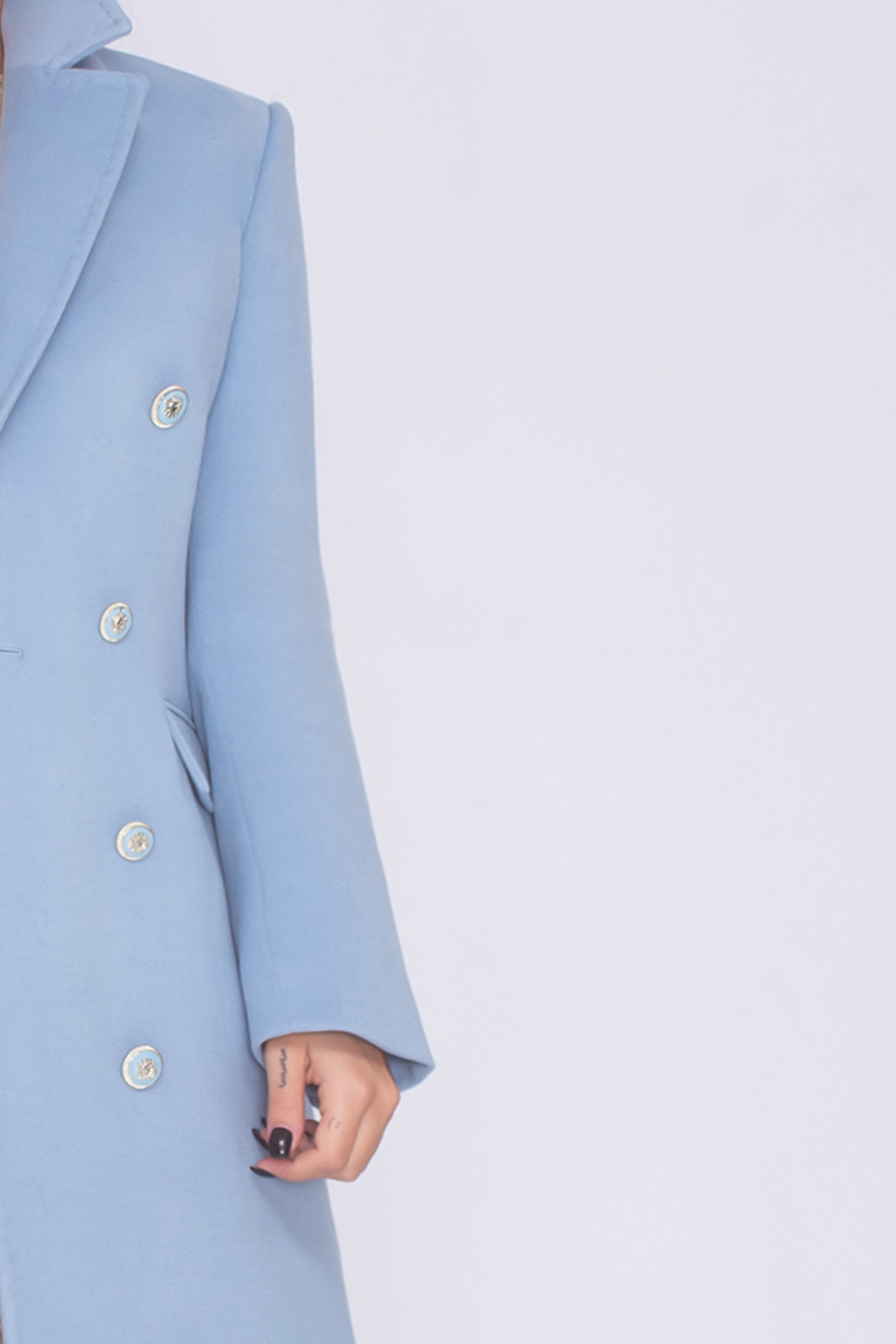 Описание: Палтото разполага с изтънчена кройка, която пада елегантно под коляното а в предната част има три джоба. Яката е с ревери а закопчаването е двуредово.