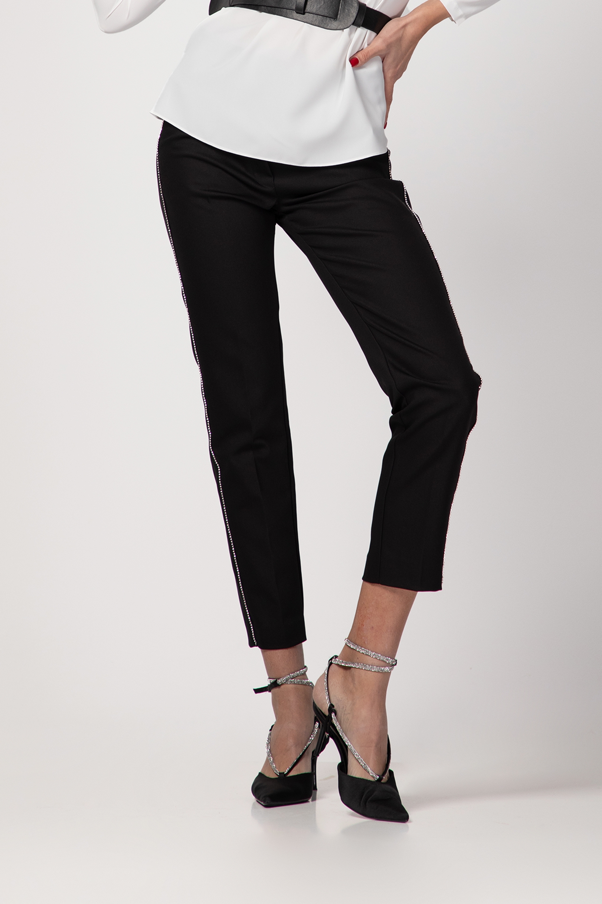 Описание: Елегантен панталон с висока талия, стеснена кройка, два предни и два декоративни задни джоба. Артикулът е със светъл кант от камъни по страничните ръбове и капаци в областта на талията. Закопчаване с цип и секретна гайка отпред.