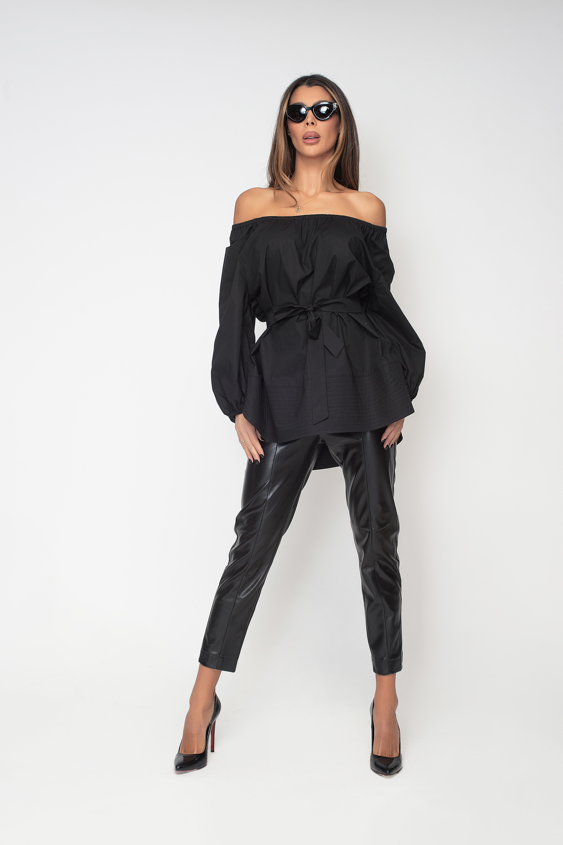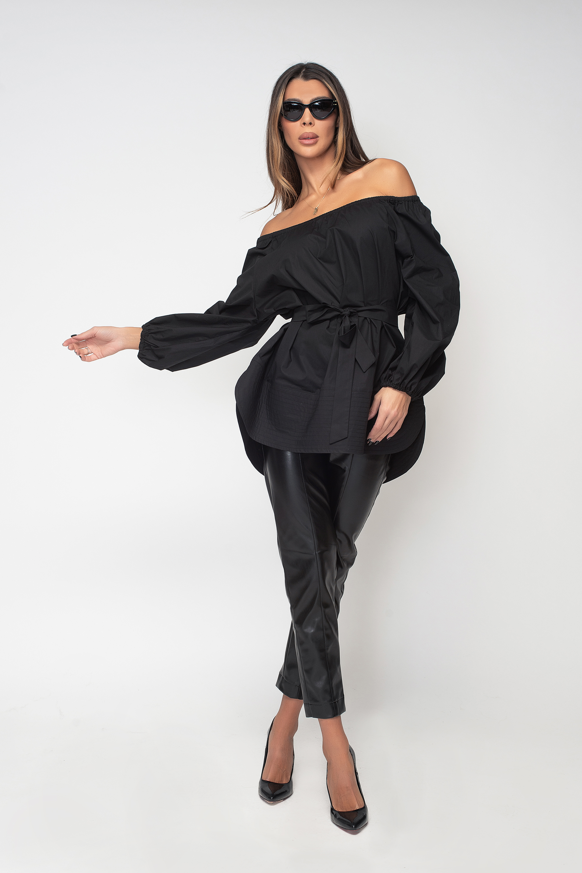 Описание: Риза тип туника изработена от памучна материя. С голи рамене и дълъг ръкав с ластичен маншет. Капитонирана долна част и колан от същата материя.