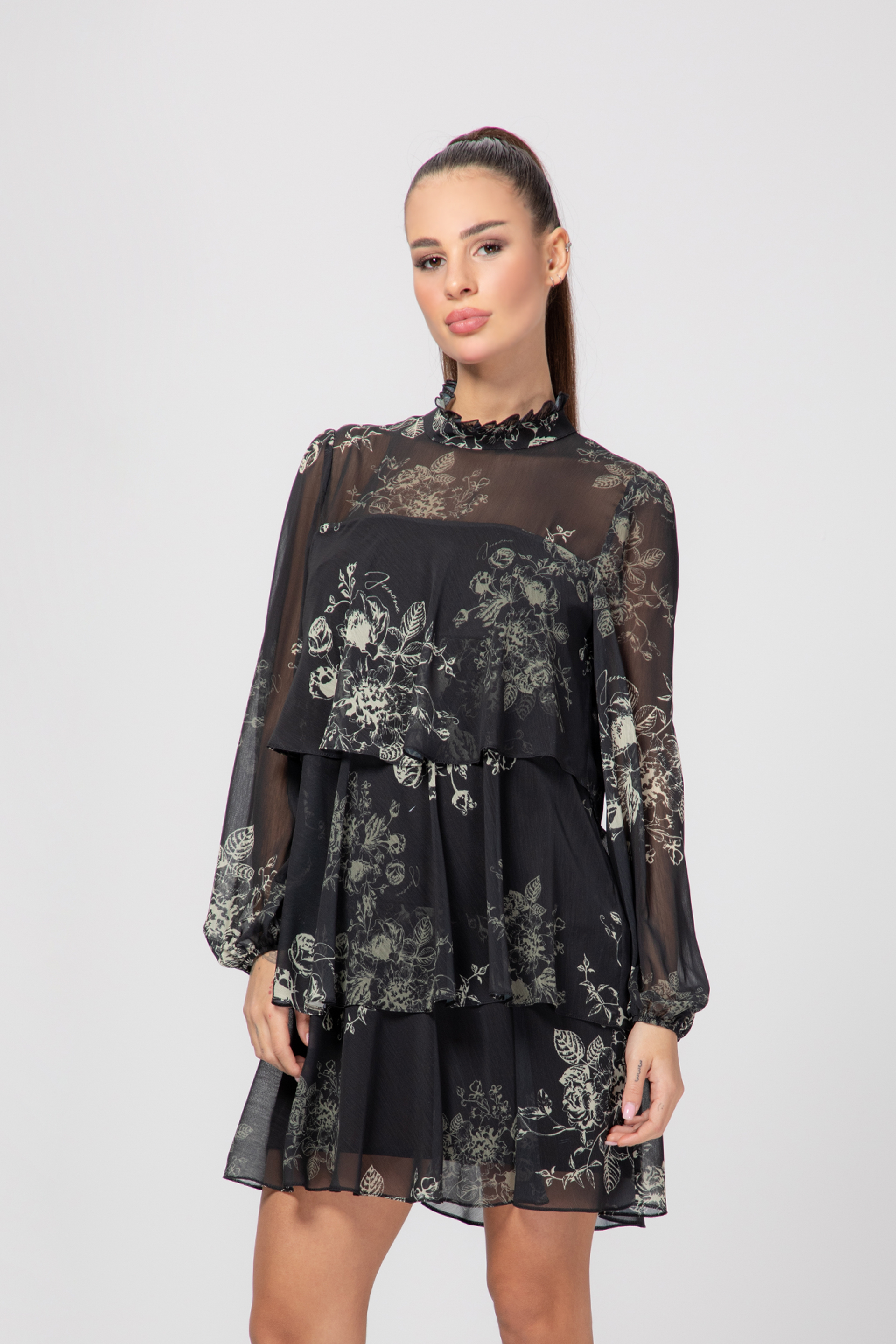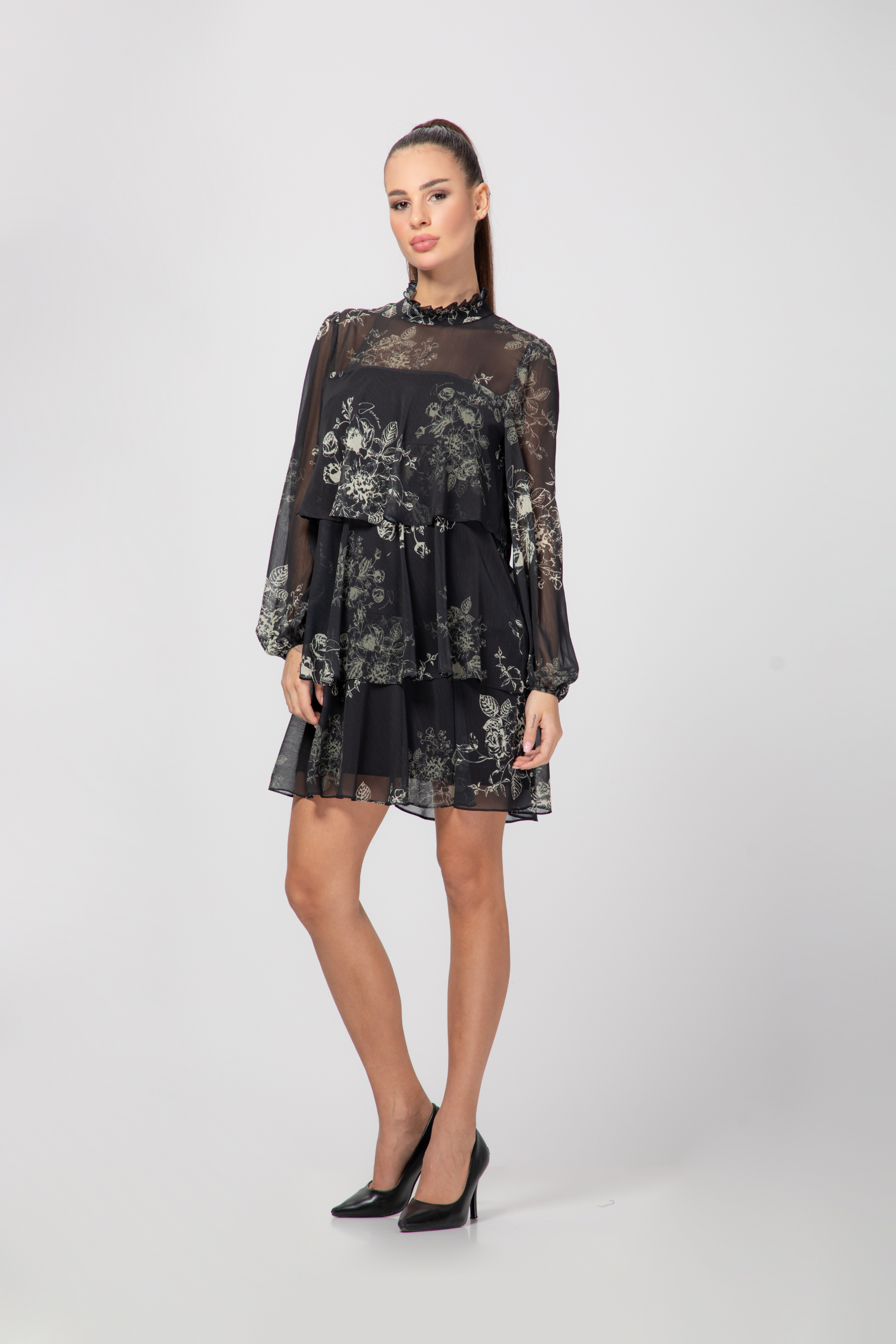 Описание: Елегантна рокля изработена от ефирна материя, със свободен силует, падащ до средата на бедрото и поло яка с къдра. Артикулът е с волани на няколко нива, подплата и дълъг буфон ръкав с ластик.