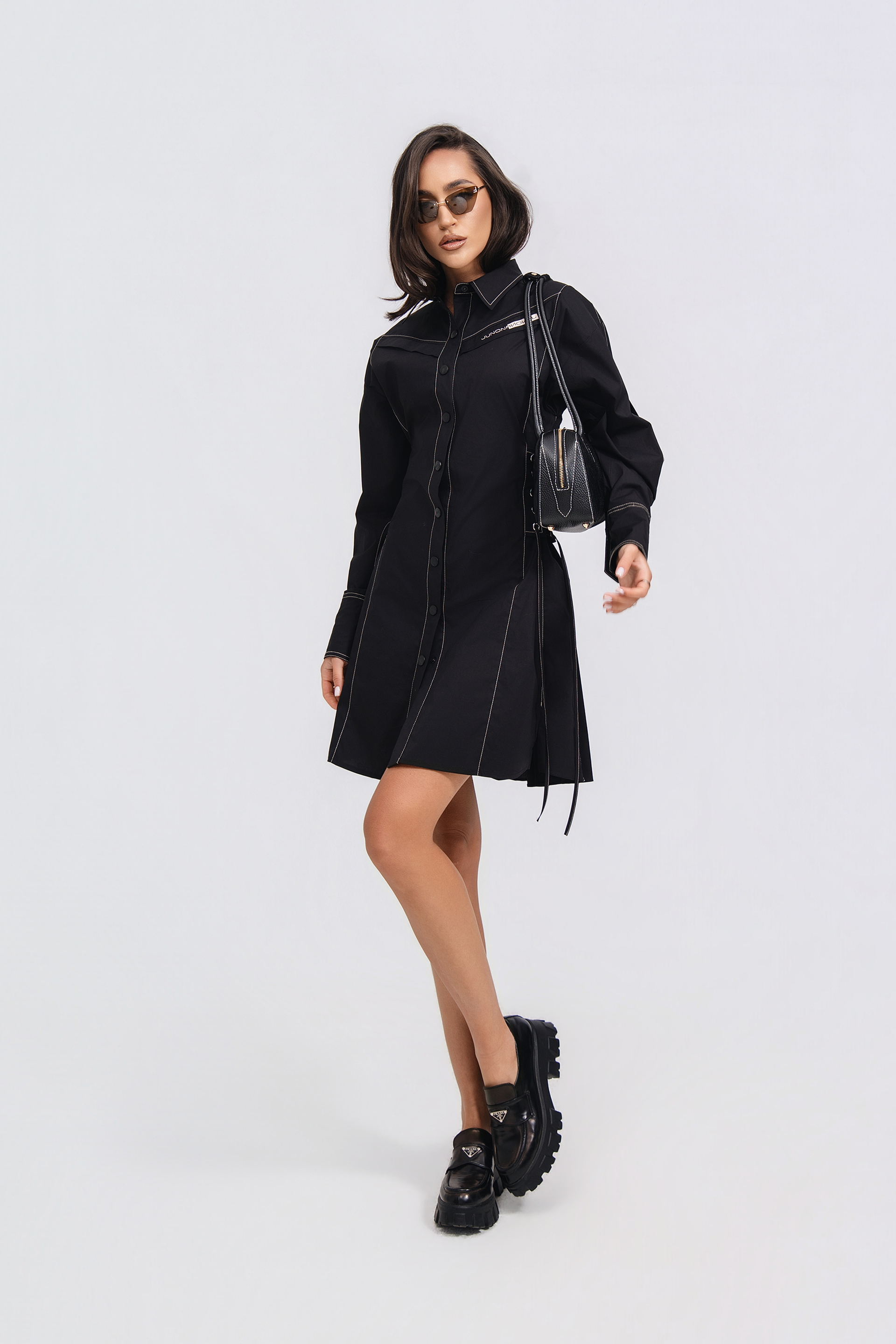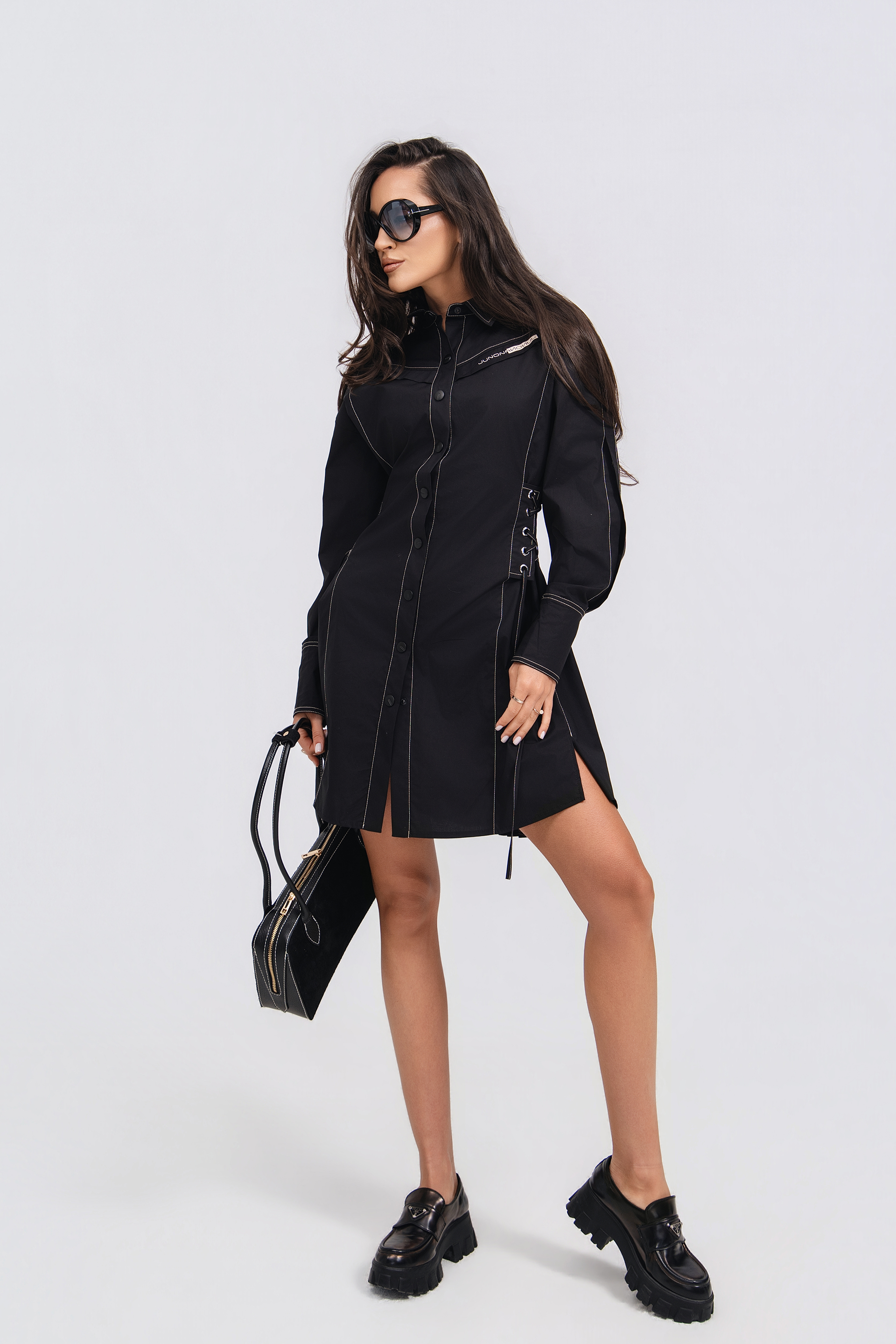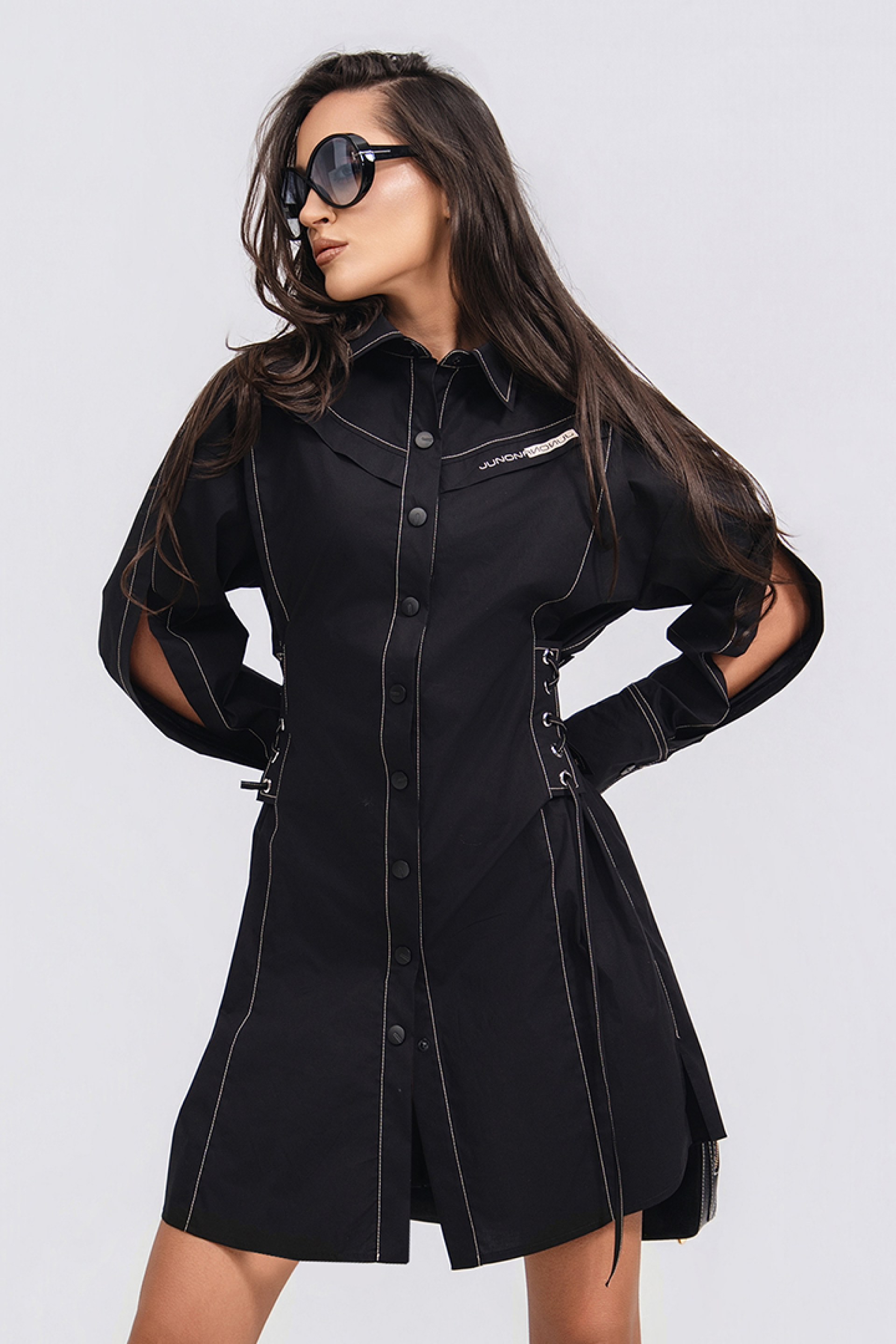 Описание: Къса рокля Junona от памучна тъкан. С дълги ръкави с прорези и яка. Връзки в областта на талията и плисета в задната част. Закопчаване с копчета отпред.