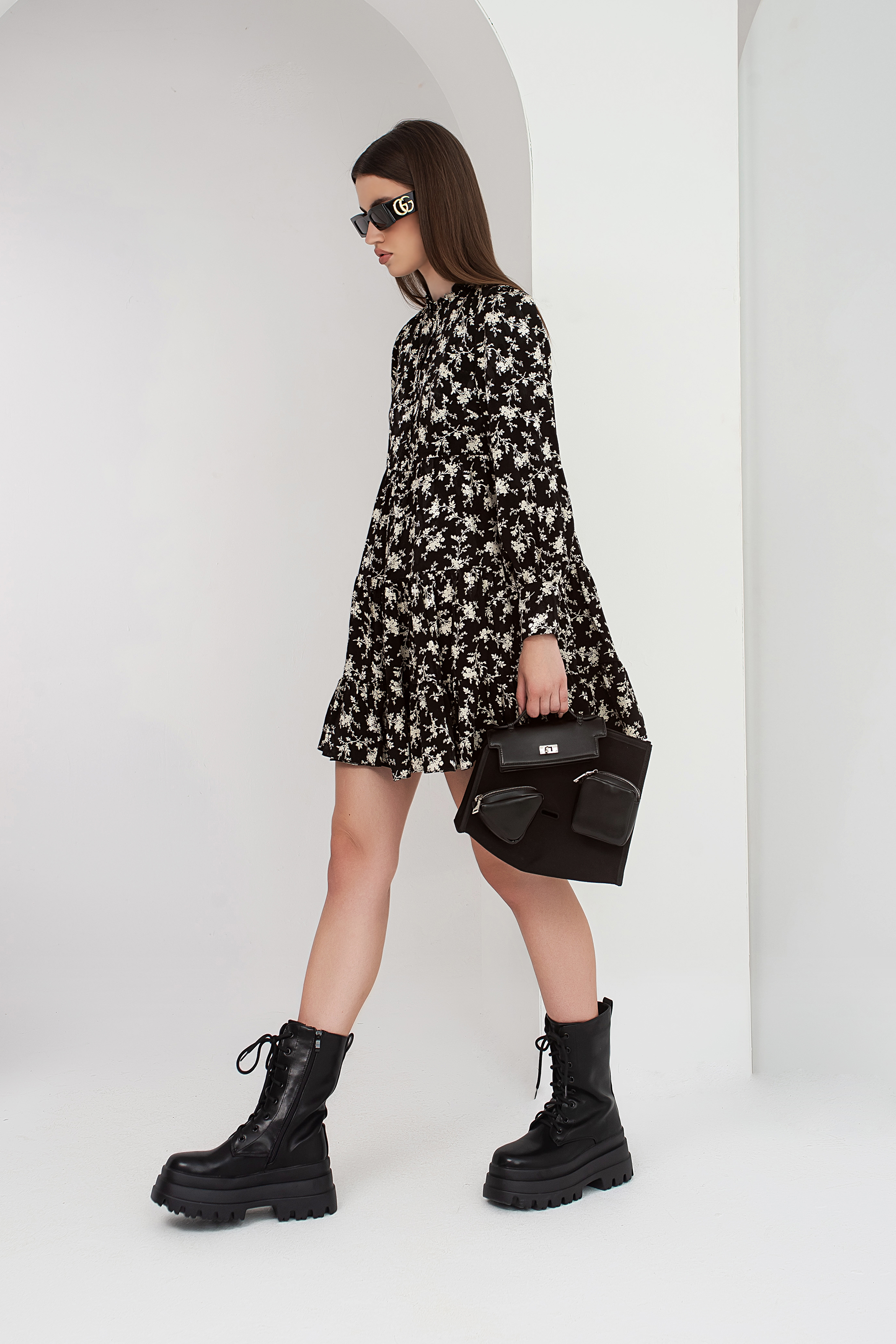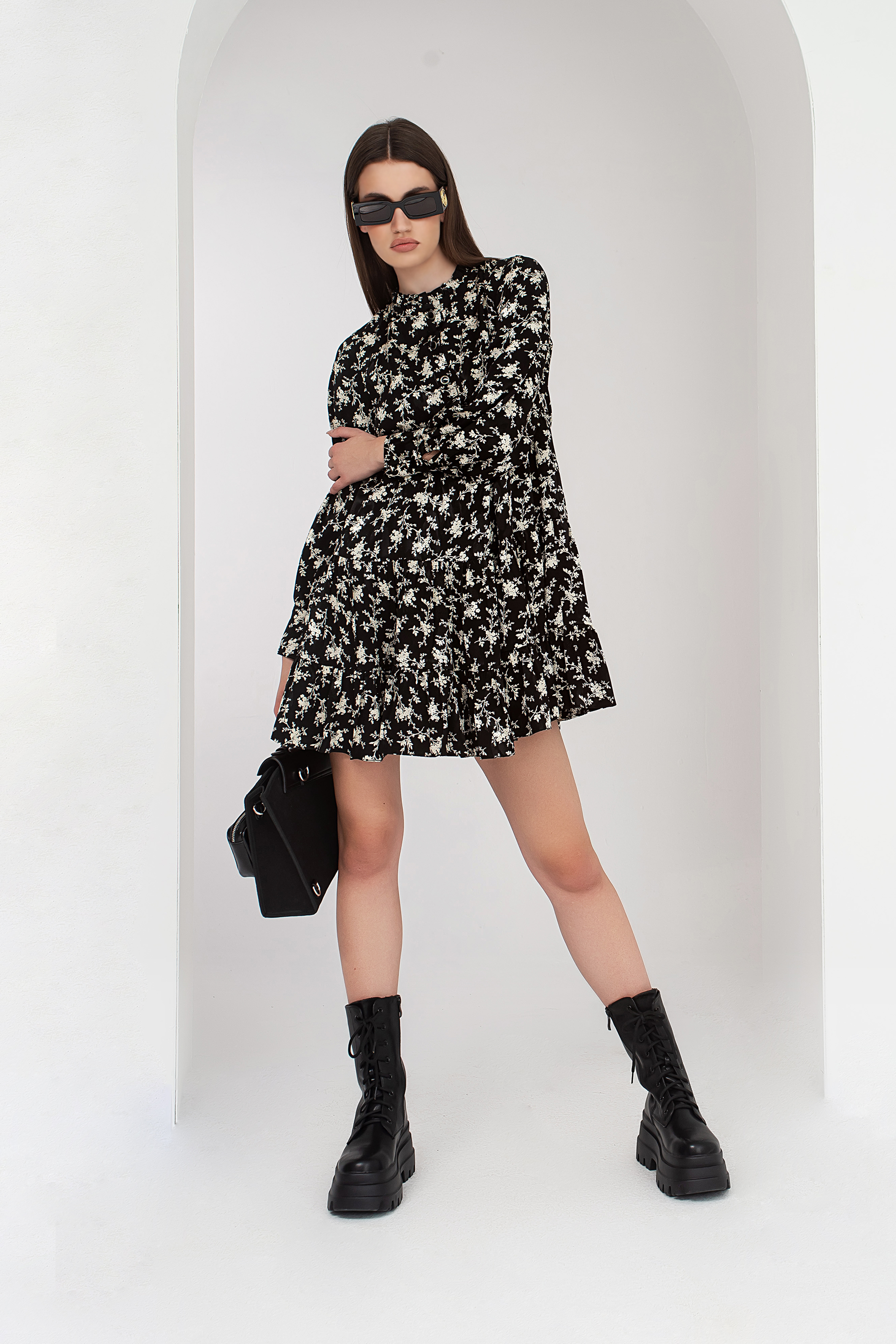 Описание: Рокля в монохромен десен със свободна кройка, падаща до средата на бедрото, подплата и дълъг ръкав. Набор в долната част и закопчаване с копчета до средата в предната част.