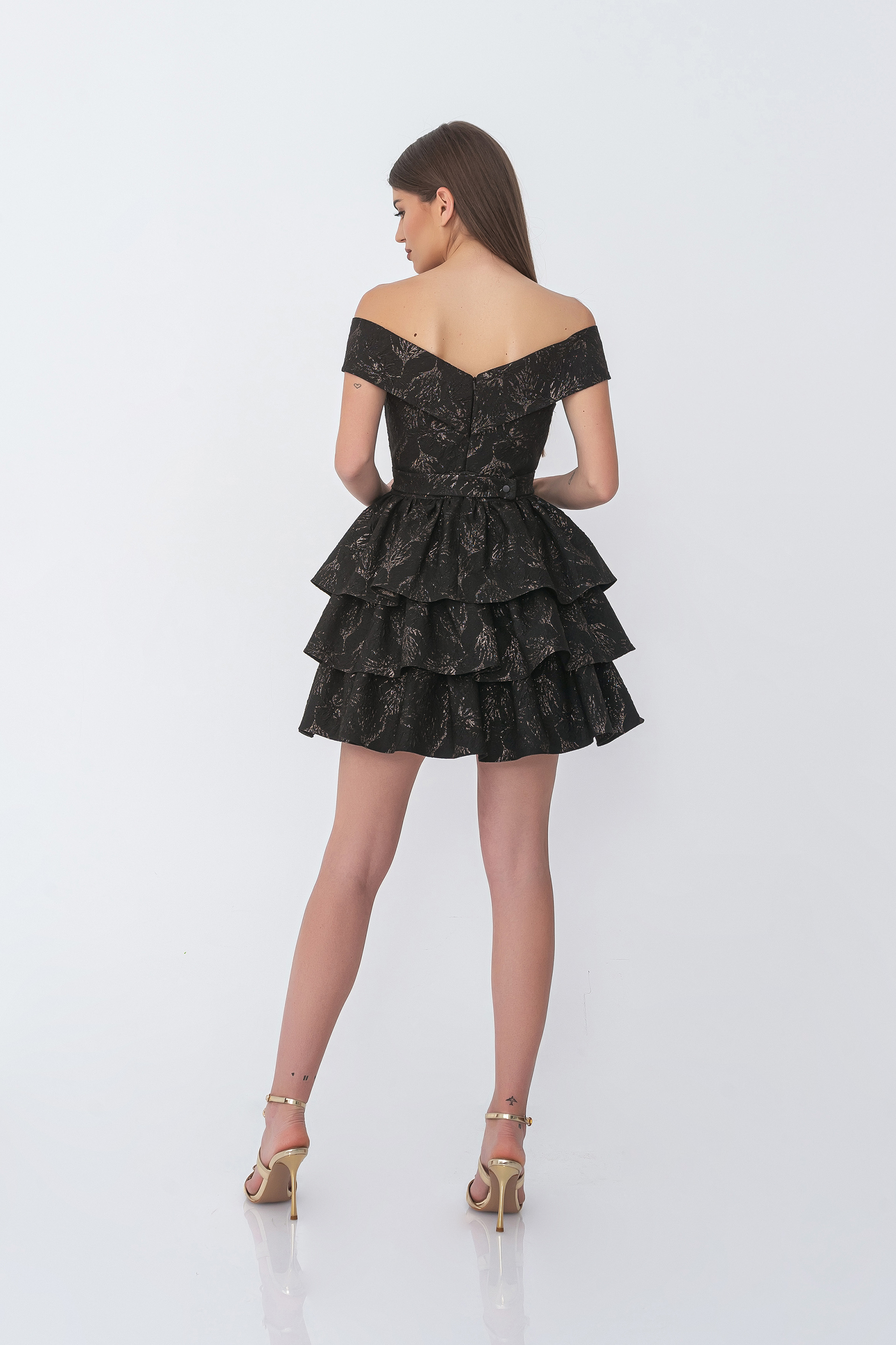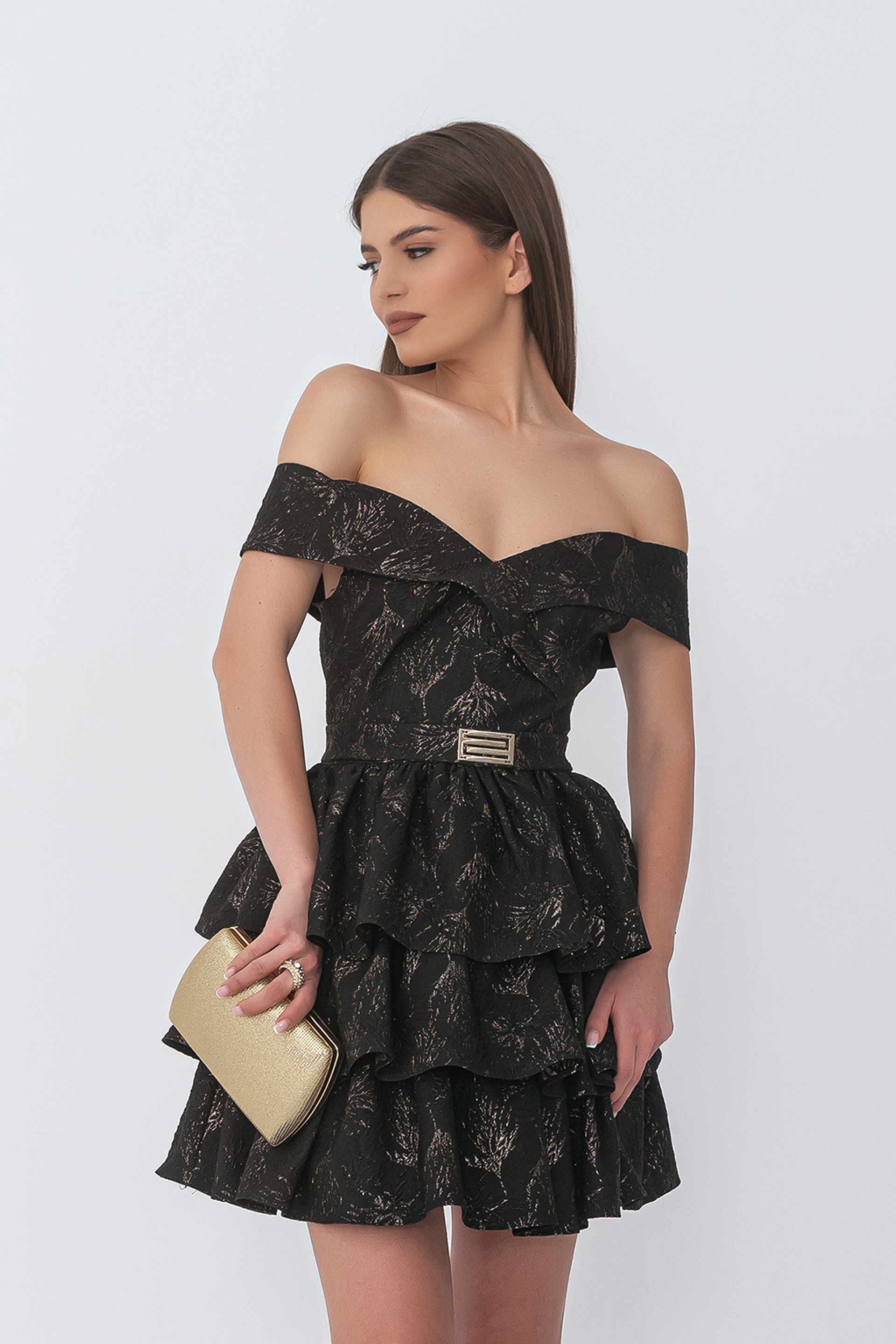 Описание: Елегантна рокля от релефен жакард с паднали рамене и вталена кройка на волани, падаща до средата на бедрото. Артикулът се закопчава със скрит цип в задната част и колан с метален детайл в същия десен.
