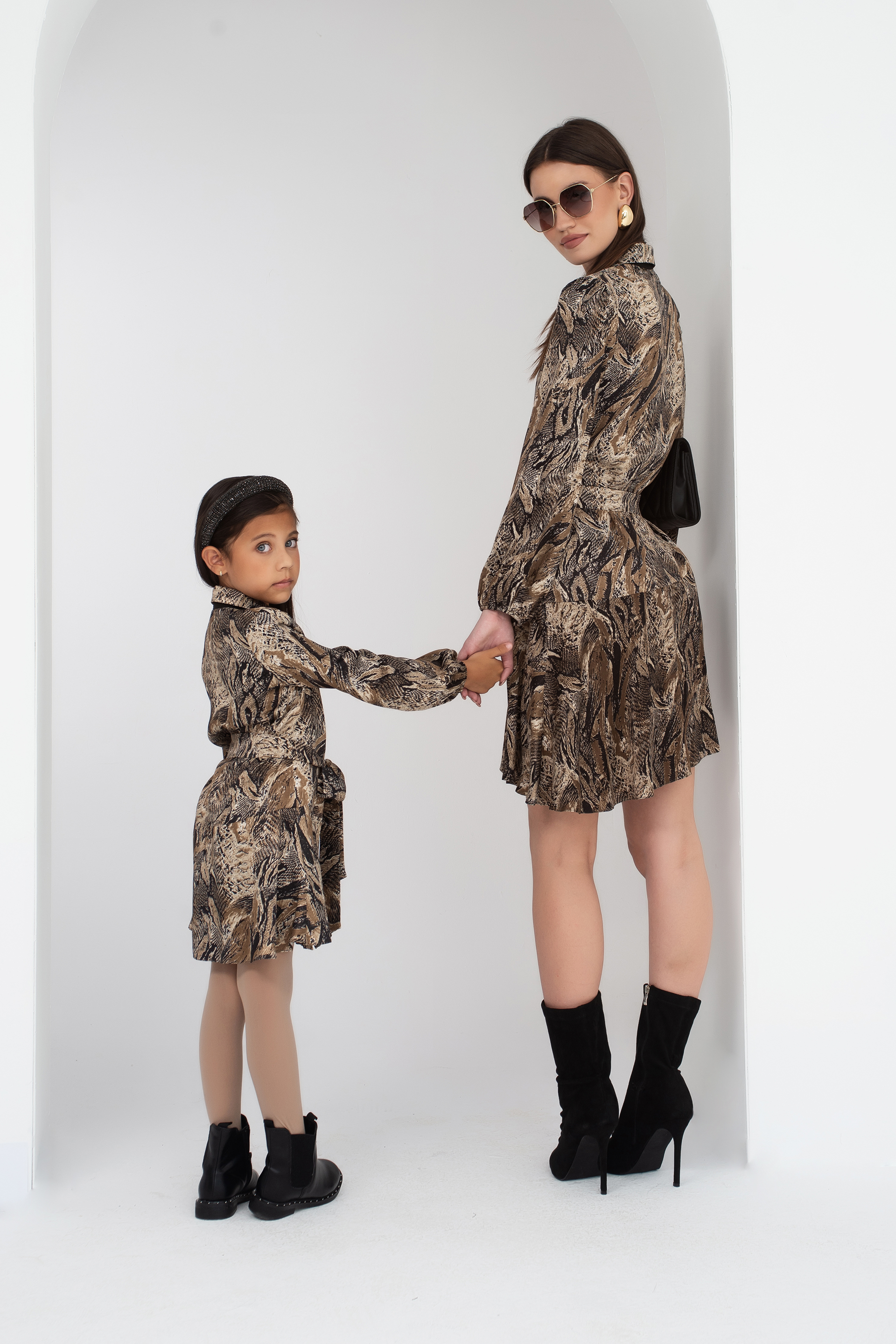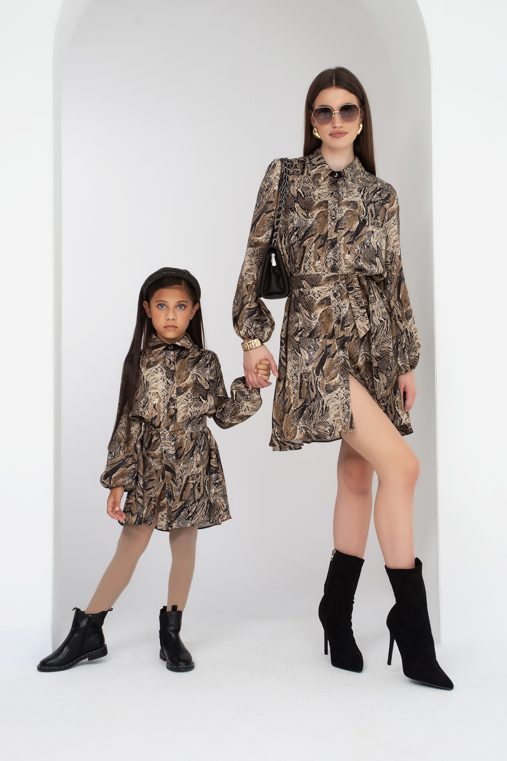 Описание: Елегантна рокля в контрастен десен със свободен силует, падащ до средата на бедрото, волан, дълъг ръкав с ластик и яка. Артикулът се закопчава с копчета до долу и колан в същия десен.