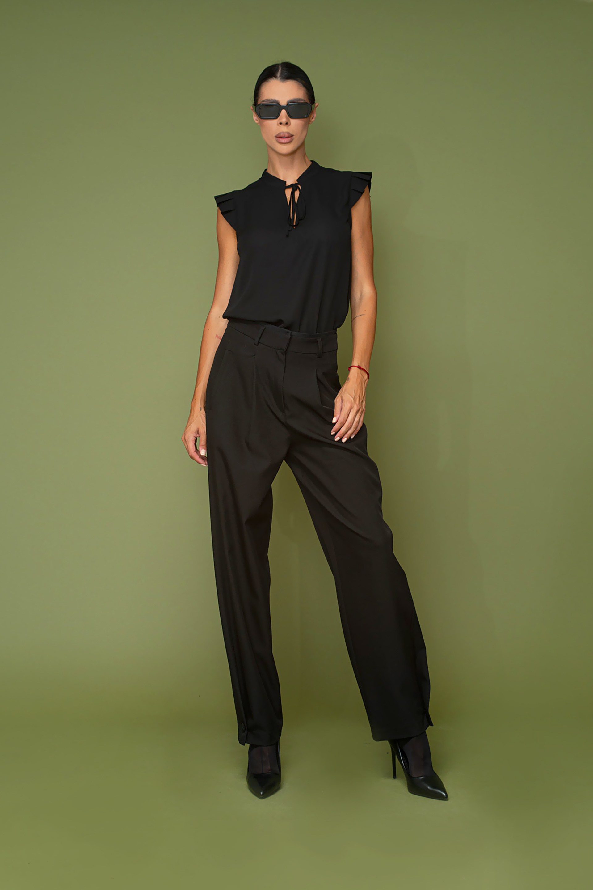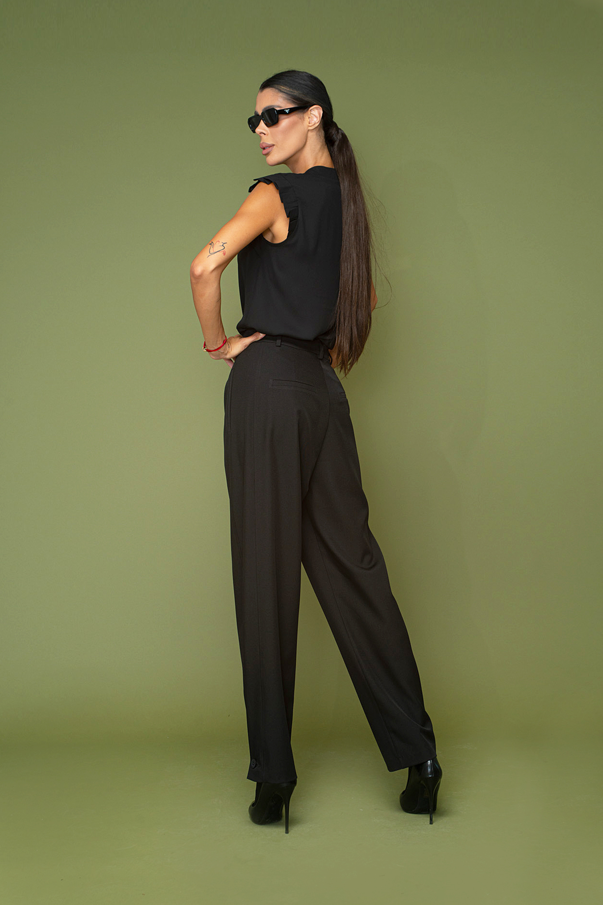 Описание: Панталон със свободна кройка и гайки за колан. Странични джобове и декоративни задни джобове с филетка. Предно закопчаване със скрито копче и цип.