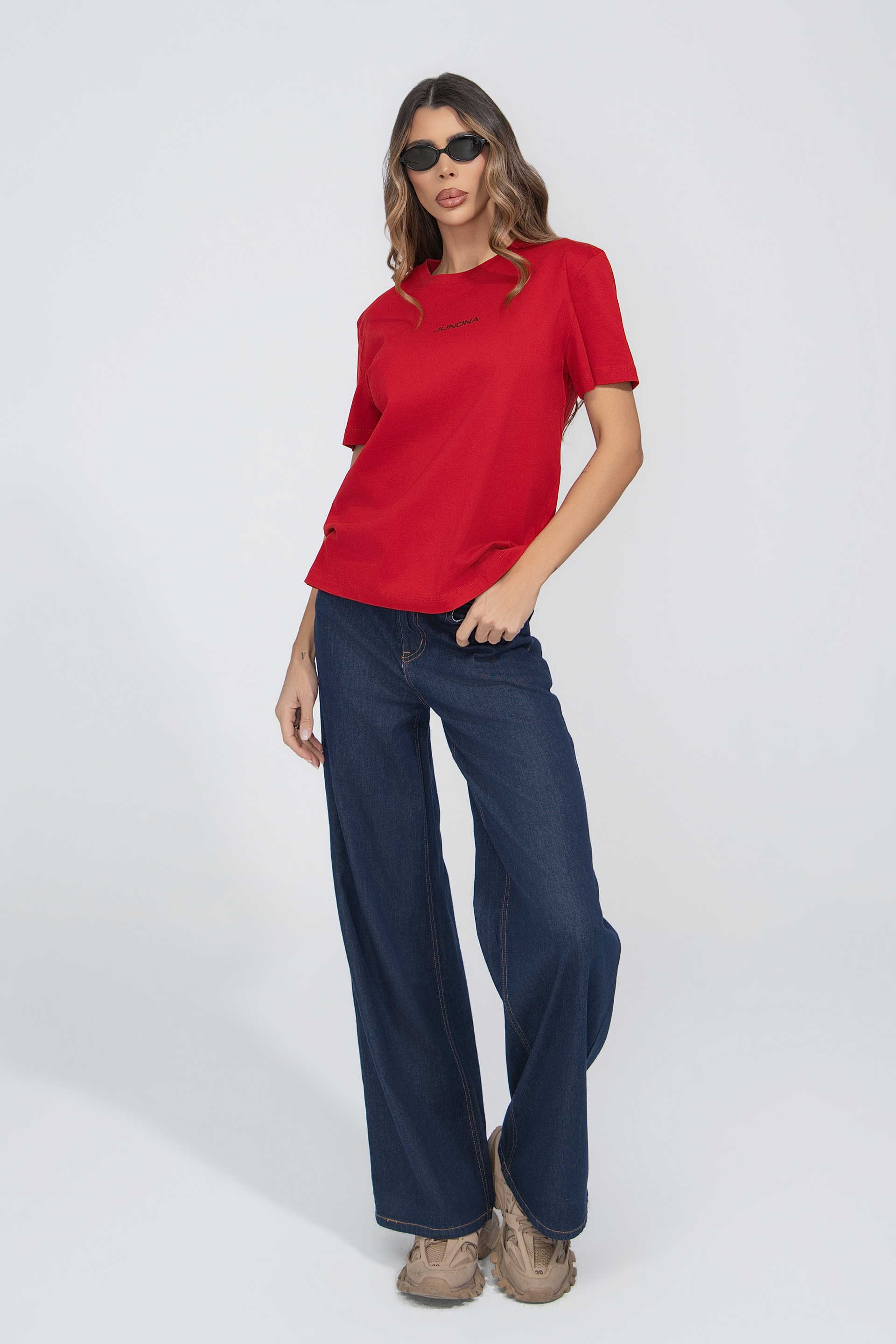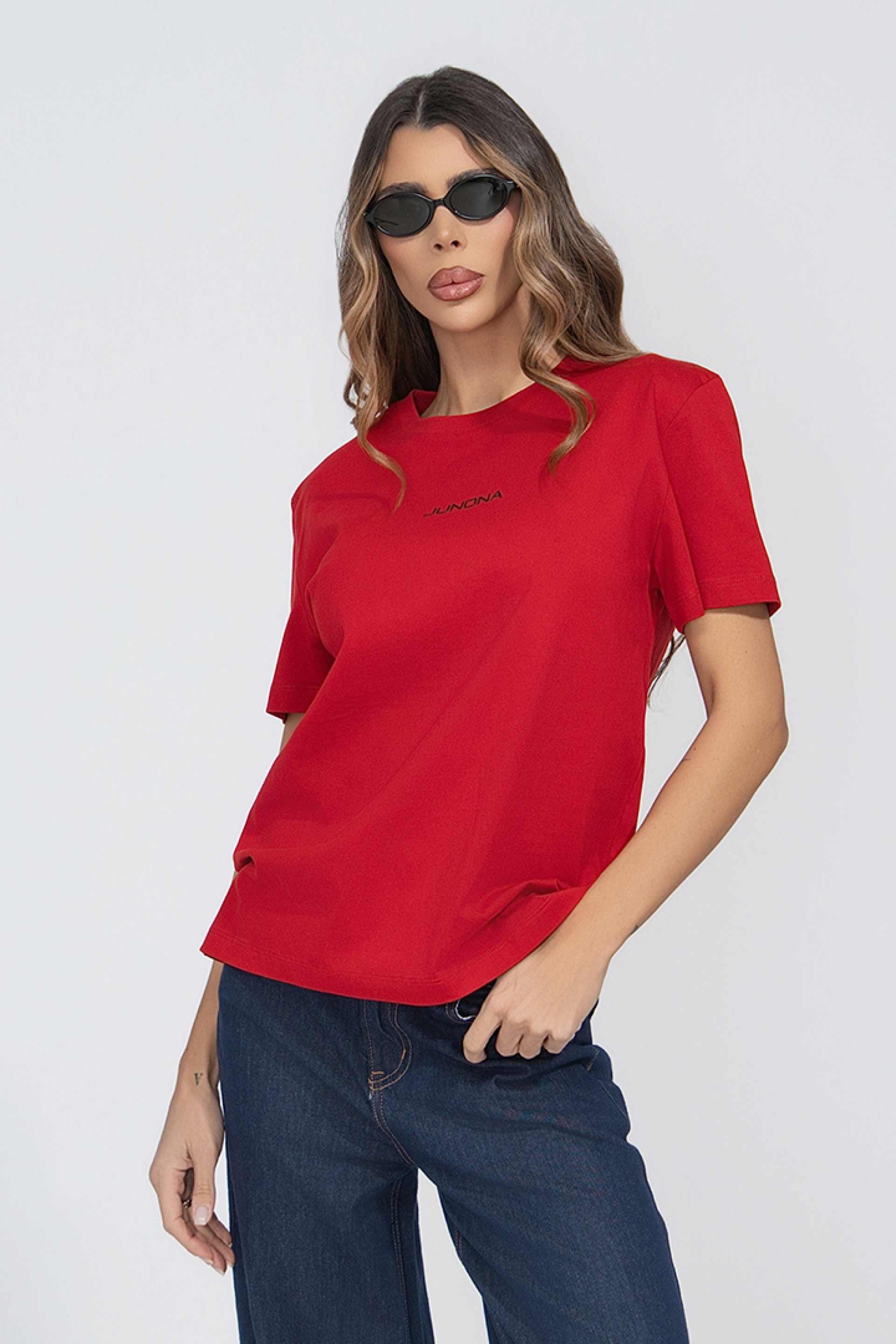 Tениска със свободен силует, изработена от памучна материя. С 3/4 ръкав и обла яка. Акцент надпис "Junona" в предната част.